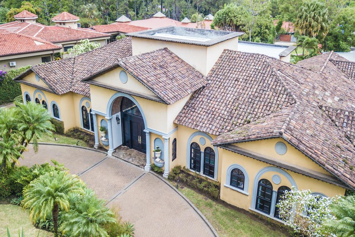 Ultra deluxe home for sale in Santa Ana, exclusive condominium, 900 sqm construction and 2.042 sqm land, 4 bedrooms, 5.5 bathrooms, US$1.695.000. Spectacular single-level residence full of exquisite details that makes it a unique architectural masterpiece: nothing’ spared when talking about its super deluxe finishes. Impressively elegant and gorgeous living room with vaulted ceilings, integrated to the entrance vestibule, the formal dining and an ample terrace which faces the wonderfully landscaped garden and the custom designed pool. Every-chef-desire gourmet kitchen with luxurious quartz countertops, large windows, specially designed for those who really enjoy cooking. It also has a side dining area and breakfast bar. There’s laundry area, full service quarters with kitchenette, garage for 4 vehicles plus additional outdoors parking space along the access entrance; several baths for visits. Spacious social area with vaulted ceilings, with beautiful hand-painted engravings. A special characteristic of the property is its multi-purpose area next to the pool, ample yet cozy featuring a TV room, BBQ, a full kitchen, bathrooms, chimney, bar and a bodega/wine cellar. It also has a second level for private sunbathing. The private/family area features a TV room and 4 dreamy bedrooms, each with ample walk-in closet and en-suite bath. This gorgeous, one-of-a-kind property is located within a very secure and enclosed residential with only with access and 24/7 security. Close to San José’s exclusive and elegant West area and its renowned shopping centers and supermarkets, private medical facilities and schools, a variety of financial entities, entertainment venues, and the route 27 to the Pacific coast.