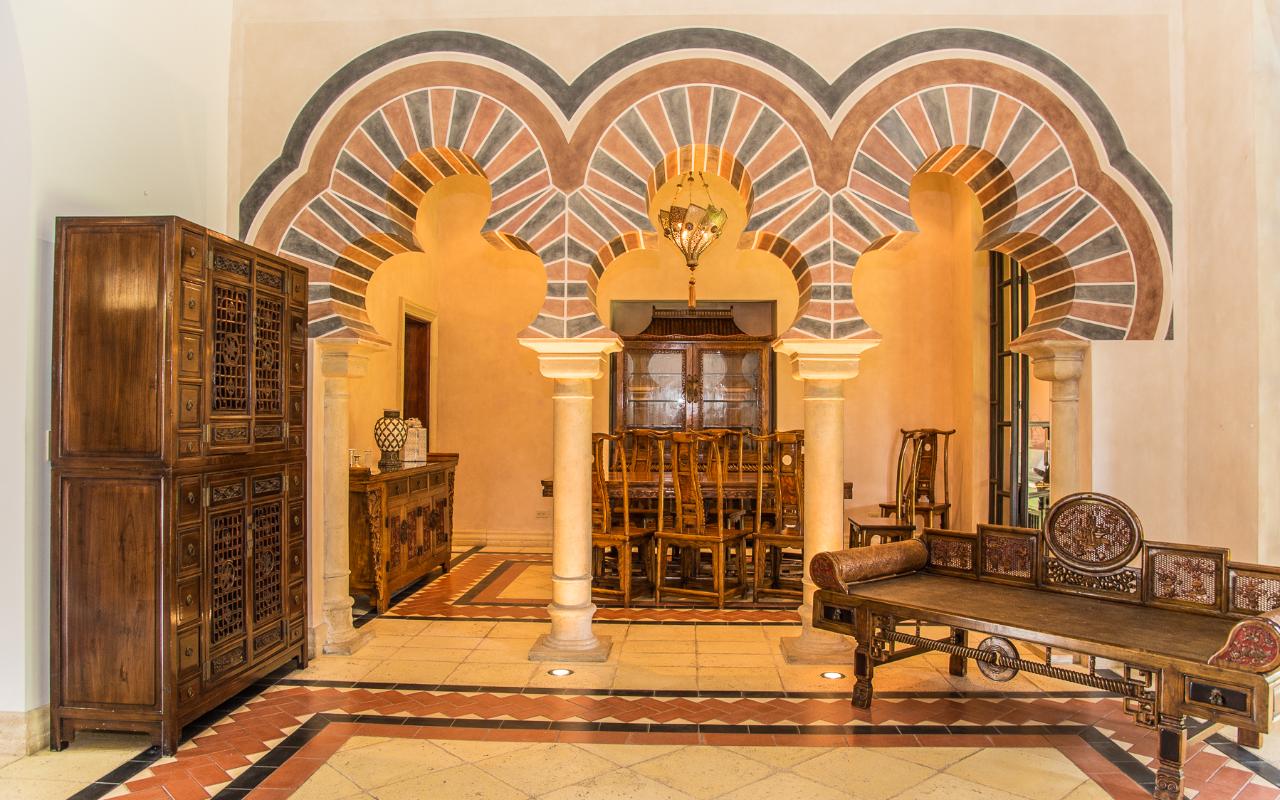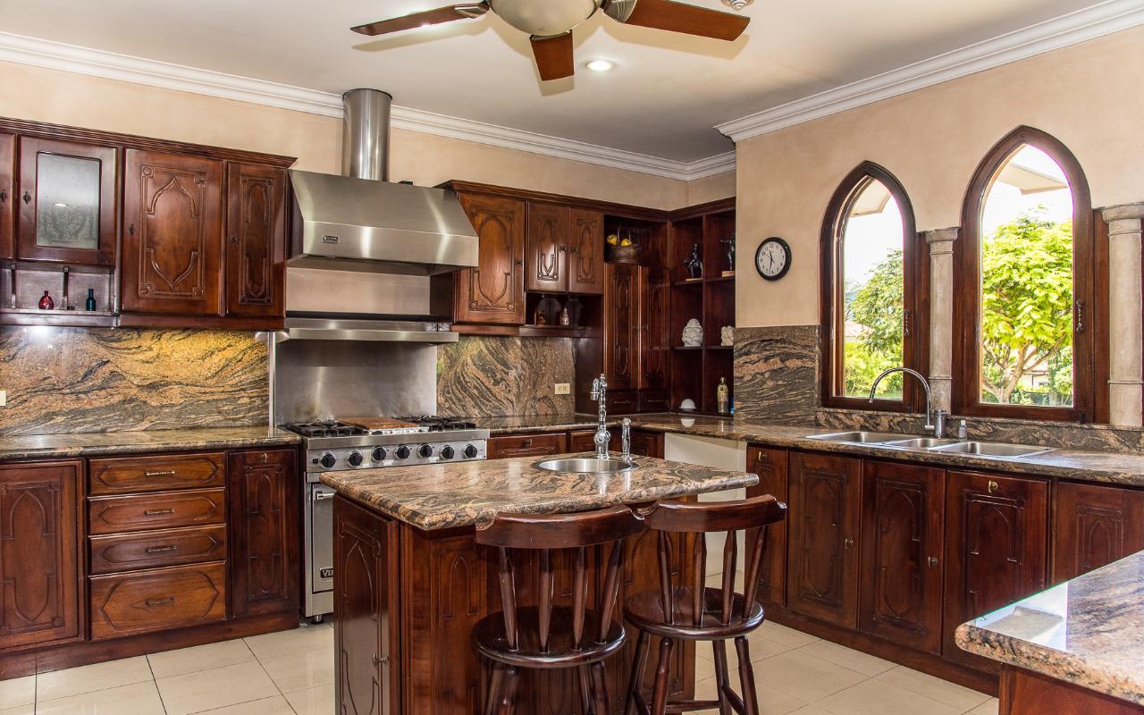 ID# 113979. Deluxe Spanish Alhambra-style home for sale in Santa Ana, exclusive condominium, 640 sqmt construction, 970 sqmt land, 4 bedrooms, 5.5 baths, US$975.000. Amazing residence with an impressive, fully European design created with the finest materials and finishes and high focus on detail, therefore an architectural masterpiece. Wonderful double height ceilings, coffered, vaulted, with wooden beams and beautiful candelabras. Decorative flooring throughout with unique elegant designs and characteristic Alhambra style designed walls and columns. Large windows with custom made wooden frames and glass doors privilege the entrance of abundant natural light, provide good ventilation and a great sense of amplitude, freshness and freedom. Spacious social area featuring an ample living, stylish formal dining, secondary dining and terrace with BBQ area facing the wonderful landscaped garden. Very spacious kitchen with top-to-floor fine hardwood cabinetry, granite countertops, center island and state-of-the-art stainless steel appliances. Four ample deluxe bedrooms with fine wood flooring, two of them with en-suite bath and walk-in closet, total of five full baths with fine built-in furniture. Marble stairs with beautiful wrought iron railings lead to a comfy, private TV room and an attic for storage. The house also has an office, half bath for visits, full service quarters, ample surrounding green areas and garage for 4-6 vehicles. The condominium has 24/7 security and offers a very tranquil and quiet environment. It has excellent location, close to renowned country clubs, supermarkets, shopping malls, restaurants, entertainment venues, route 27, etc.