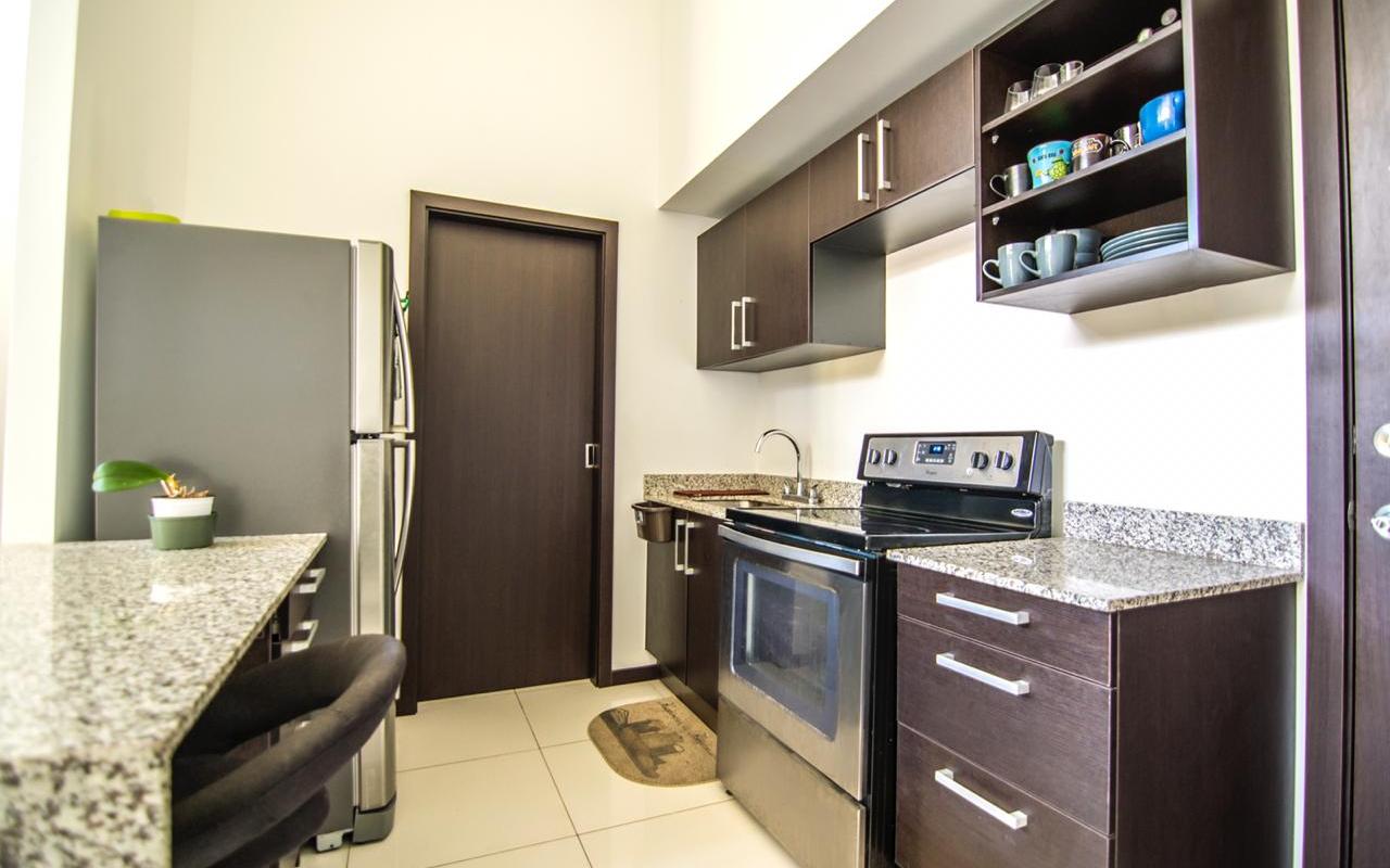 ID# 114388. Amazing contemporary penthouse with panoramic views for sale in Santa Ana, 86 sqm, 2 bedrooms, 2 bathrooms, US$145.000 (currently with a bank debt). Beautiful apartment, fresh and bright with a very modern design where high ceilings and large windows provide abundant natural light and wonderful panoramic views. Open concept layout in its social area consisting of living, dining and kitchen with breakfast bar and preview for microwave oven and hood; living area facing a nice balcony with views. Laundry room with washer/dryer. The private area has 2 comfortable bedrooms, both with walk-in closet and bath. The unit includes an incorporated water heater and preview for mezzanine. Parking space for 2 vehicles (6.4 sqm). The condominium has 24/7 security. Amenities: semi-olympic pool and normal pool (both tempered), gym, BBQ rancho, playground, green areas, walking trails, parking for visitors. Maintenance fee is US$120/mo. Excellent location, close to supermarkets, shopping centers, banks, schools, restaurants, entertainment venues, the route 27, etc.