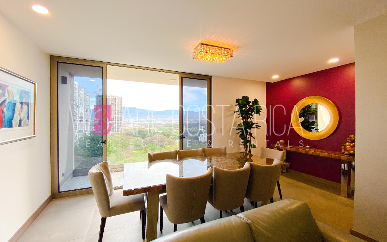 ID# 114508. Contemporary totally furnished apartment for sale in Rohrmoser, Hyde Park Nunciatura condominium tower, 168 sqm construction, 3 bedrooms, 2.5 bathrooms, beautiful views, excellent price of US$550.000 (US$360/mo maintenance fee). Located on a 10th floor, this apartment features a perfect open distribution with living/dining room and kitchen equipped with Electrolux deluxe appliances. This whole area enjoys a marvelous panoramic mountain and La Sabana Park view. It provides a great spaciousness feeling without losing its cozy homey vibe. The master bedroom has a floor-to-top windows with park views, a walk-in closet a full bath with deluxe finishes. There are two ample secondary bedrooms with closets and they share a full bath. The apartment also has a full service room and half guest bath. Garage for 2 vehicles and 3 bodegas for storage. The condominium is very secure (24/7 surveillance). Amenities: pool, gym, lounge, equipped family/event hall and parking for visitors. Excellent location, close to supermarkets, shopping malls, banks, schools, medical centers, restaurants, entertainment venues, downtown San José and more.