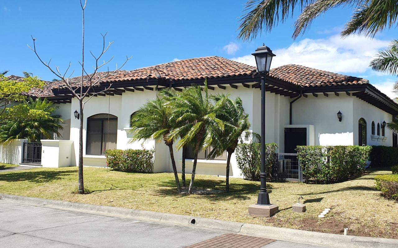 ID# 115325. Beautiful Colonial-style home for sale in Lindora, Vista Verde condominium, 353 sqmt construction, 630 sqmt land, 4 bedrooms, 3.5 baths, US$619.000. Single-level house with Colonial architecture and fine finishes. Large social area surrounded by floor-to-ceiling windows and sliding doors that provide vast natural light and give access to the terrace and garden. Independent kitchen, it has fine hardwood cabinet and breakfast nook. There is half guest bath, laundry room with patio, bodega and full service room. The private wing of the house consists of 4 bedrooms and 3 baths. The master bedroom has a large walk-in closet and an en-suite bath with double washbasin and tub. One secondary bedroom has private bath and a smaller walk-in closet. The other 2 secondary bedrooms have closets and they share a full bath. The condominium offers 24/7 security and amenities such as club house, pool, BBQ rancho, playground, and green areas.
