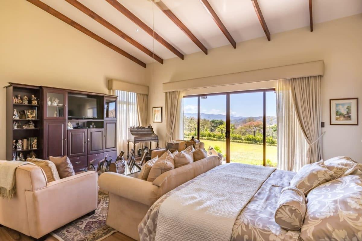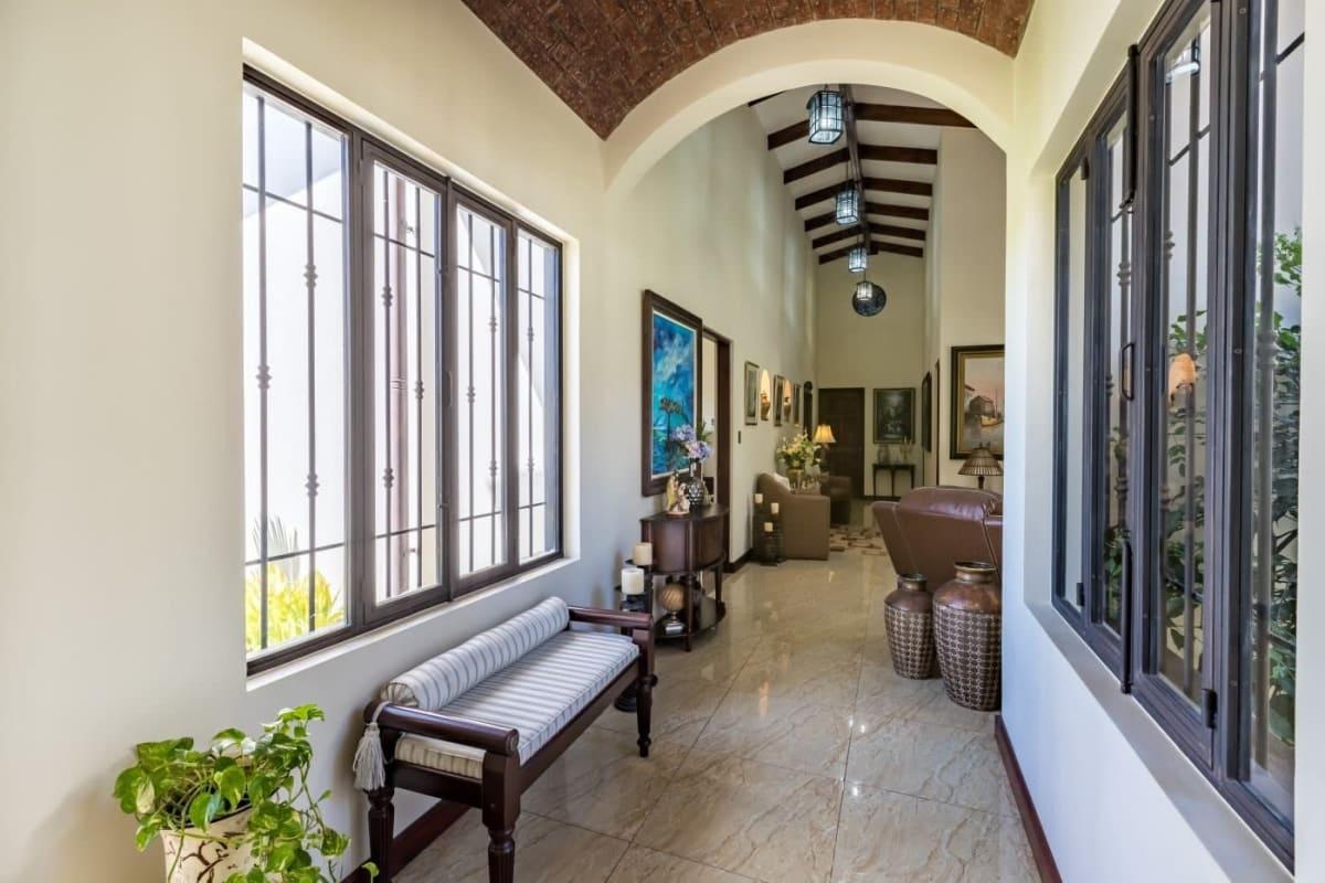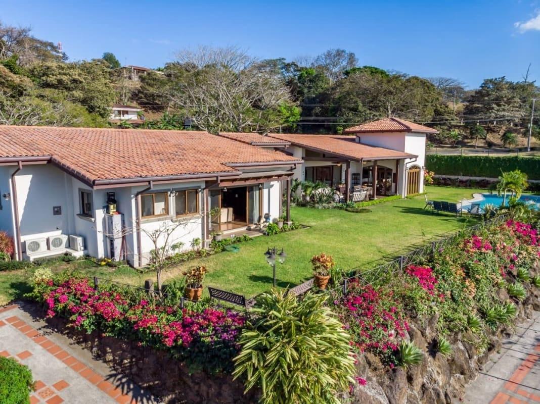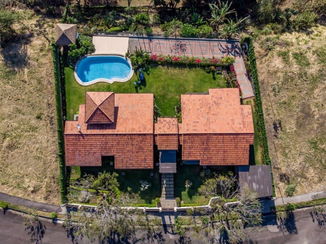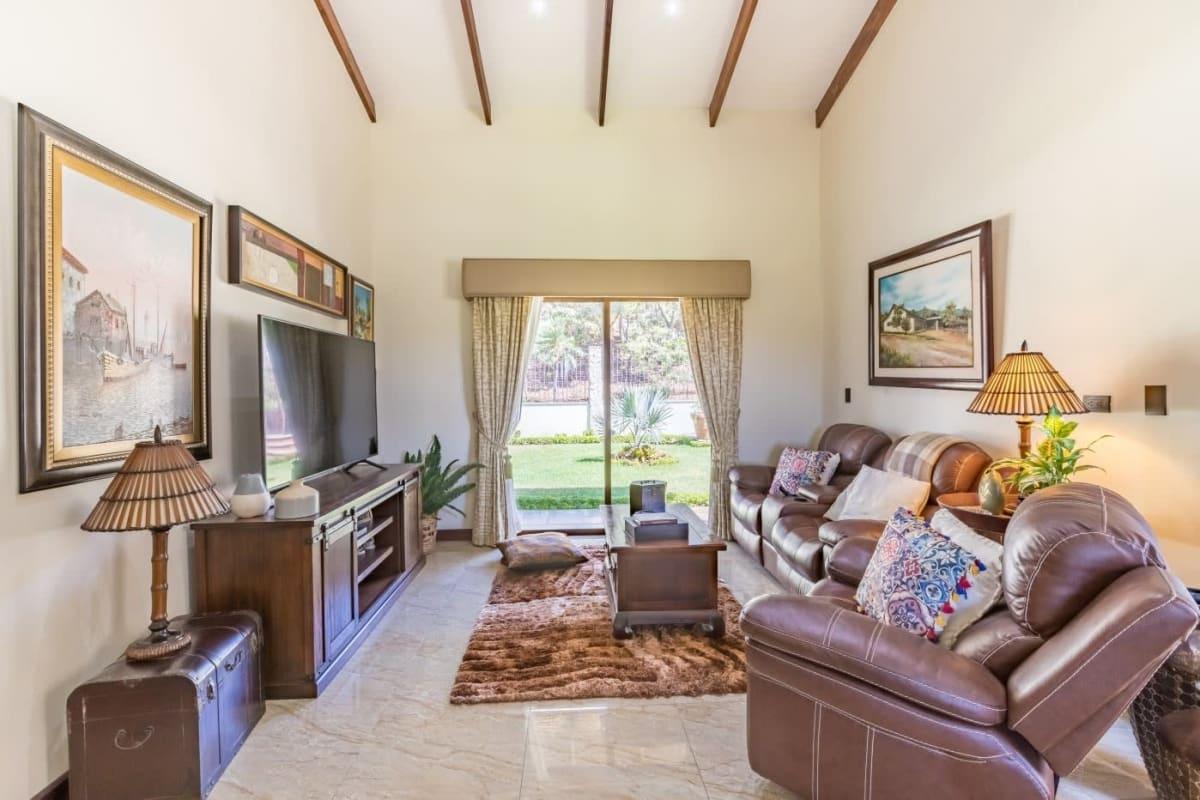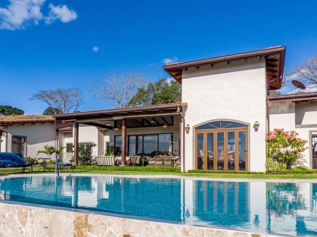 ID# 115329. Casa de lujo de estilo colonial en venta en La Guácima, condominio Caballo Real, construcción de 550 m2, terreno de 2.300 m2, 3 dormitorios, 3.5 baños, US$1.075.000. Esta es una casa de un solo nivel con arquitectura de inspiración española, un gran jardín paisajista, piscina privada e impresionantes vistas panorámicas. El espacio social tiene vista directa a las montañas, tiene techos altos y ventanas de piso a techo. La sala de estar y el comedor se conectan a la terraza y al área al aire libre con piscina y hermoso patio trasero. Cocina separada grande con mostradores amplios y una enorme isla central con desayunador incorporado. Hay una sala de TV muy cómoda y medio baño de visitas. Área de servicio con cuarto de lavado y cuarto de servicio. El ala privada de casa cuenta con 3 dormitorios y 3 baños completos. El dormitorio principal es muy amplio y tiene una pequeña sala de estar, techos altos, vistas y acceso al jardín y un maravilloso baño en suite con doble lavabo. Las habitaciones secundarias tienen techos altos y vigas expuestas decorativas de madera y sus baños son igualmente hermosos con detalles únicos en piedra rústica. La casa tiene un garaje cerrado para 2 vehículos. El residencial ofrece seguridad 24/7, y espacios comunes con casa club, rancho de BBQ, parque infantil, hermosas áreas verdes y vistas panorámicas.