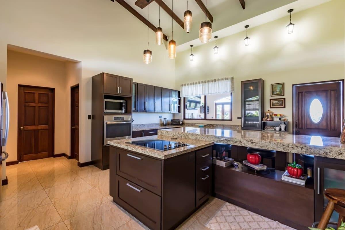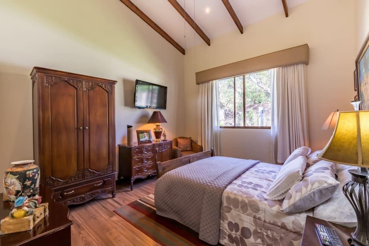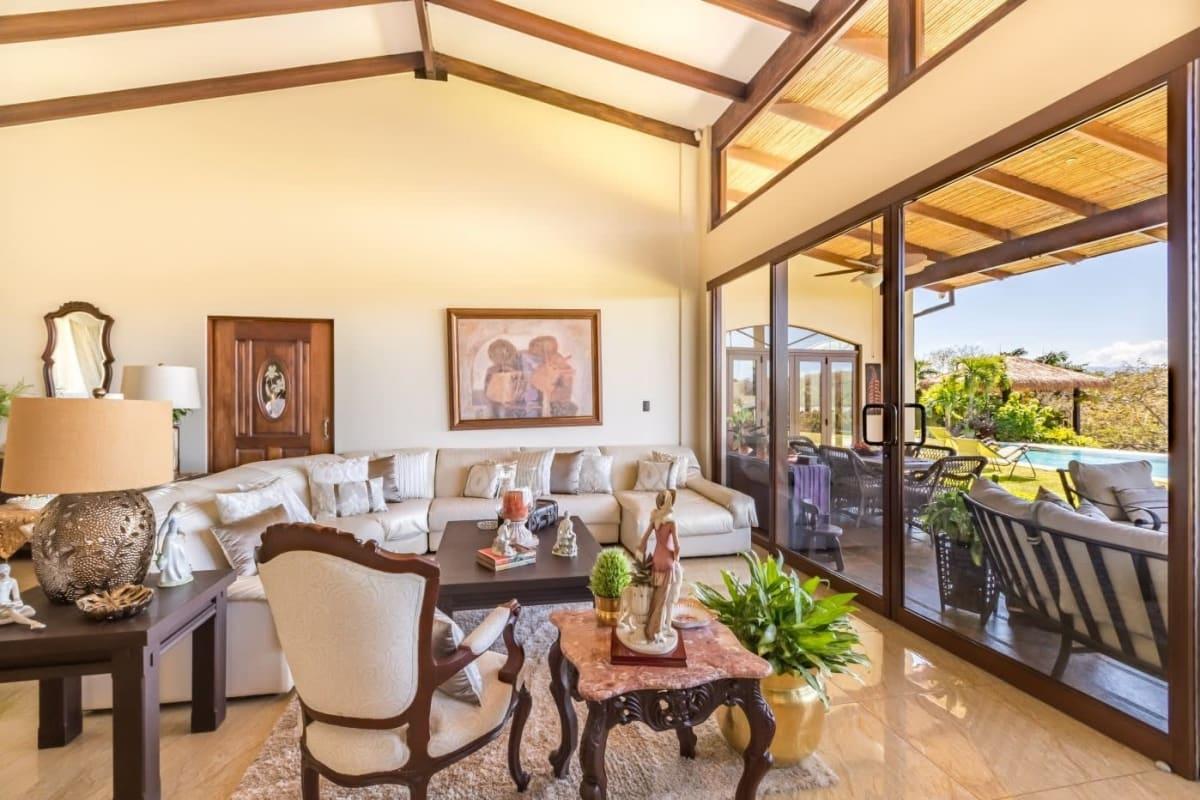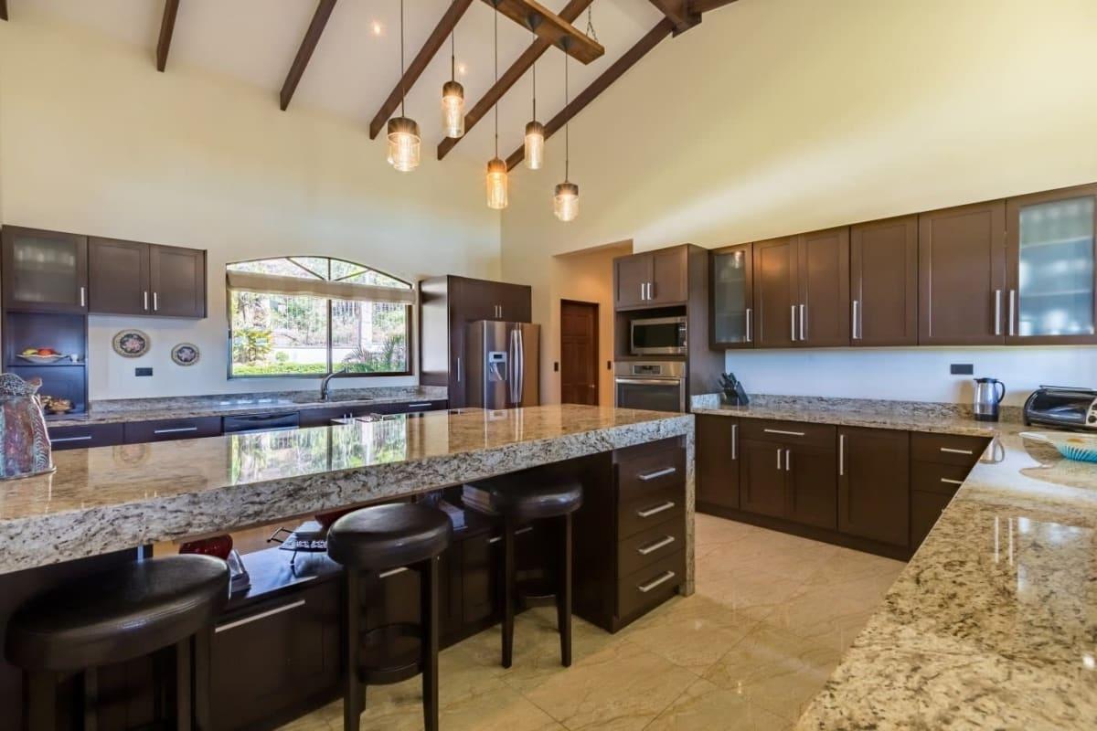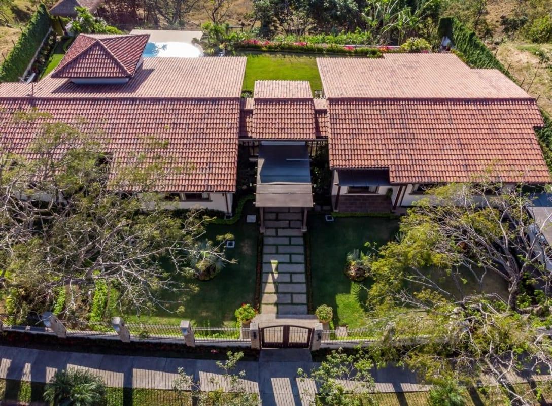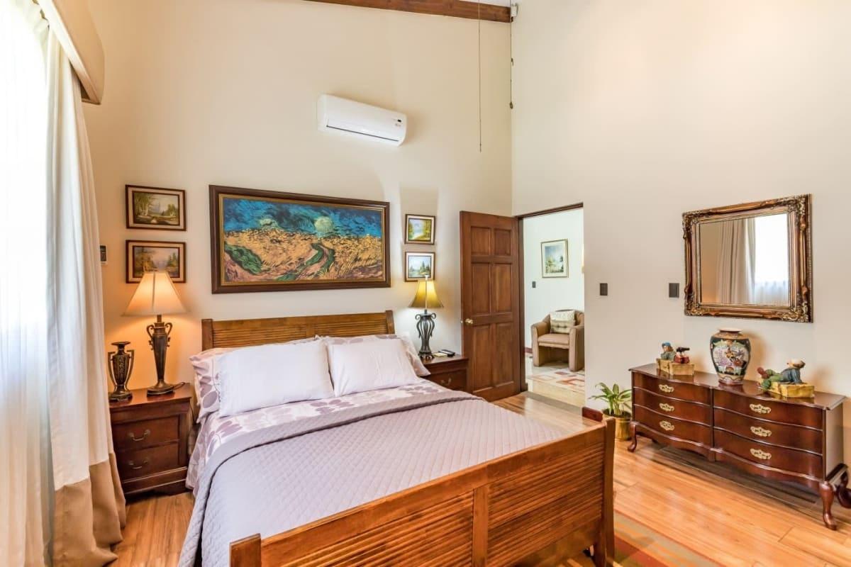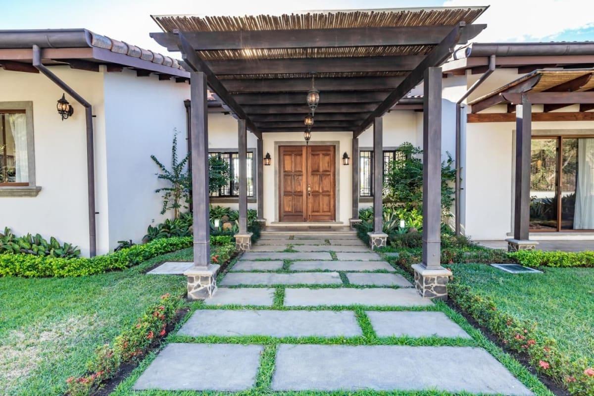 ID# 115329. Casa de lujo de estilo colonial en venta en La Guácima, condominio Caballo Real, construcción de 550 m2, terreno de 2.300 m2, 3 dormitorios, 3.5 baños, US$1.075.000. Esta es una casa de un solo nivel con arquitectura de inspiración española, un gran jardín paisajista, piscina privada e impresionantes vistas panorámicas. El espacio social tiene vista directa a las montañas, tiene techos altos y ventanas de piso a techo. La sala de estar y el comedor se conectan a la terraza y al área al aire libre con piscina y hermoso patio trasero. Cocina separada grande con mostradores amplios y una enorme isla central con desayunador incorporado. Hay una sala de TV muy cómoda y medio baño de visitas. Área de servicio con cuarto de lavado y cuarto de servicio. El ala privada de casa cuenta con 3 dormitorios y 3 baños completos. El dormitorio principal es muy amplio y tiene una pequeña sala de estar, techos altos, vistas y acceso al jardín y un maravilloso baño en suite con doble lavabo. Las habitaciones secundarias tienen techos altos y vigas expuestas decorativas de madera y sus baños son igualmente hermosos con detalles únicos en piedra rústica. La casa tiene un garaje cerrado para 2 vehículos. El residencial ofrece seguridad 24/7, y espacios comunes con casa club, rancho de BBQ, parque infantil, hermosas áreas verdes y vistas panorámicas.