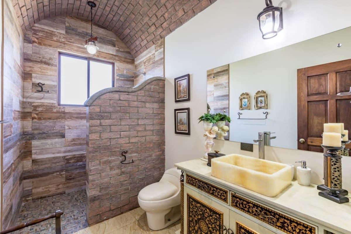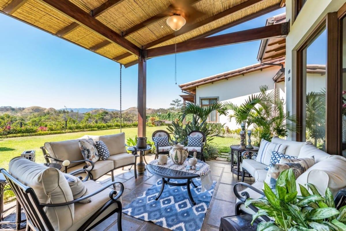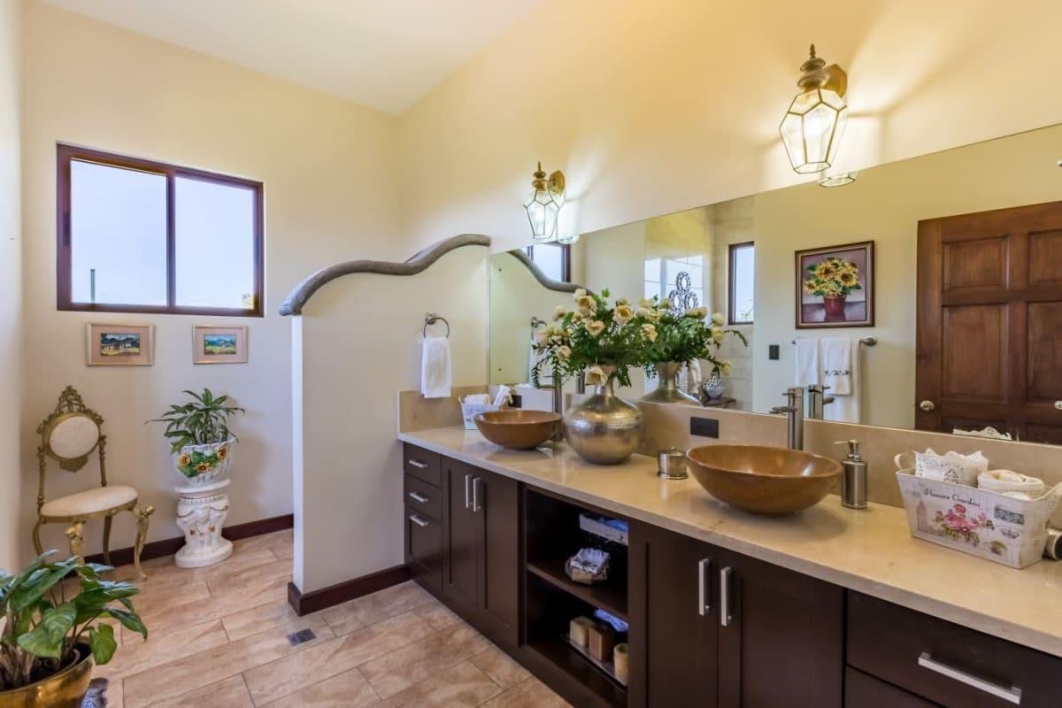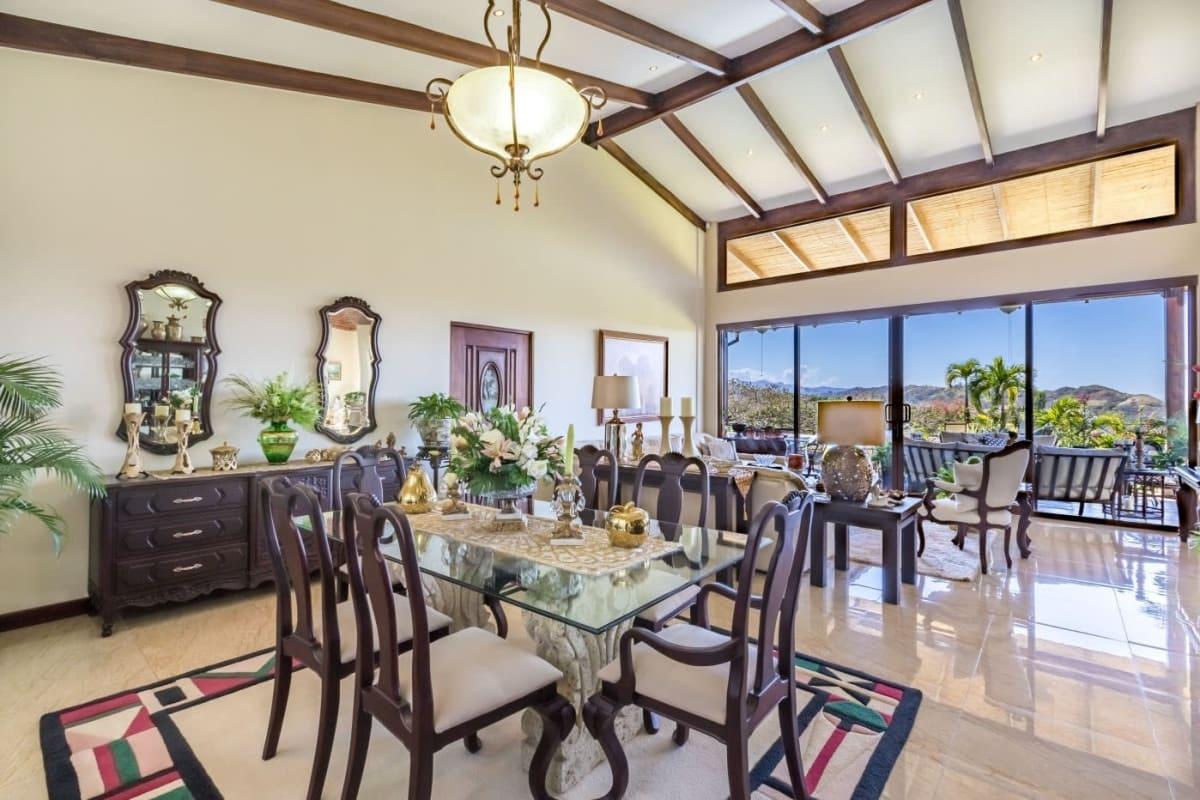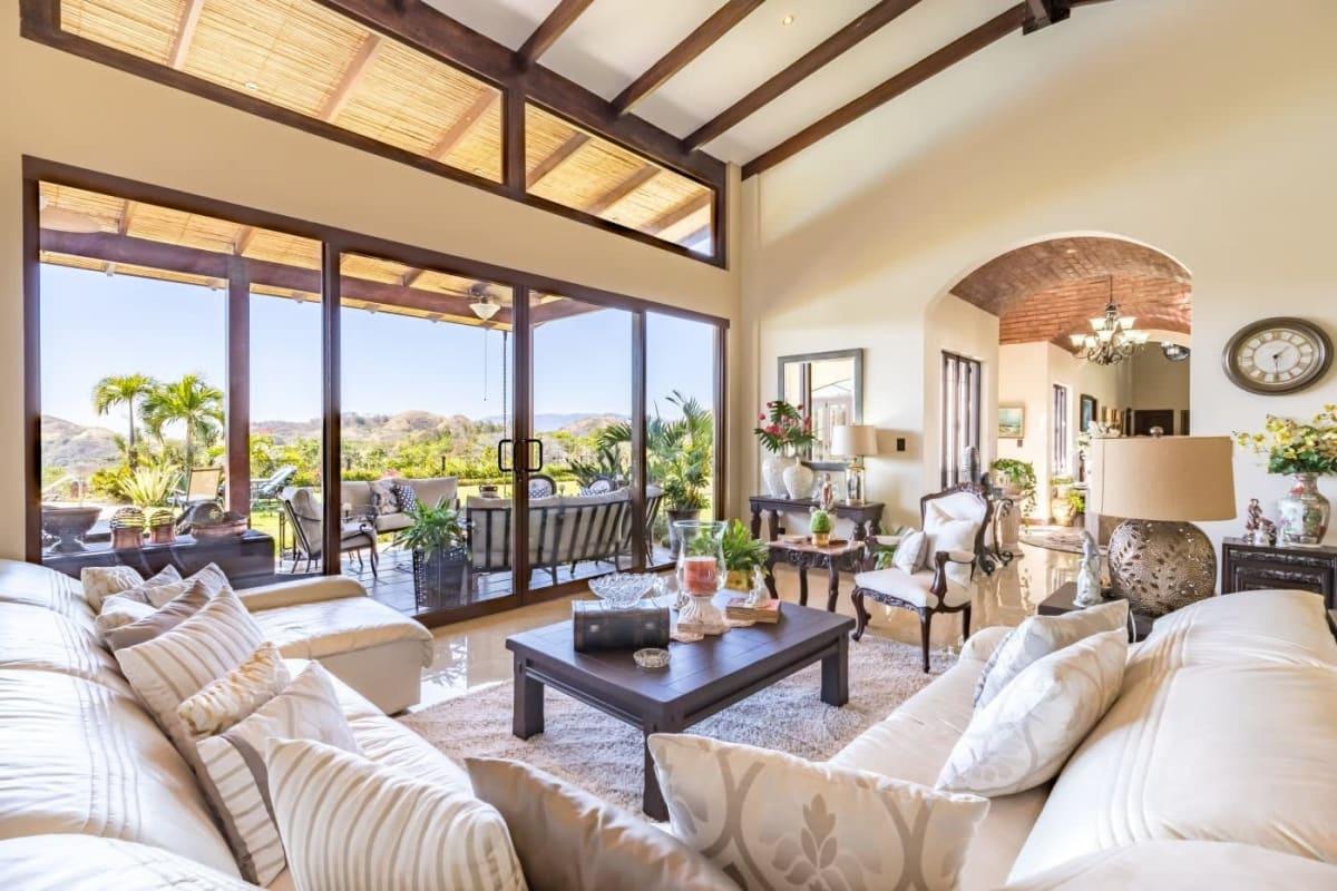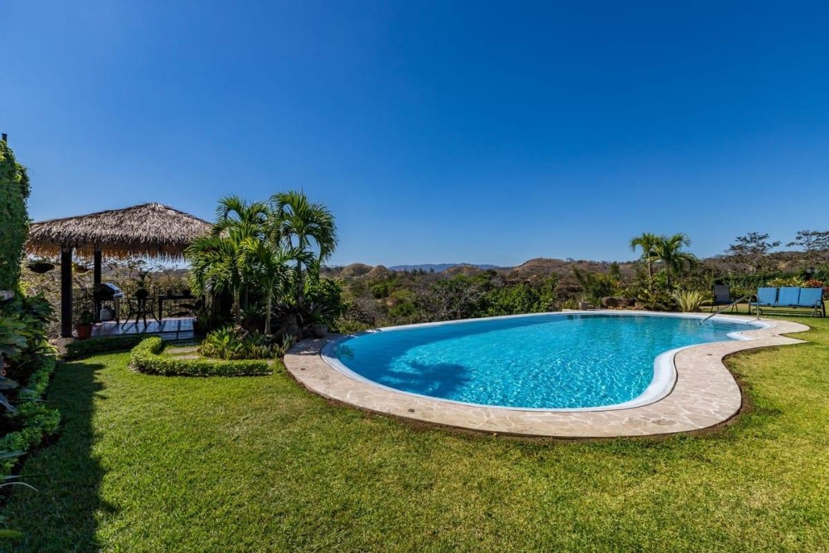ID# 115329. Casa de lujo de estilo colonial en venta en La Guácima, condominio Caballo Real, construcción de 550 m2, terreno de 2.300 m2, 3 dormitorios, 3.5 baños, US$1.075.000. Esta es una casa de un solo nivel con arquitectura de inspiración española, un gran jardín paisajista, piscina privada e impresionantes vistas panorámicas. El espacio social tiene vista directa a las montañas, tiene techos altos y ventanas de piso a techo. La sala de estar y el comedor se conectan a la terraza y al área al aire libre con piscina y hermoso patio trasero. Cocina separada grande con mostradores amplios y una enorme isla central con desayunador incorporado. Hay una sala de TV muy cómoda y medio baño de visitas. Área de servicio con cuarto de lavado y cuarto de servicio. El ala privada de casa cuenta con 3 dormitorios y 3 baños completos. El dormitorio principal es muy amplio y tiene una pequeña sala de estar, techos altos, vistas y acceso al jardín y un maravilloso baño en suite con doble lavabo. Las habitaciones secundarias tienen techos altos y vigas expuestas decorativas de madera y sus baños son igualmente hermosos con detalles únicos en piedra rústica. La casa tiene un garaje cerrado para 2 vehículos. El residencial ofrece seguridad 24/7, y espacios comunes con casa club, rancho de BBQ, parque infantil, hermosas áreas verdes y vistas panorámicas.