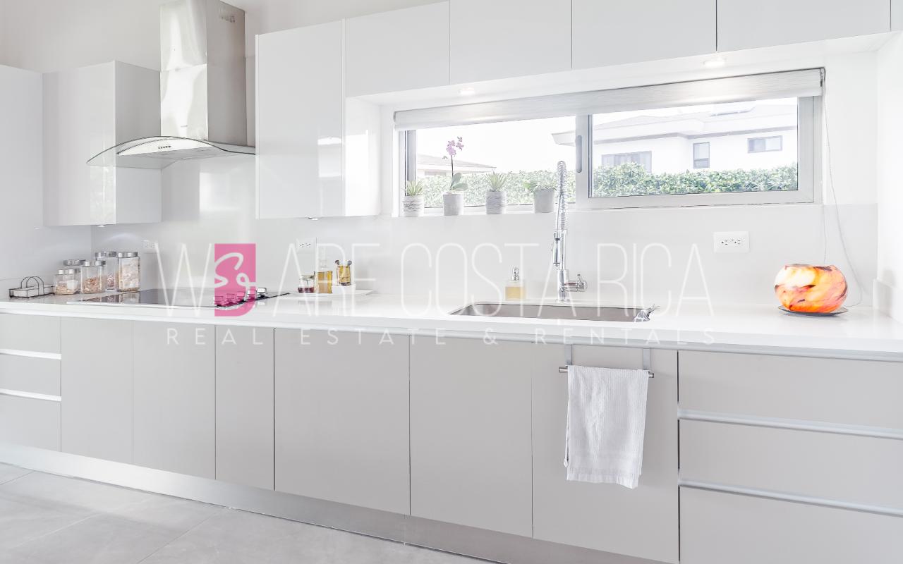 ID# 115355. Stunning contemporary home for sale in Alajuela, Hacienda Espinal, 290 sqmt construction, 780 sqmt land, 3 bedrooms, 2 baths, US$525.000. Single-level home featuring a modern design with open-concept distribution, floor-to-ceiling glass, beautifully landscaped gardens, and has an excellent location within the condominium. Its social area is filled with natural light, and it connects to the terrace. Living, dining and integrated kitchen all combine within an ample space that has double-height ceilings and refreshing garden views. The kitchen boast a modern design with a huge center island/breakfast nook, wooden details and white, clean countertops. The terrace is very large and opens completely to the back garden. It has a bar area to one side and a sitting area to the other. The private area of the house is separated from the rest of the house, at its left side, for more peace and quietness. There, the master bedroom is very luminous and fresh, and with access to the garden. The master bath has a well-sized walk-in closet. Then, 2 secondary bedrooms have closets and share a separated full bath. The house comes with a close garage for 2 vehicles. This exclusive gated community offers 24/7 security with highly controlled access. Among its amenities one can find club house, pool, basketball and tennis courts, soccer field, skate park, sculpture park and green areas. It is located close to renowned private schools like the Country Day School, and has easy access to the highway 27 (San José-Pacific coast).