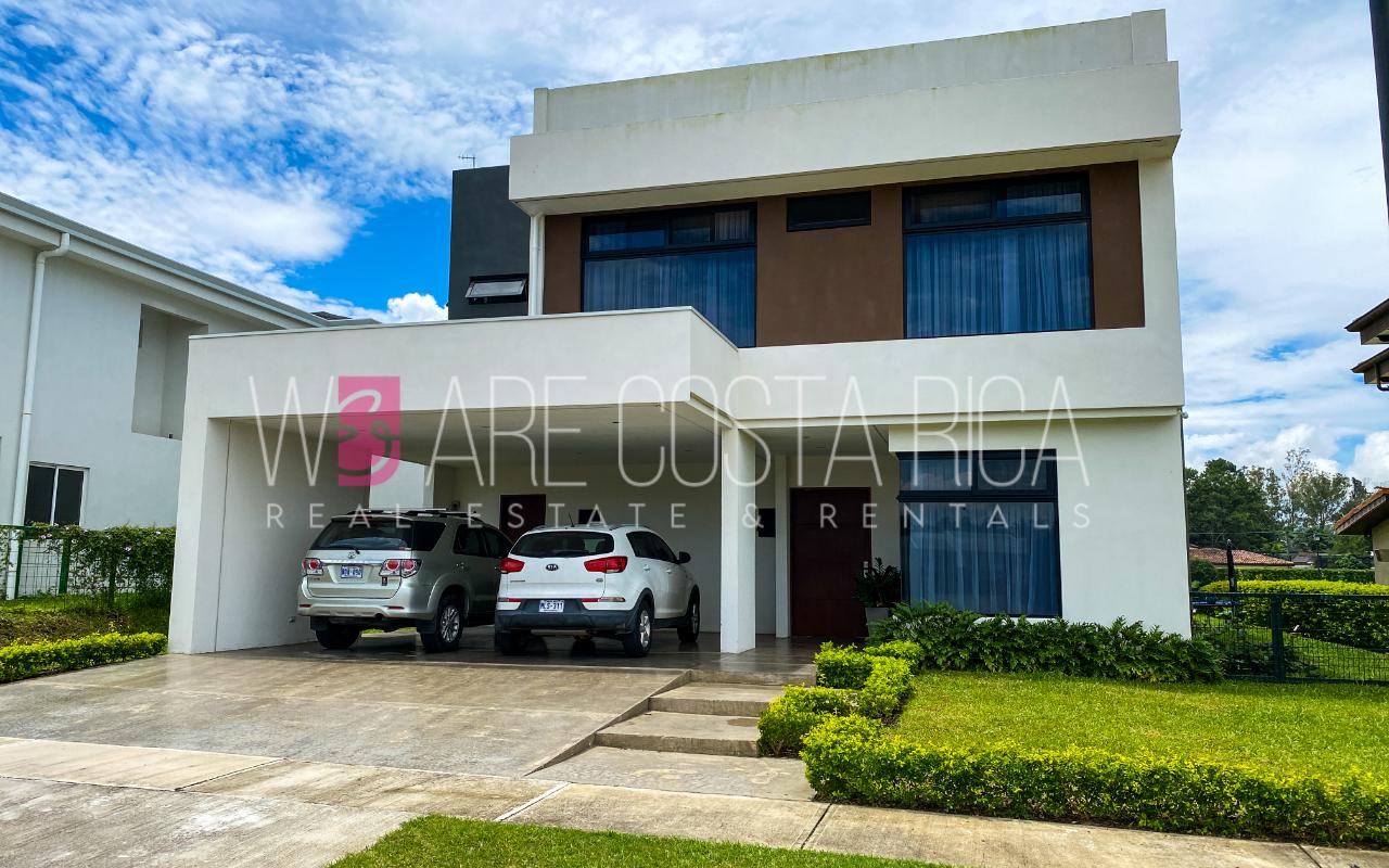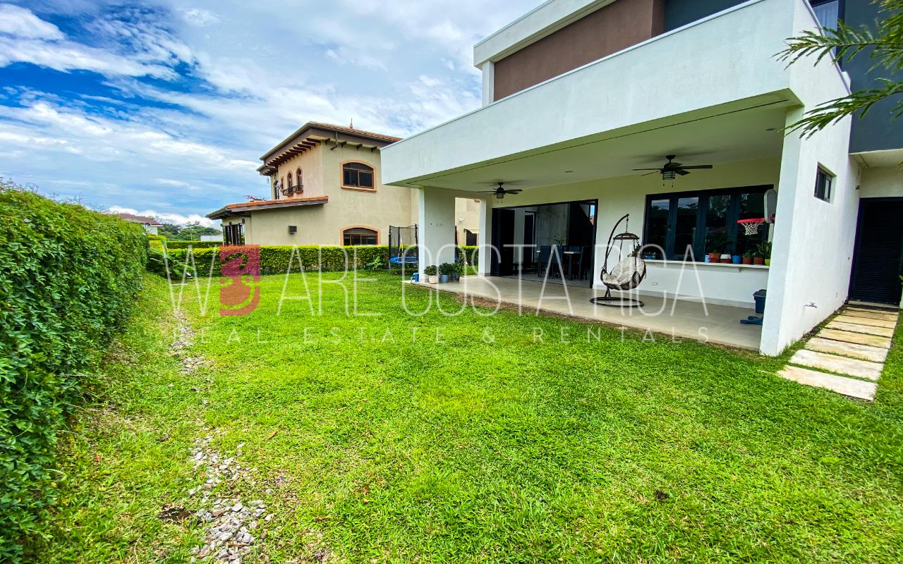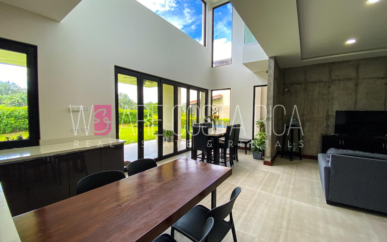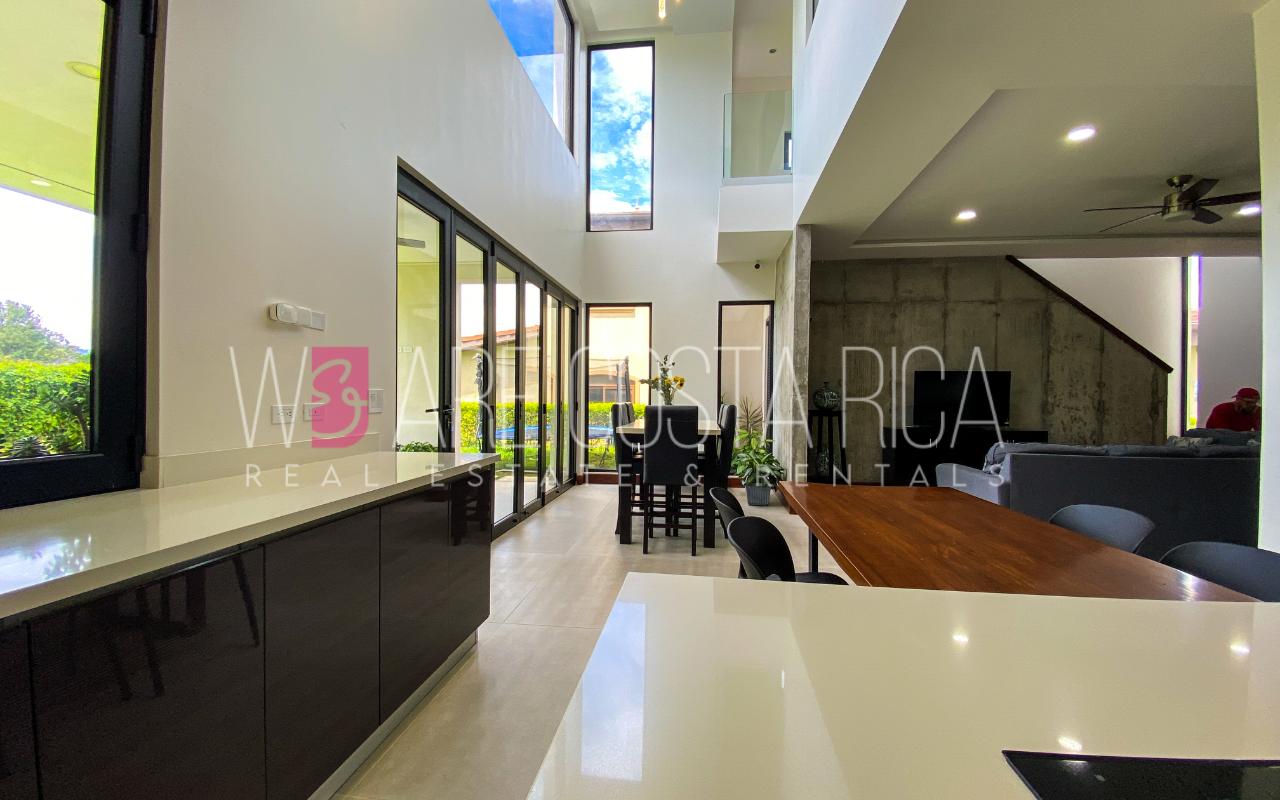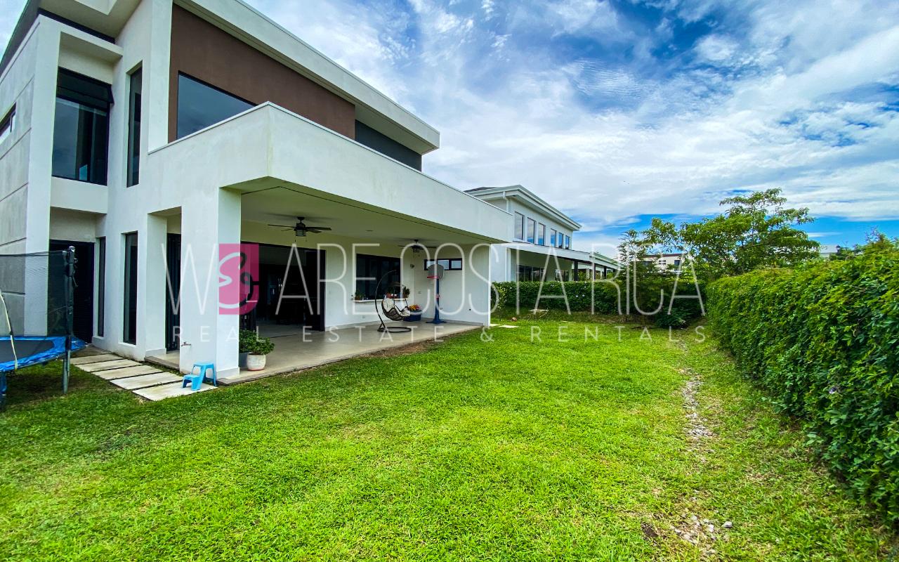ID# 115376. Contemporary house for sale or rent in La Guácima, Hacienda Los Reyes, 340 sqmt construction, 531 sqmt land, 4 bedrooms, 3 baths, US$499.000 or US$3.500/mo. Beautiful house with a modern architectural design, high ceilings, lots of natural light and fine finishes throughout. The first level features an open-concept living, dining and integrated kitchen. All floors are porcelain. The kitchen has an American style with an ovens’ tower, wine cellar and impeccable white quartz countertops. It also has center island with dinette area. The social space connects through glass folding doors to the terrace and backyard. The first floor also has a home office, ample laundry room, full service room and garage upfront for 2 vehicles. Beautiful almond-tree wood stairs lead to the private area of the house. There is a TV room, 2 secondary bedrooms that share a full bath, and a master bedroom with en-suite bath and walk-in closet. High-tech features: water-saving sanitaryware, smart lighting system (Lutron) controlled by cellphone, internal and external cameras, automatic irrigation system, and solar panels. This property is located in Hacienda Los Reyes, an exclusive residential community that offers 24/7 patrolled security and amazing amenities like its one-of-a-kind golf course, club house, 6 tennis courts, gym, swimming pools. It is strategically located close to a variety of urban facilities, the international airport and private schools.