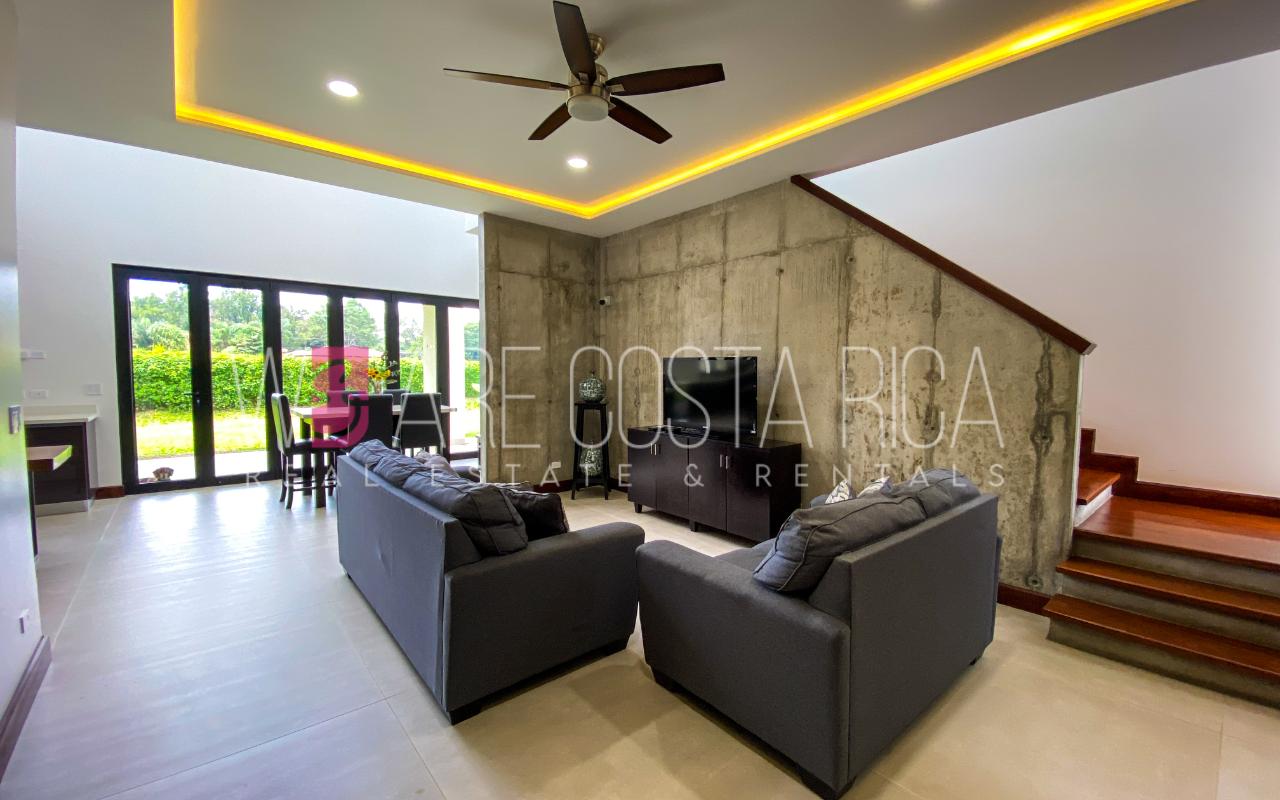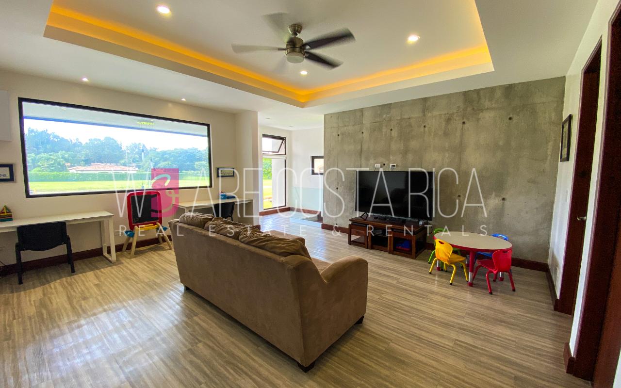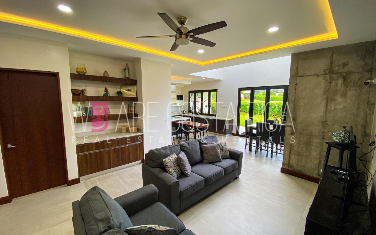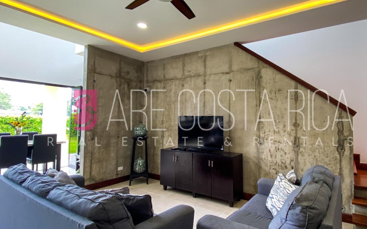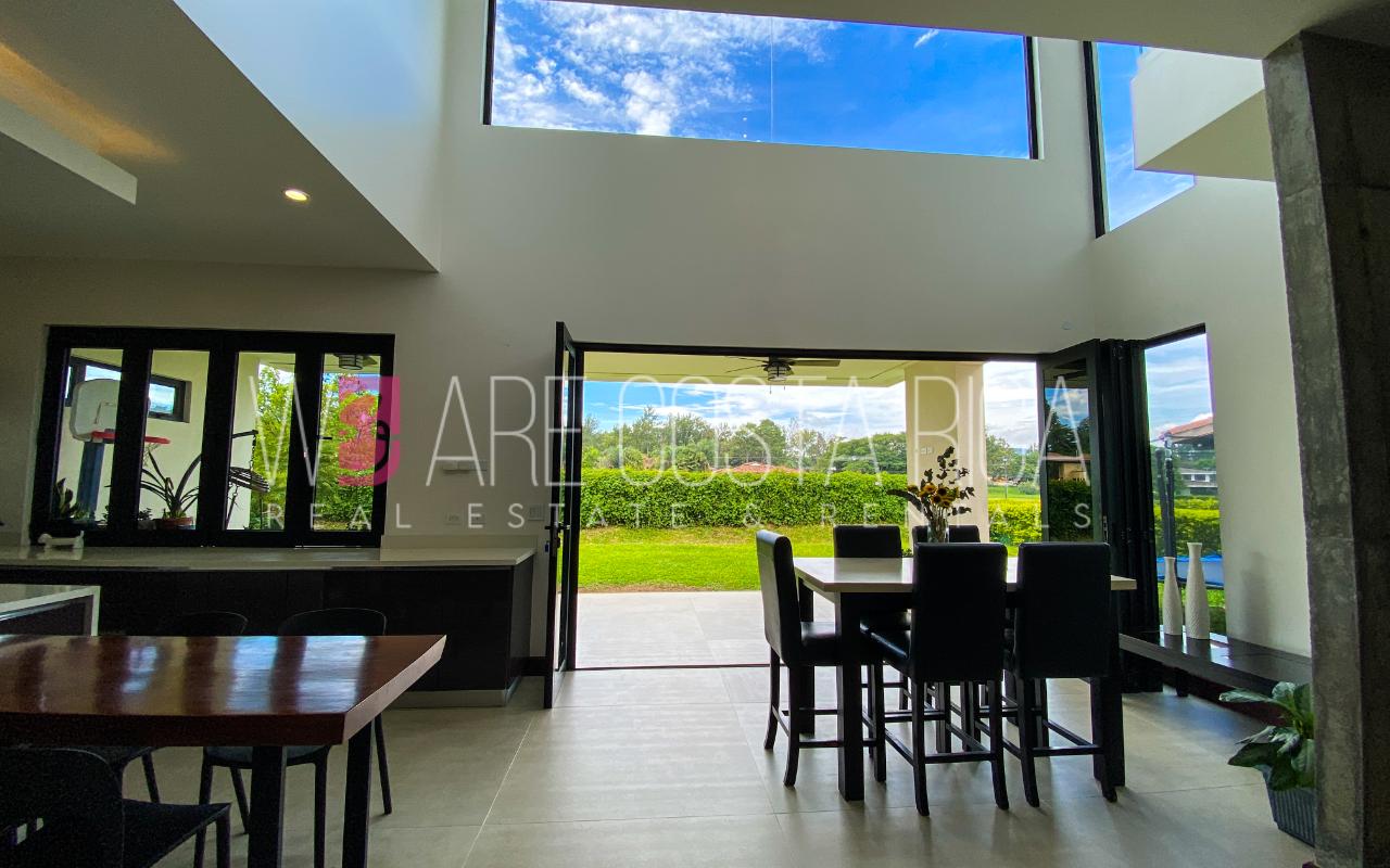 ID# 115376. Contemporary house for sale or rent in La Guácima, Hacienda Los Reyes, 340 sqmt construction, 531 sqmt land, 4 bedrooms, 3 baths, US$499.000 or US$3.500/mo. Beautiful house with a modern architectural design, high ceilings, lots of natural light and fine finishes throughout. The first level features an open-concept living, dining and integrated kitchen. All floors are porcelain. The kitchen has an American style with an ovens’ tower, wine cellar and impeccable white quartz countertops. It also has center island with dinette area. The social space connects through glass folding doors to the terrace and backyard. The first floor also has a home office, ample laundry room, full service room and garage upfront for 2 vehicles. Beautiful almond-tree wood stairs lead to the private area of the house. There is a TV room, 2 secondary bedrooms that share a full bath, and a master bedroom with en-suite bath and walk-in closet. High-tech features: water-saving sanitaryware, smart lighting system (Lutron) controlled by cellphone, internal and external cameras, automatic irrigation system, and solar panels. This property is located in Hacienda Los Reyes, an exclusive residential community that offers 24/7 patrolled security and amazing amenities like its one-of-a-kind golf course, club house, 6 tennis courts, gym, swimming pools. It is strategically located close to a variety of urban facilities, the international airport and private schools.