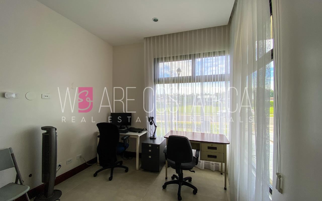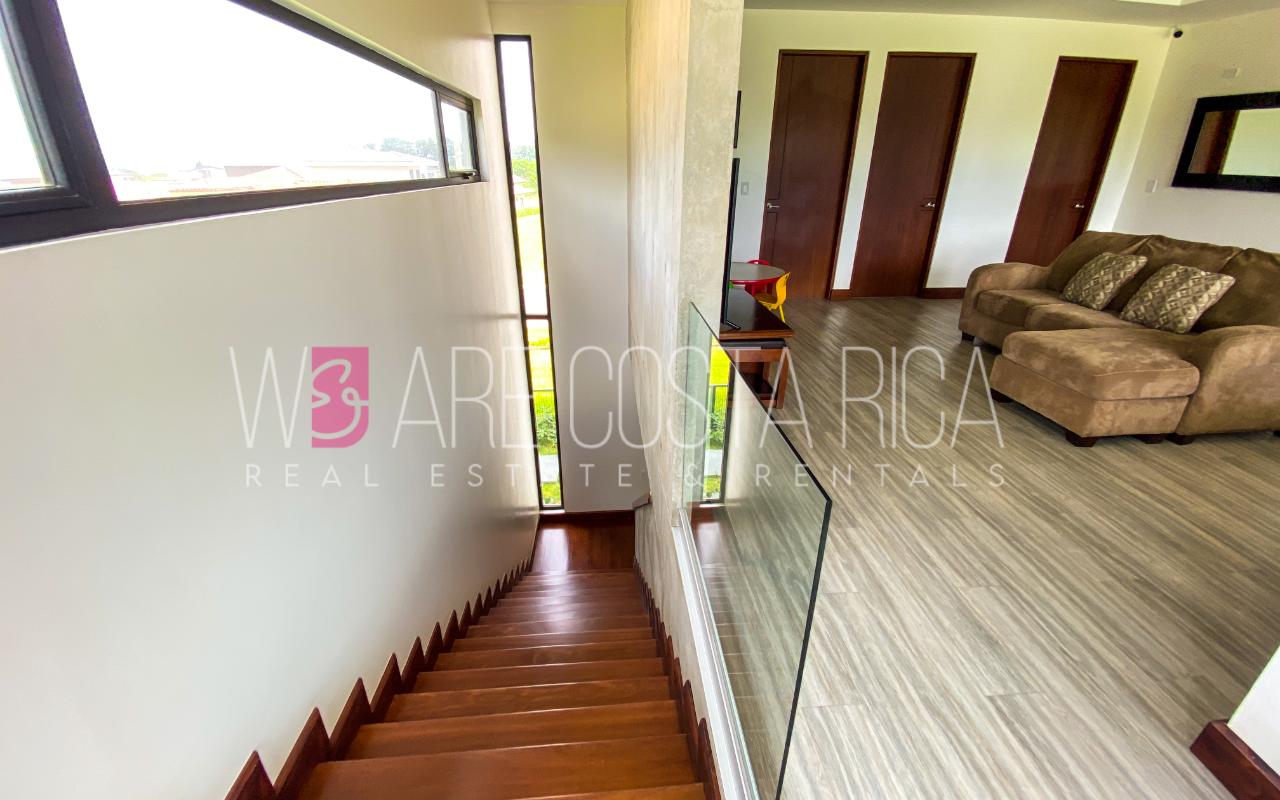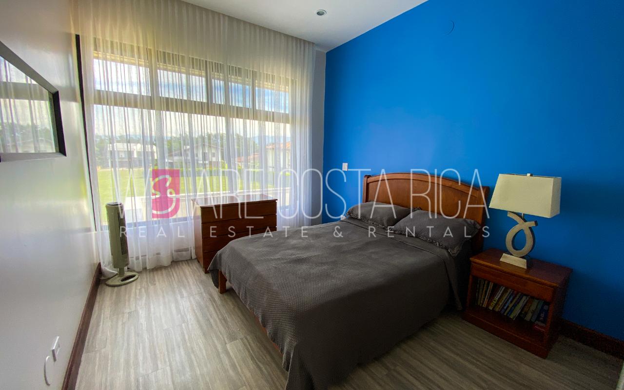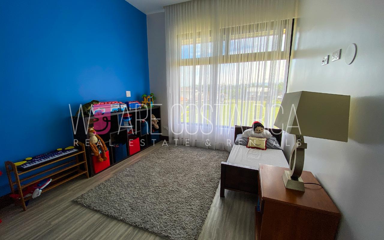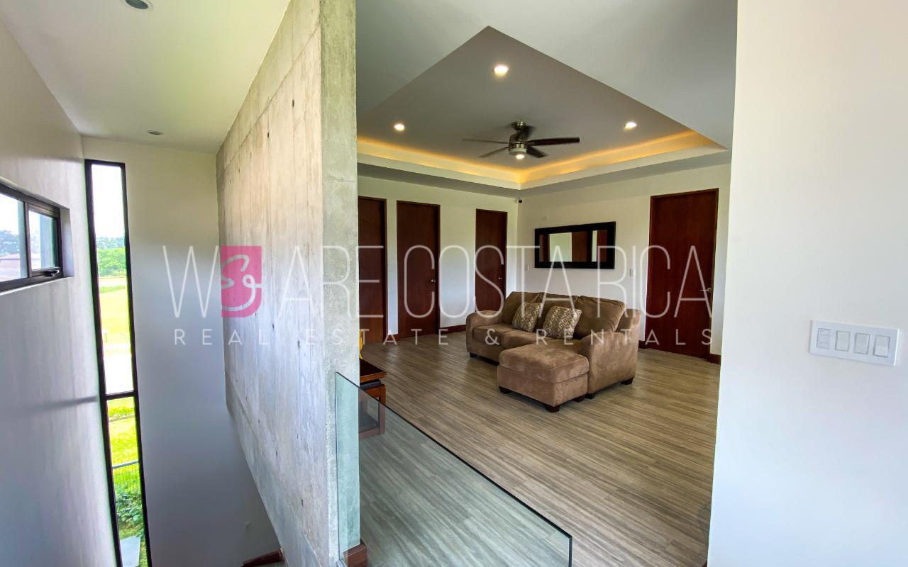 ID# 115376. Contemporary house for sale or rent in La Guácima, Hacienda Los Reyes, 340 sqmt construction, 531 sqmt land, 4 bedrooms, 3 baths, US$499.000 or US$3.500/mo. Beautiful house with a modern architectural design, high ceilings, lots of natural light and fine finishes throughout. The first level features an open-concept living, dining and integrated kitchen. All floors are porcelain. The kitchen has an American style with an ovens’ tower, wine cellar and impeccable white quartz countertops. It also has center island with dinette area. The social space connects through glass folding doors to the terrace and backyard. The first floor also has a home office, ample laundry room, full service room and garage upfront for 2 vehicles. Beautiful almond-tree wood stairs lead to the private area of the house. There is a TV room, 2 secondary bedrooms that share a full bath, and a master bedroom with en-suite bath and walk-in closet. High-tech features: water-saving sanitaryware, smart lighting system (Lutron) controlled by cellphone, internal and external cameras, automatic irrigation system, and solar panels. This property is located in Hacienda Los Reyes, an exclusive residential community that offers 24/7 patrolled security and amazing amenities like its one-of-a-kind golf course, club house, 6 tennis courts, gym, swimming pools. It is strategically located close to a variety of urban facilities, the international airport and private schools.