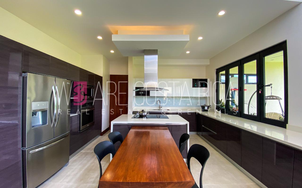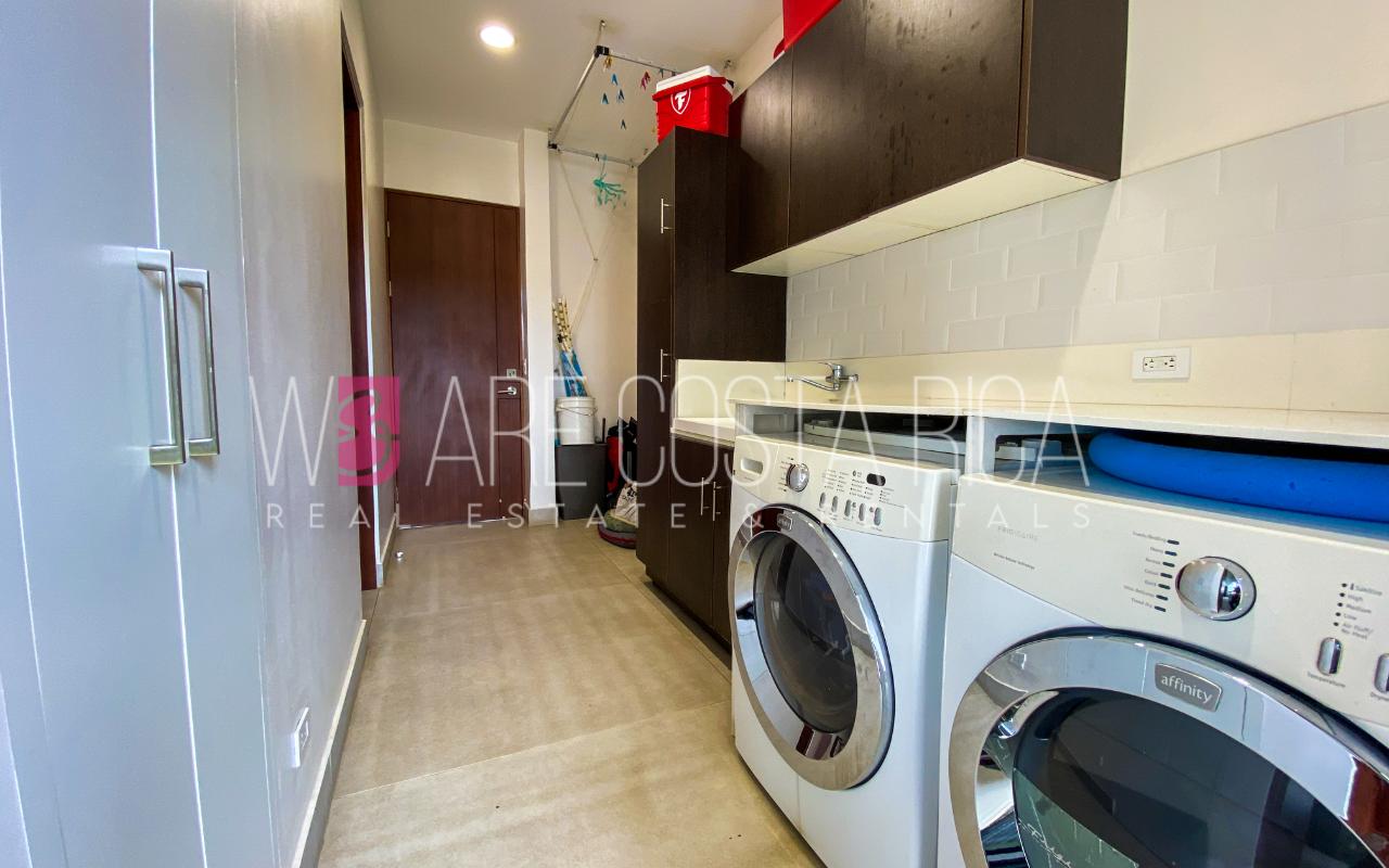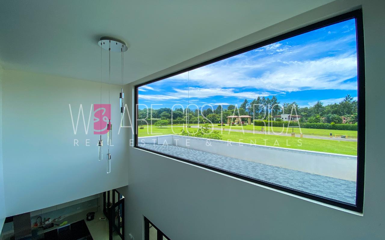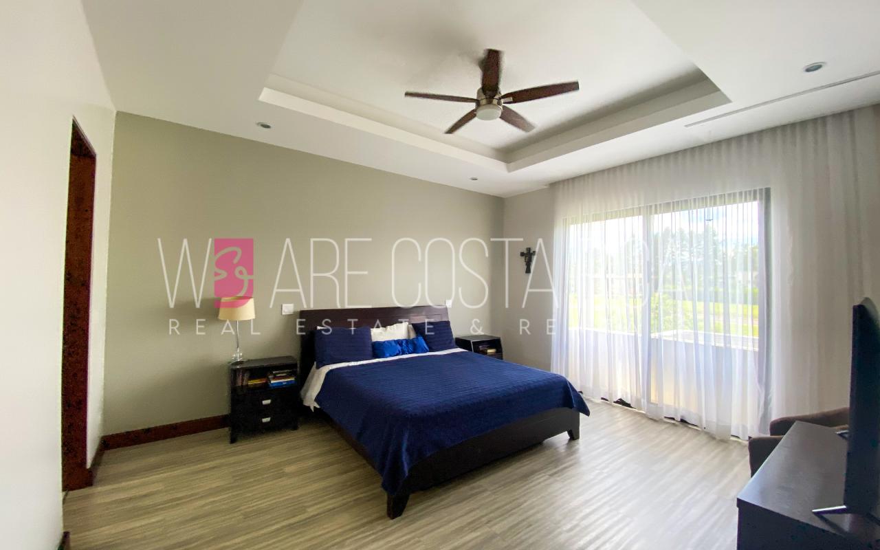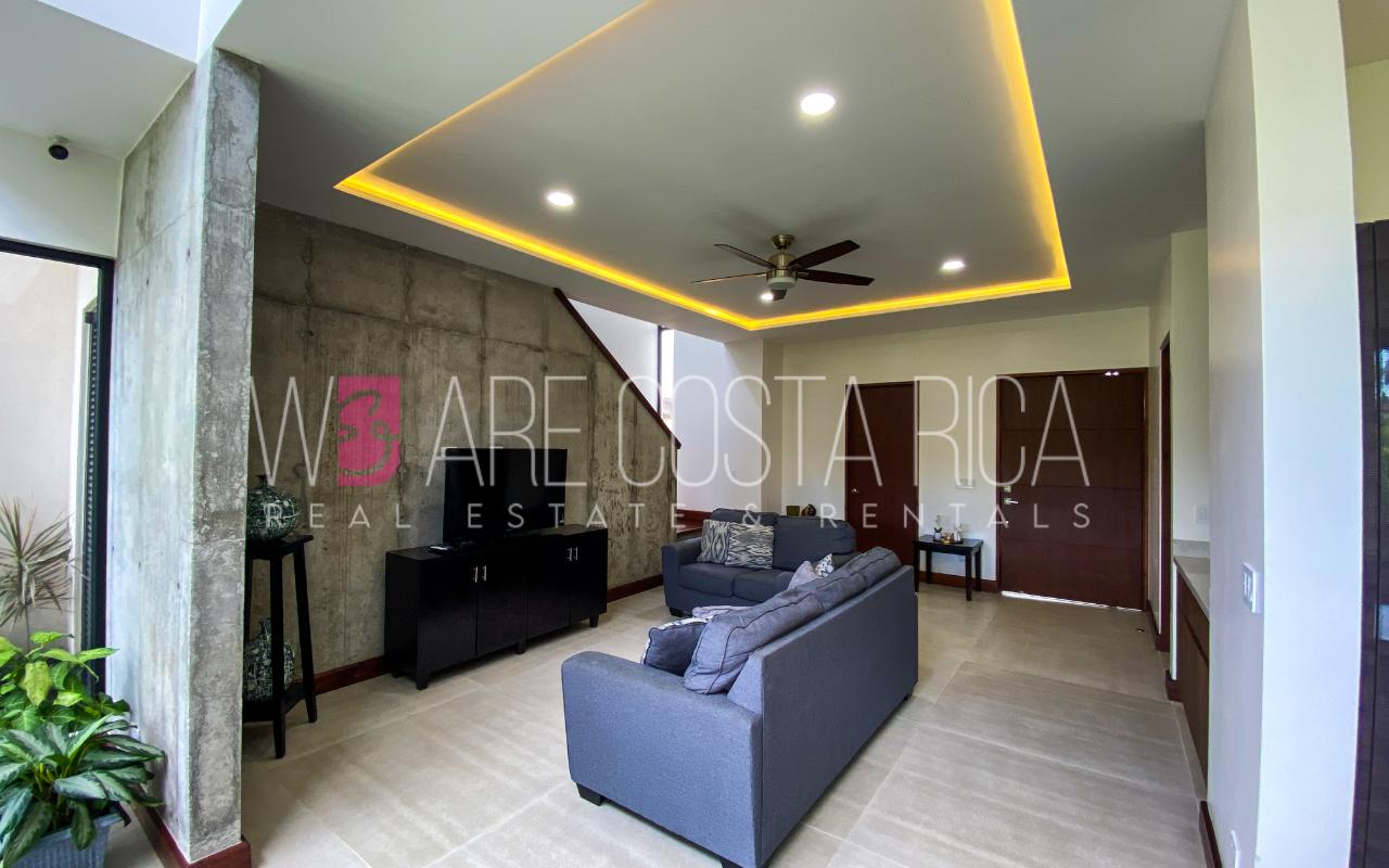 ID# 115376. Contemporary house for sale or rent in La Guácima, Hacienda Los Reyes, 340 sqmt construction, 531 sqmt land, 4 bedrooms, 3 baths, US$499.000 or US$3.500/mo. Beautiful house with a modern architectural design, high ceilings, lots of natural light and fine finishes throughout. The first level features an open-concept living, dining and integrated kitchen. All floors are porcelain. The kitchen has an American style with an ovens’ tower, wine cellar and impeccable white quartz countertops. It also has center island with dinette area. The social space connects through glass folding doors to the terrace and backyard. The first floor also has a home office, ample laundry room, full service room and garage upfront for 2 vehicles. Beautiful almond-tree wood stairs lead to the private area of the house. There is a TV room, 2 secondary bedrooms that share a full bath, and a master bedroom with en-suite bath and walk-in closet. High-tech features: water-saving sanitaryware, smart lighting system (Lutron) controlled by cellphone, internal and external cameras, automatic irrigation system, and solar panels. This property is located in Hacienda Los Reyes, an exclusive residential community that offers 24/7 patrolled security and amazing amenities like its one-of-a-kind golf course, club house, 6 tennis courts, gym, swimming pools. It is strategically located close to a variety of urban facilities, the international airport and private schools.