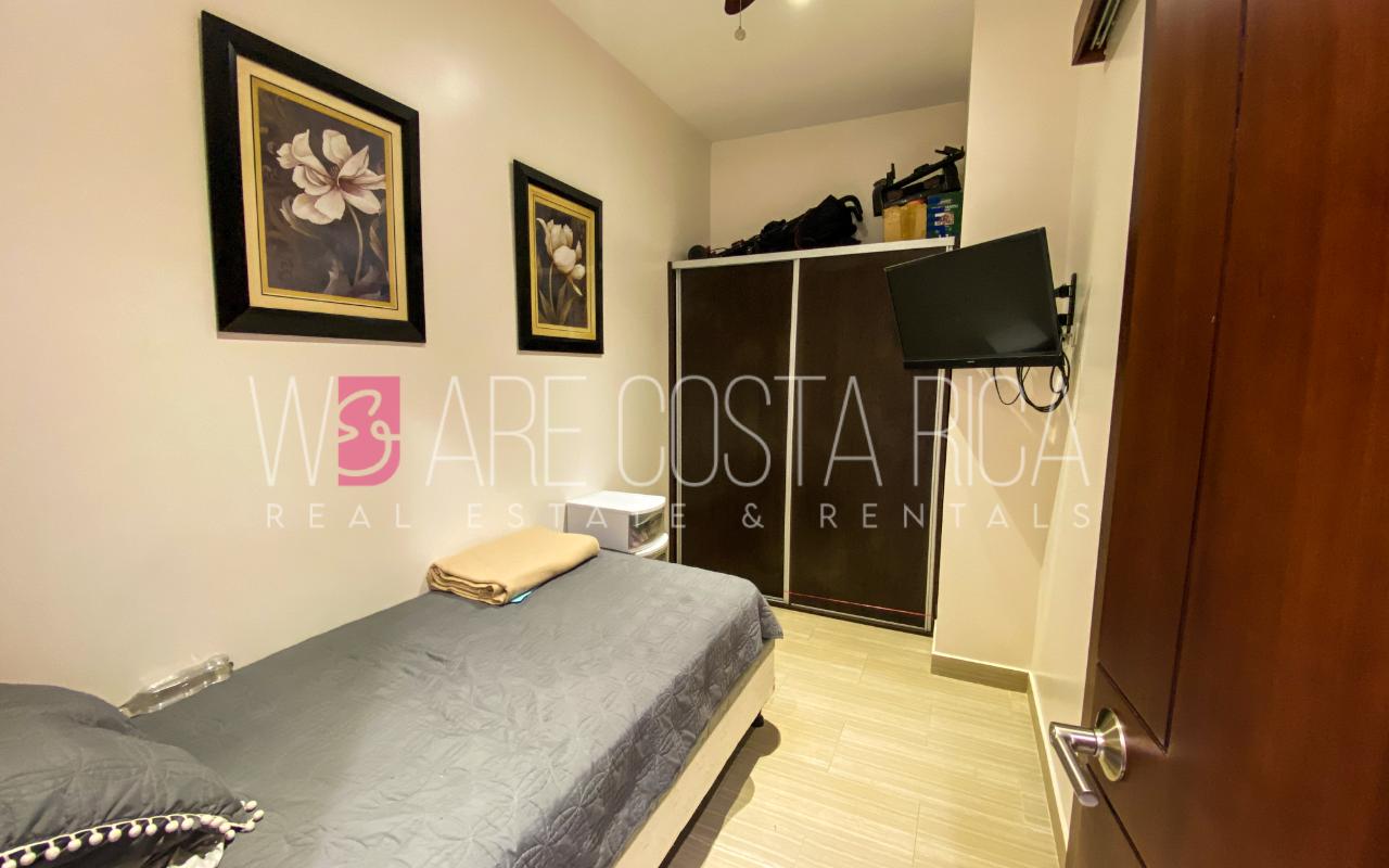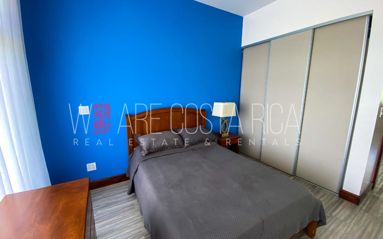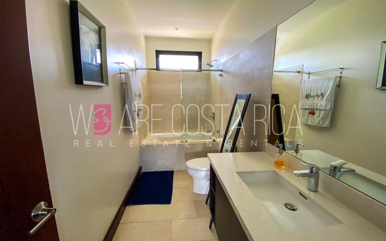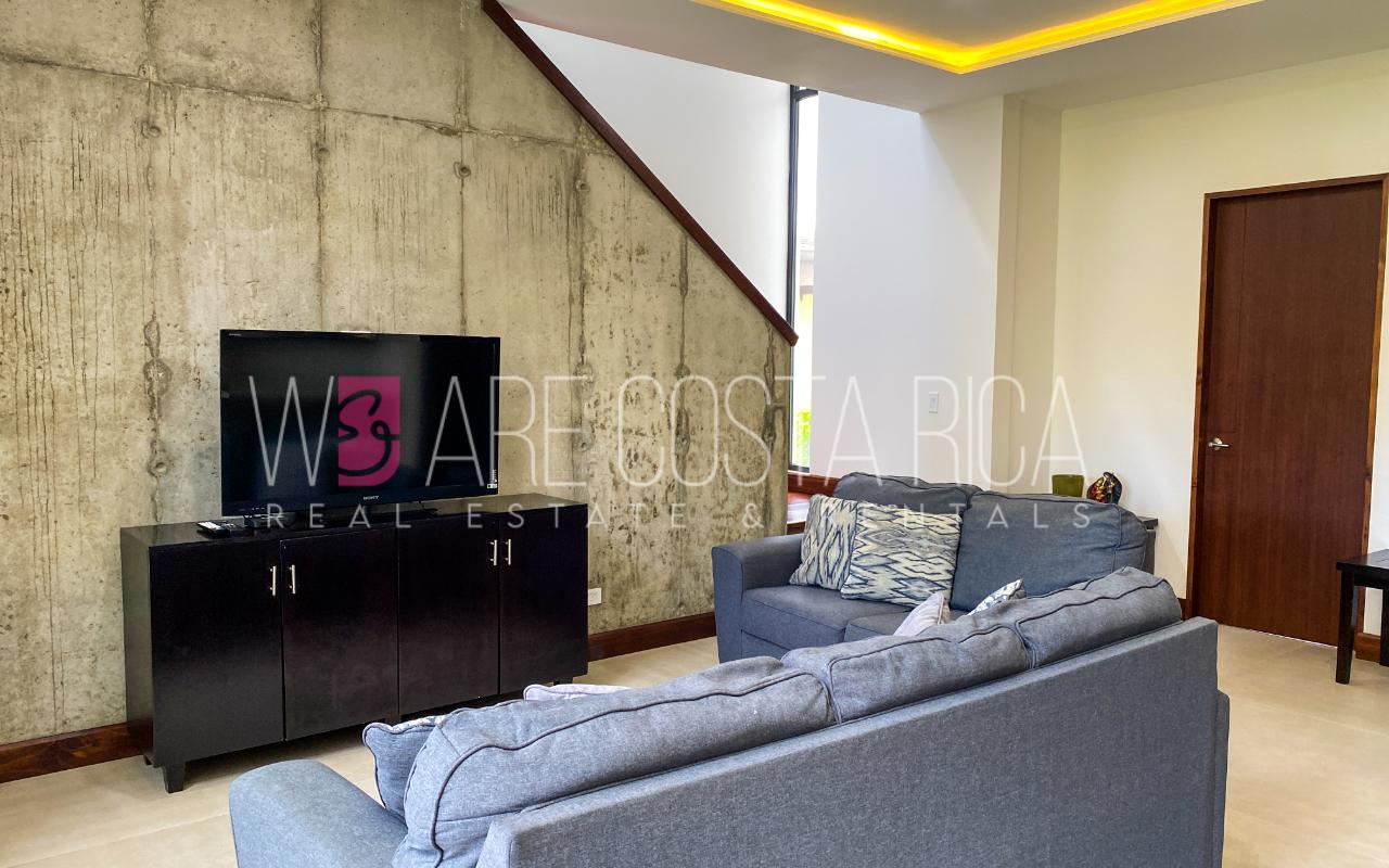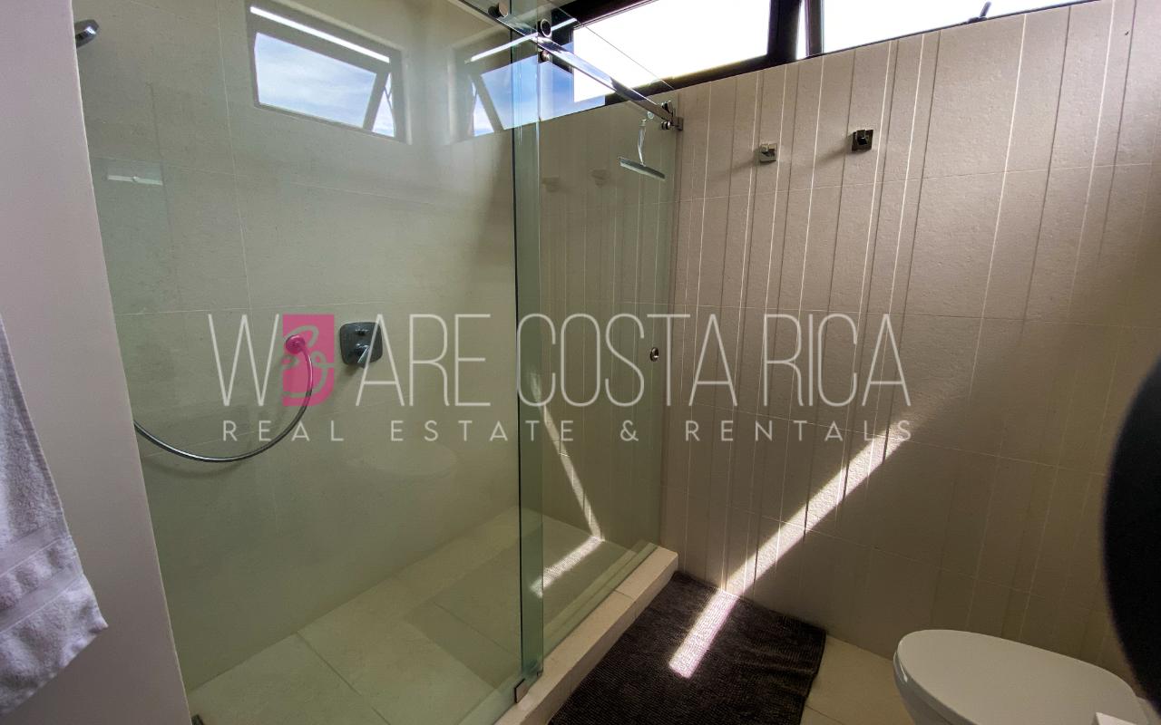 ID# 115376. Contemporary house for sale or rent in La Guácima, Hacienda Los Reyes, 340 sqmt construction, 531 sqmt land, 4 bedrooms, 3 baths, US$499.000 or US$3.500/mo. Beautiful house with a modern architectural design, high ceilings, lots of natural light and fine finishes throughout. The first level features an open-concept living, dining and integrated kitchen. All floors are porcelain. The kitchen has an American style with an ovens’ tower, wine cellar and impeccable white quartz countertops. It also has center island with dinette area. The social space connects through glass folding doors to the terrace and backyard. The first floor also has a home office, ample laundry room, full service room and garage upfront for 2 vehicles. Beautiful almond-tree wood stairs lead to the private area of the house. There is a TV room, 2 secondary bedrooms that share a full bath, and a master bedroom with en-suite bath and walk-in closet. High-tech features: water-saving sanitaryware, smart lighting system (Lutron) controlled by cellphone, internal and external cameras, automatic irrigation system, and solar panels. This property is located in Hacienda Los Reyes, an exclusive residential community that offers 24/7 patrolled security and amazing amenities like its one-of-a-kind golf course, club house, 6 tennis courts, gym, swimming pools. It is strategically located close to a variety of urban facilities, the international airport and private schools.