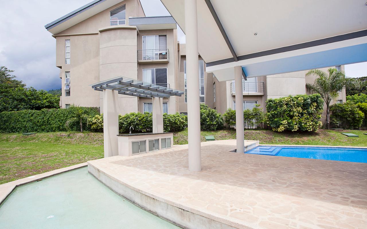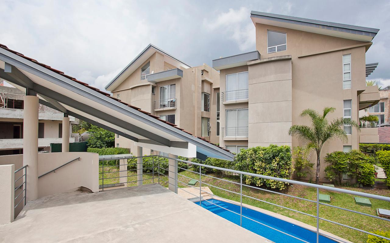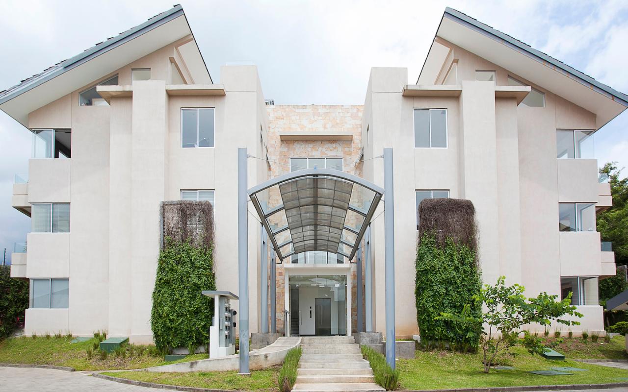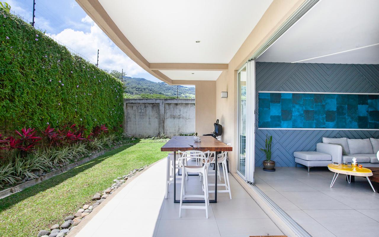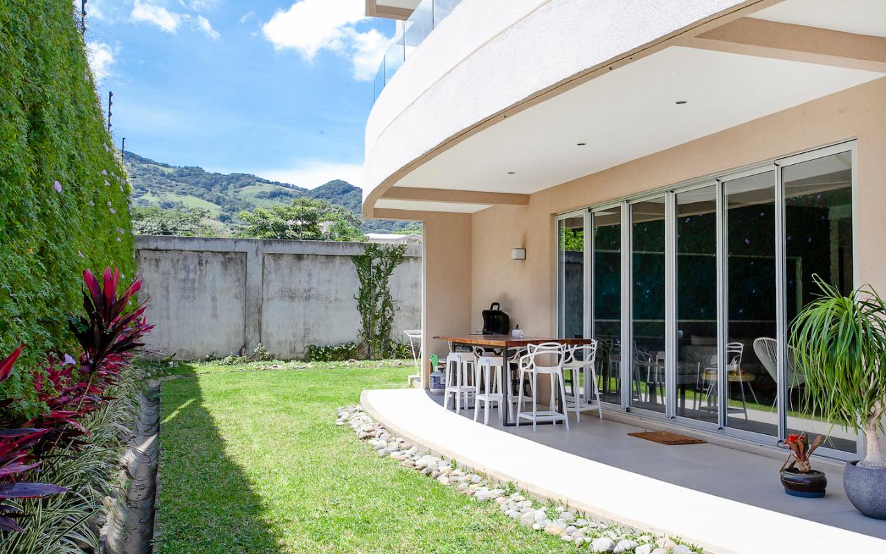 ID# 115671. Ground-level apartment for sale in Santa Ana, Vereda del Río condominium, 200 sqmt construction, 330 sqmt land, 2 bedrooms, 2.5 baths, US$320.000. Contemporary apartment, especially design by renowned professional Esteban Salazar. As it is on first floor, it has a nice terrace with private garden. Open-concept social area with integrated kitchen. It directly connects to the outdoors area and has A/C. The kitchen has quartz finishes. The guest bath also has a trendy decoration. Both bedrooms have wood-color porcelain floors, high ceilings, and large windows, they luminous and cozy. The master bedroom has walk-in closet. The unit also has service room with bath. Two roofed parking spaces. The condominium offers 24/7 security. Only 21 apartments, very private. Amenities like 2 pools (adults/kids), rancho, sundeck, gym and green areas.