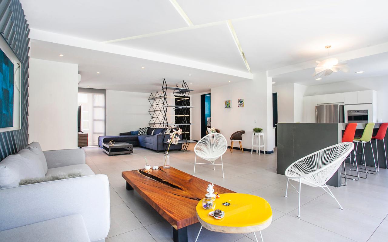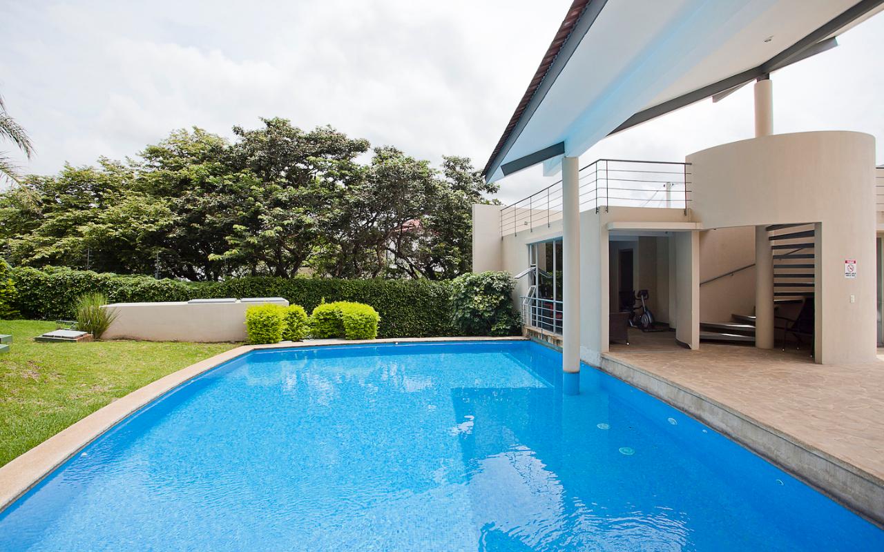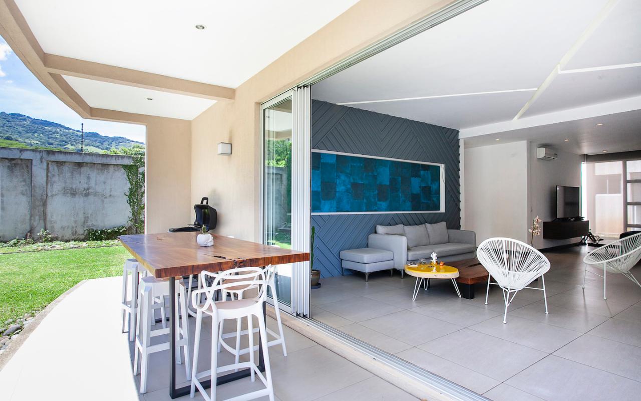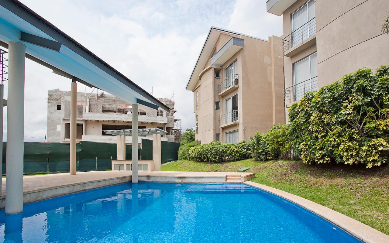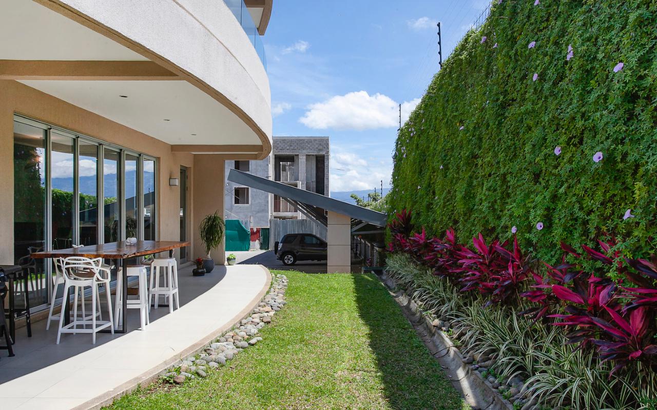 ID# 115671. Ground-level apartment for sale in Santa Ana, Vereda del Río condominium, 200 sqmt construction, 330 sqmt land, 2 bedrooms, 2.5 baths, US$320.000. Contemporary apartment, especially design by renowned professional Esteban Salazar. As it is on first floor, it has a nice terrace with private garden. Open-concept social area with integrated kitchen. It directly connects to the outdoors area and has A/C. The kitchen has quartz finishes. The guest bath also has a trendy decoration. Both bedrooms have wood-color porcelain floors, high ceilings, and large windows, they luminous and cozy. The master bedroom has walk-in closet. The unit also has service room with bath. Two roofed parking spaces. The condominium offers 24/7 security. Only 21 apartments, very private. Amenities like 2 pools (adults/kids), rancho, sundeck, gym and green areas.