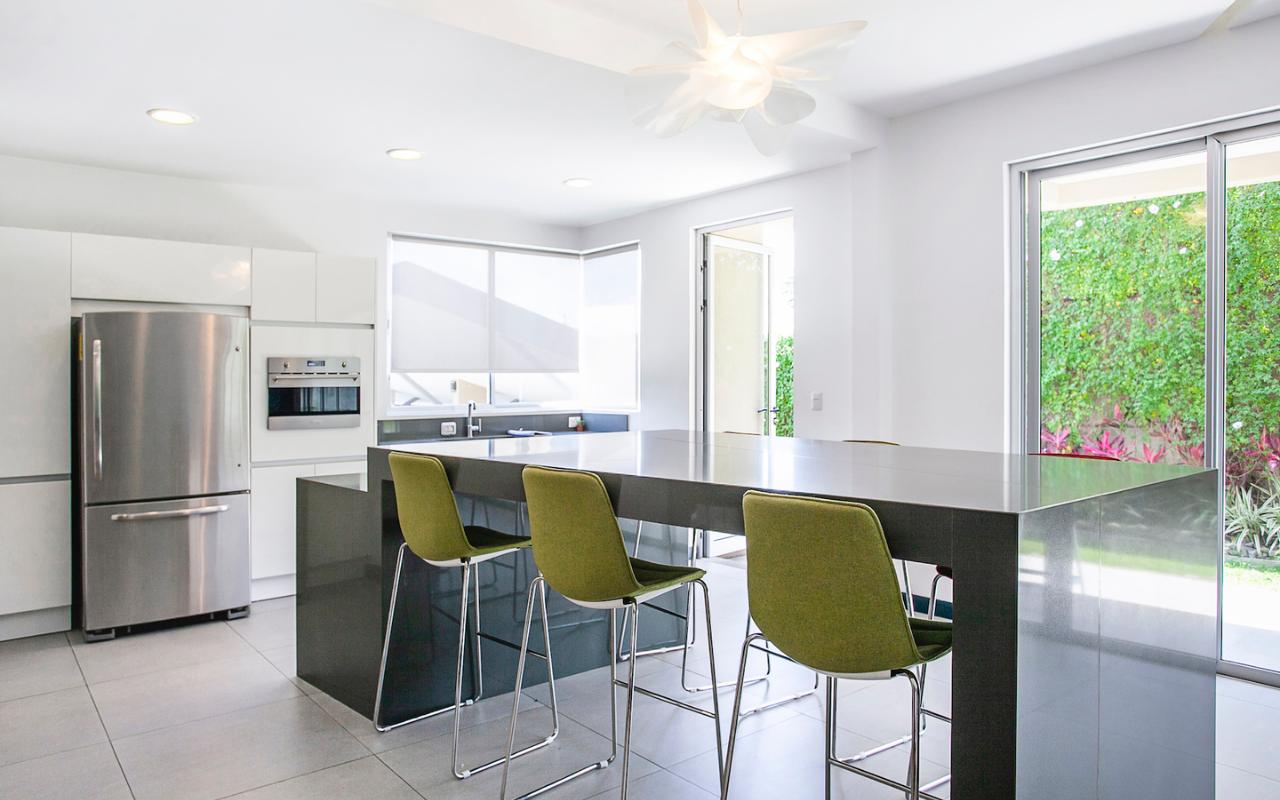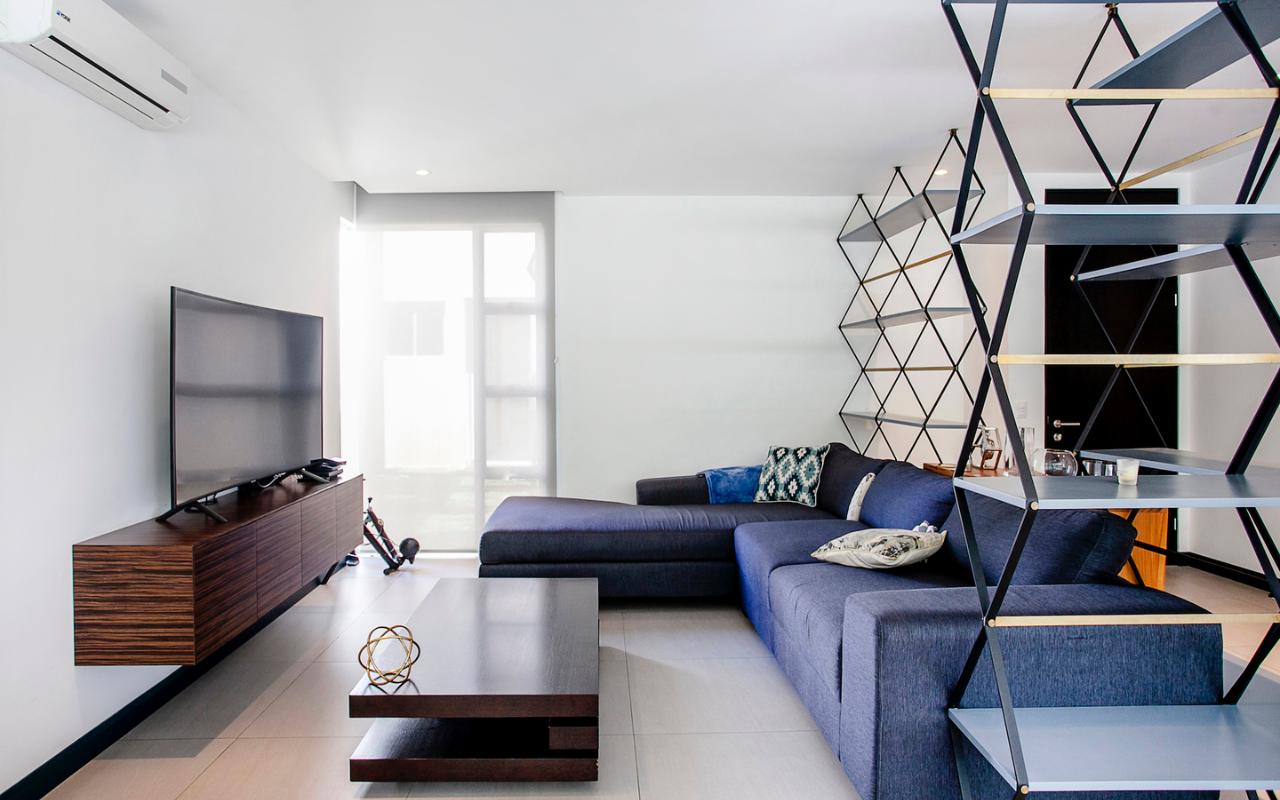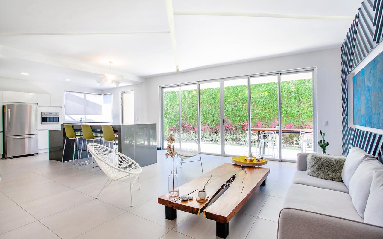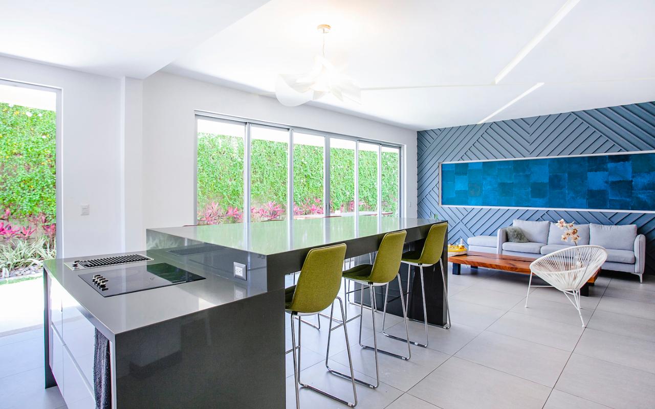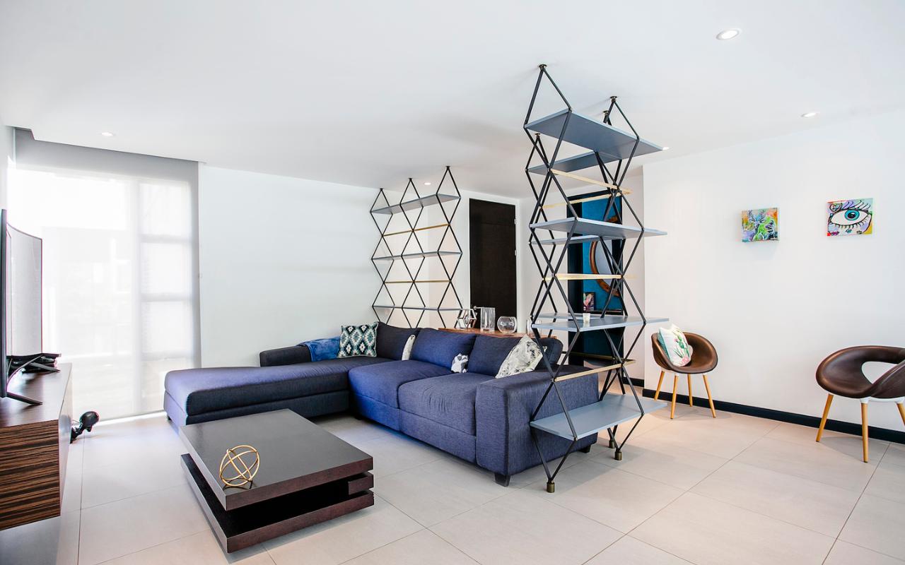 ID# 115671. Ground-level apartment for sale in Santa Ana, Vereda del Río condominium, 200 sqmt construction, 330 sqmt land, 2 bedrooms, 2.5 baths, US$320.000. Contemporary apartment, especially design by renowned professional Esteban Salazar. As it is on first floor, it has a nice terrace with private garden. Open-concept social area with integrated kitchen. It directly connects to the outdoors area and has A/C. The kitchen has quartz finishes. The guest bath also has a trendy decoration. Both bedrooms have wood-color porcelain floors, high ceilings, and large windows, they luminous and cozy. The master bedroom has walk-in closet. The unit also has service room with bath. Two roofed parking spaces. The condominium offers 24/7 security. Only 21 apartments, very private. Amenities like 2 pools (adults/kids), rancho, sundeck, gym and green areas.