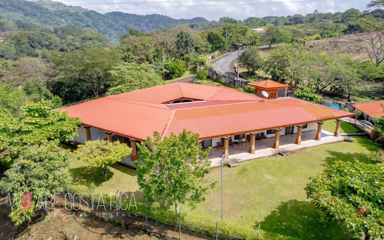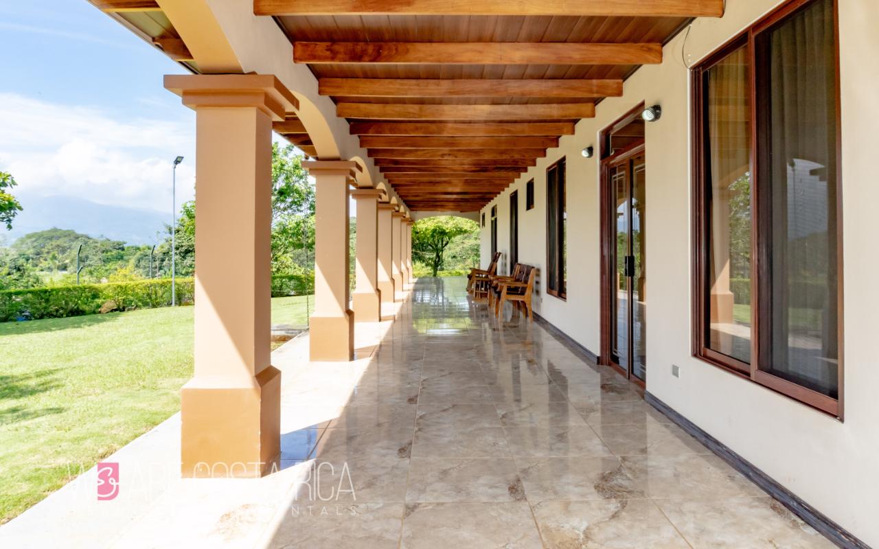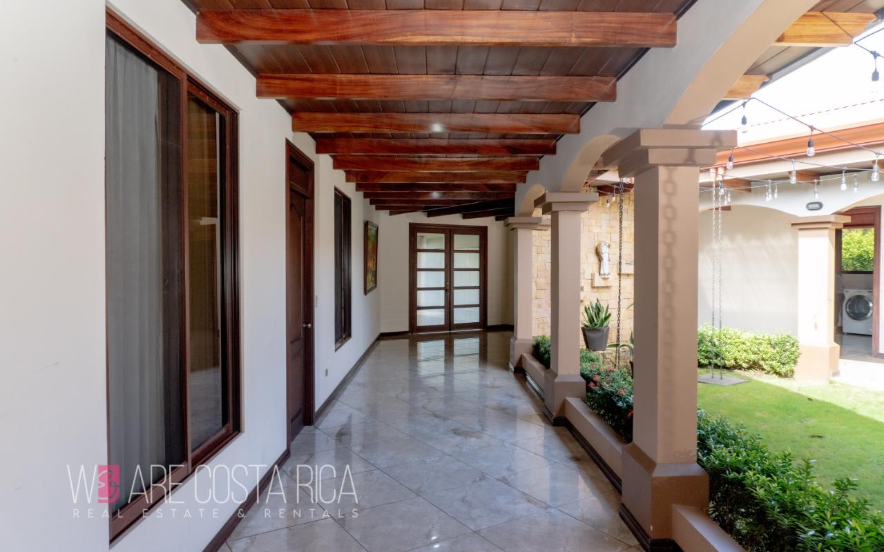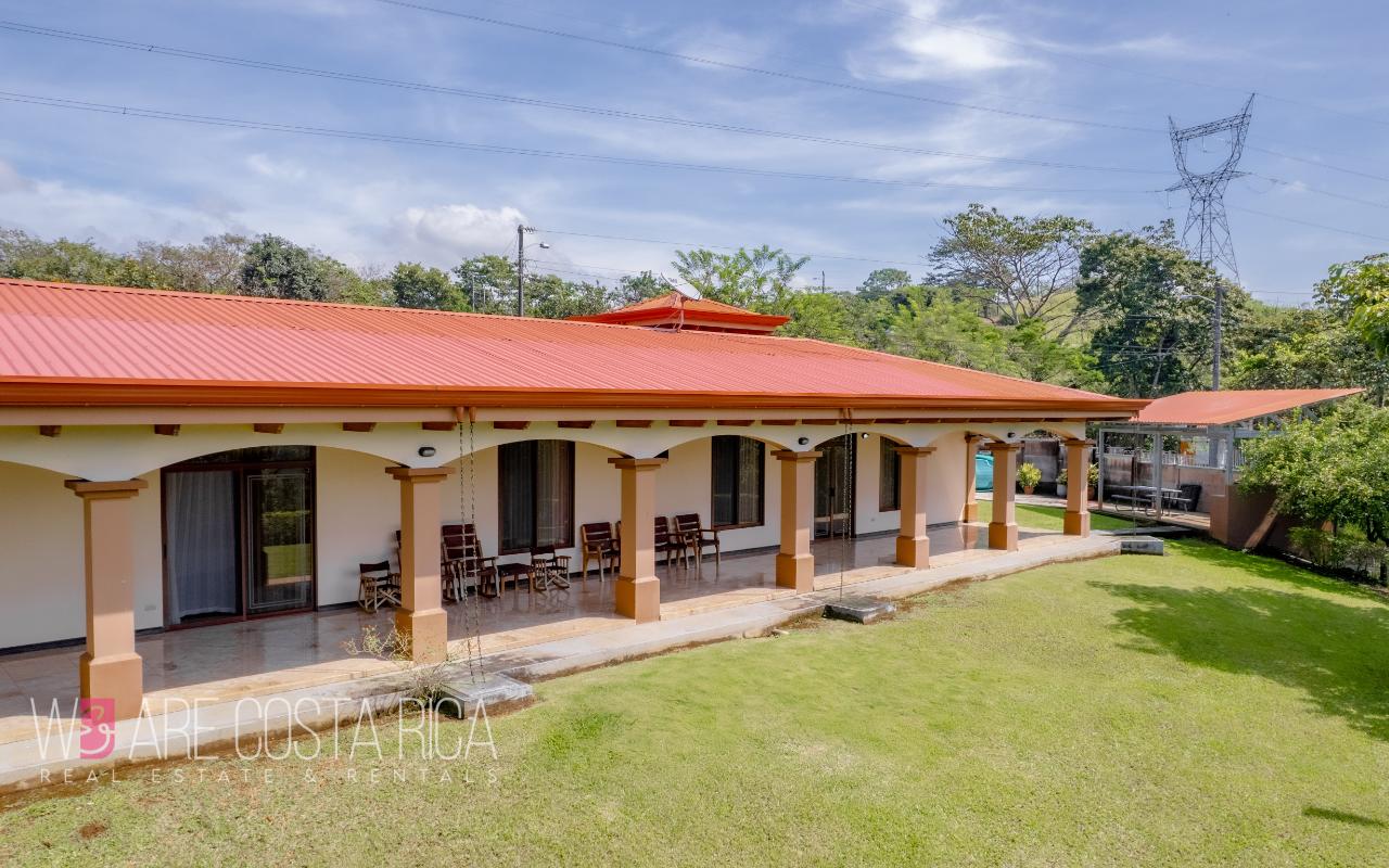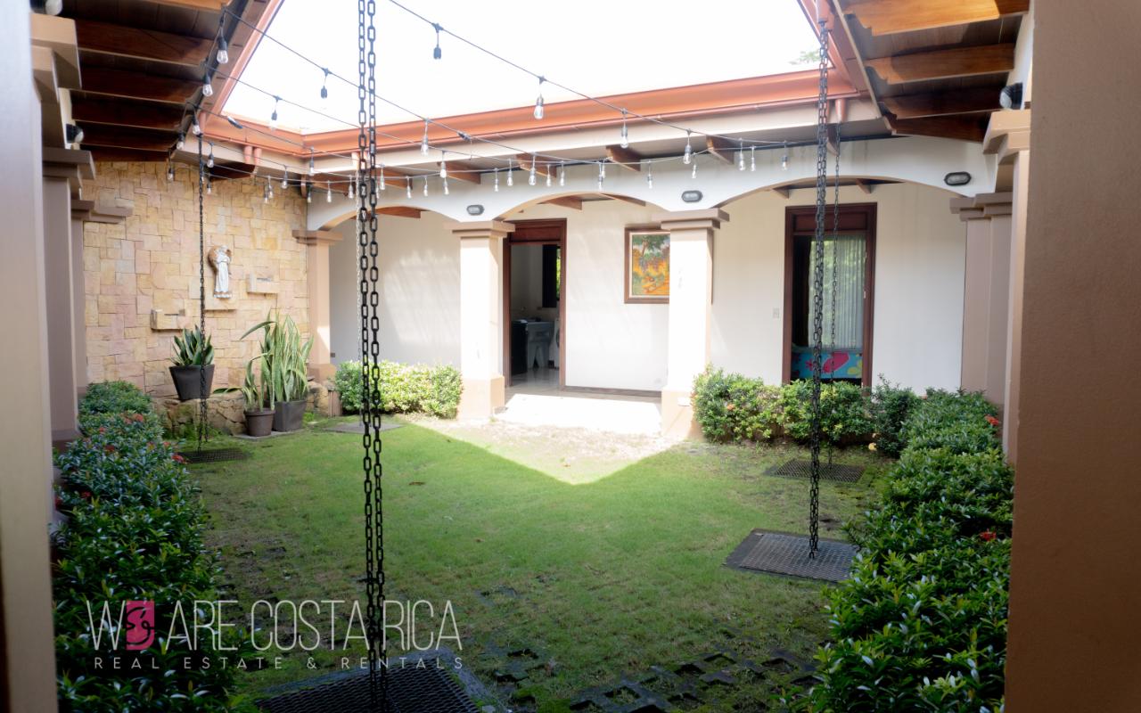 ID#116516. Independent home for sale or rent in Las Vueltas, La Guácima, 500 sqm construction, 14.200 sqm land, 5 bedrooms, 3.5 baths, US$1.400.000 or US$5.500/mo. Beautiful house, one level, it combines a traditional architecture with rustic elements and modern finishes. Excellent wood work in Guanacaste tree wood that can be appreciated in window and door frames, doors, coffered ceilings, and built-in furniture. Spanish porcelain floors and granite countertops. Large social area with fresh open concept. Integrated kitchen with customized furniture, breakfast nook and dinette area. An internal patio provides luminosity and freshness to the entire house. A very large terrace wraps around the house and has a wonderful panoramic view. Ample bedrooms with view to the garden. The house has an office, storage room, laundry room, BBQ area and a roofed garage for 4 vehicles. The extension of the land allows outdoors parking for 20 more cars. The property also has a small house for employees. This house is located within a very secure and tranquil area. It has easy access to downtown La Guácima and all its amenities and services.
