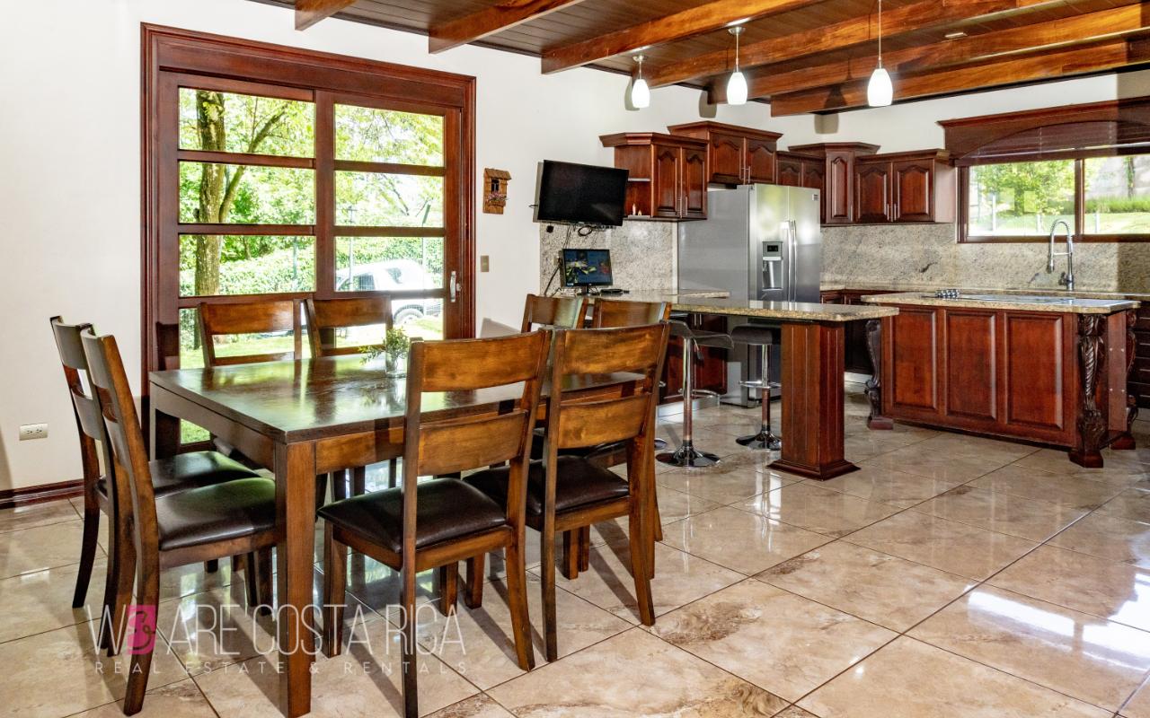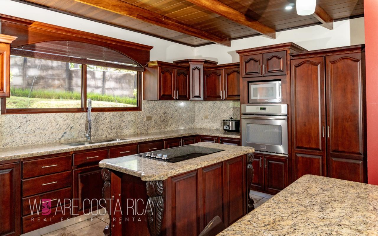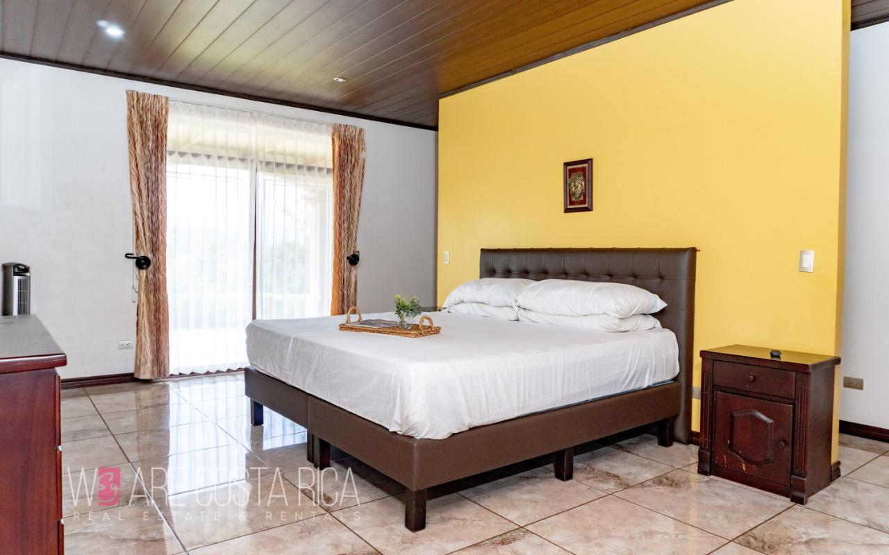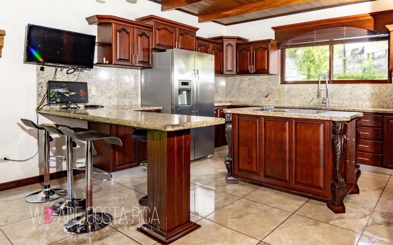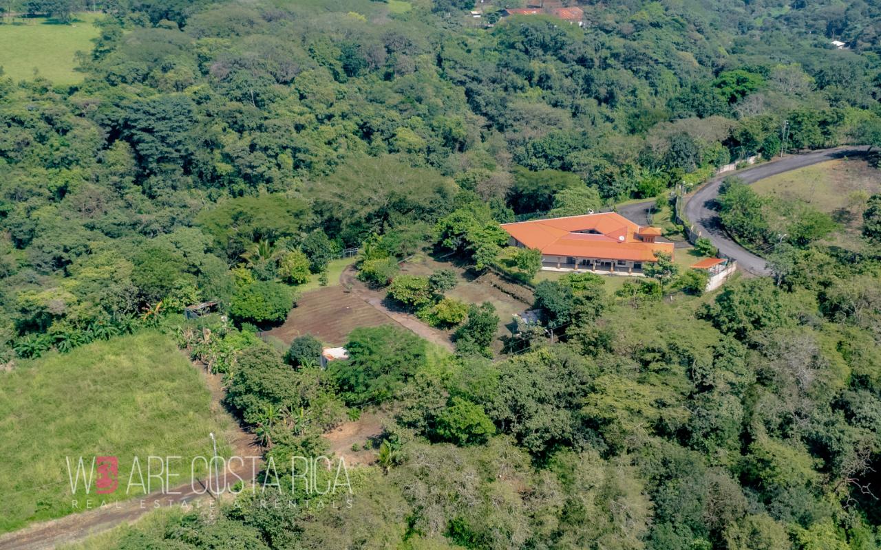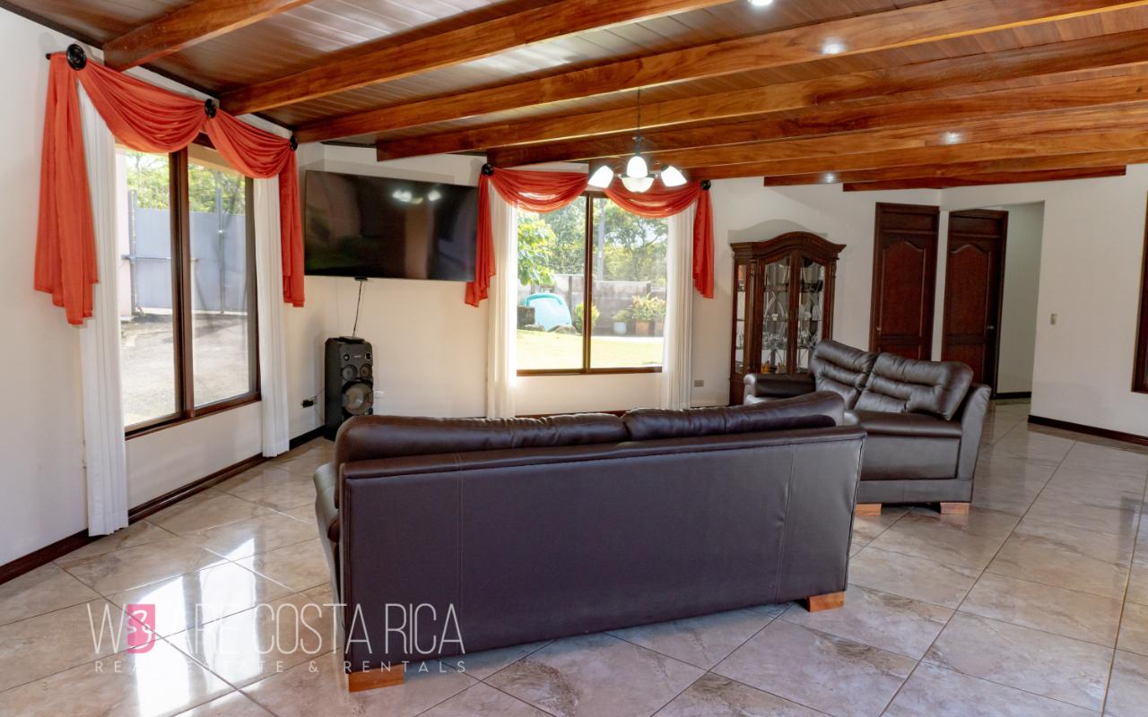 ID#116516. Independent home for sale or rent in Las Vueltas, La Guácima, 500 sqm construction, 14.200 sqm land, 5 bedrooms, 3.5 baths, US$1.400.000 or US$5.500/mo. Beautiful house, one level, it combines a traditional architecture with rustic elements and modern finishes. Excellent wood work in Guanacaste tree wood that can be appreciated in window and door frames, doors, coffered ceilings, and built-in furniture. Spanish porcelain floors and granite countertops. Large social area with fresh open concept. Integrated kitchen with customized furniture, breakfast nook and dinette area. An internal patio provides luminosity and freshness to the entire house. A very large terrace wraps around the house and has a wonderful panoramic view. Ample bedrooms with view to the garden. The house has an office, storage room, laundry room, BBQ area and a roofed garage for 4 vehicles. The extension of the land allows outdoors parking for 20 more cars. The property also has a small house for employees. This house is located within a very secure and tranquil area. It has easy access to downtown La Guácima and all its amenities and services.