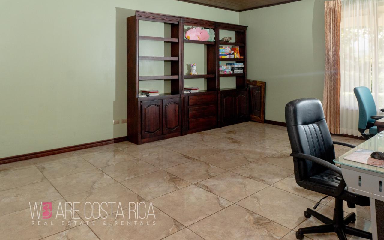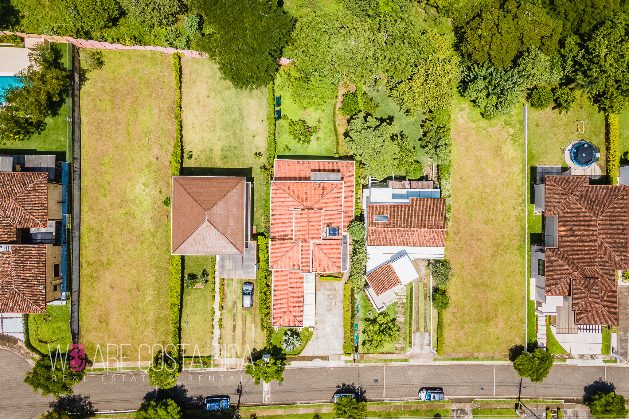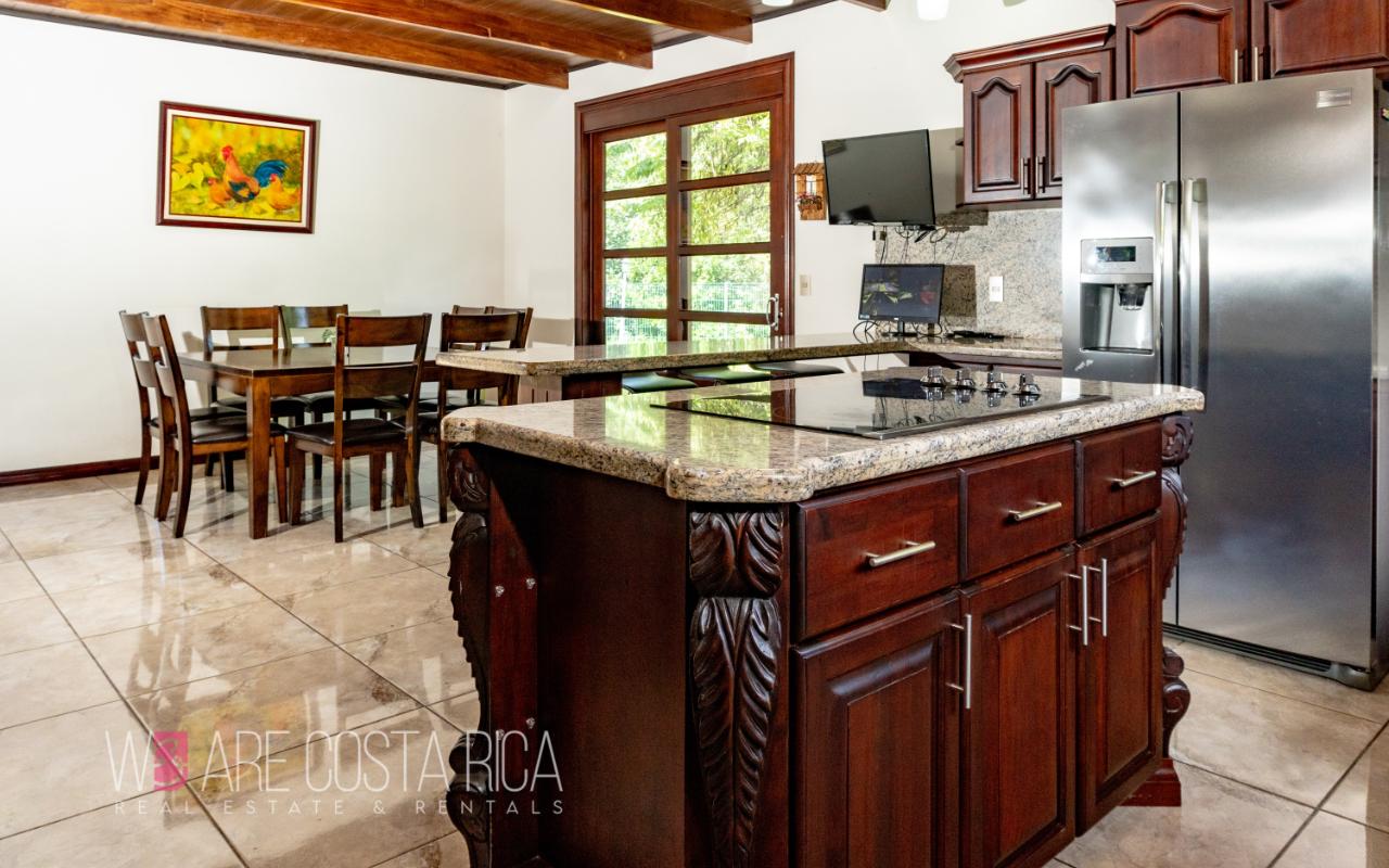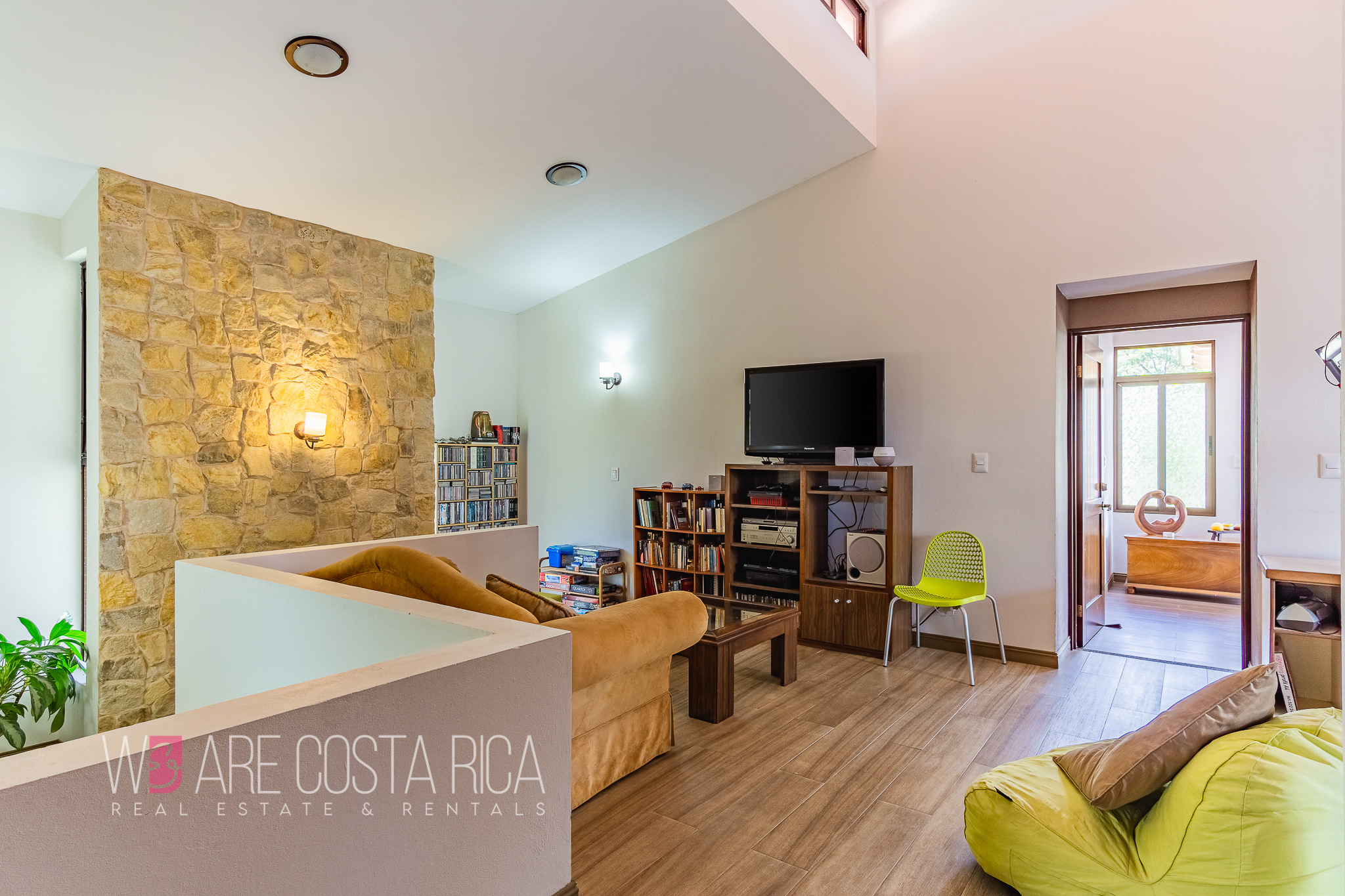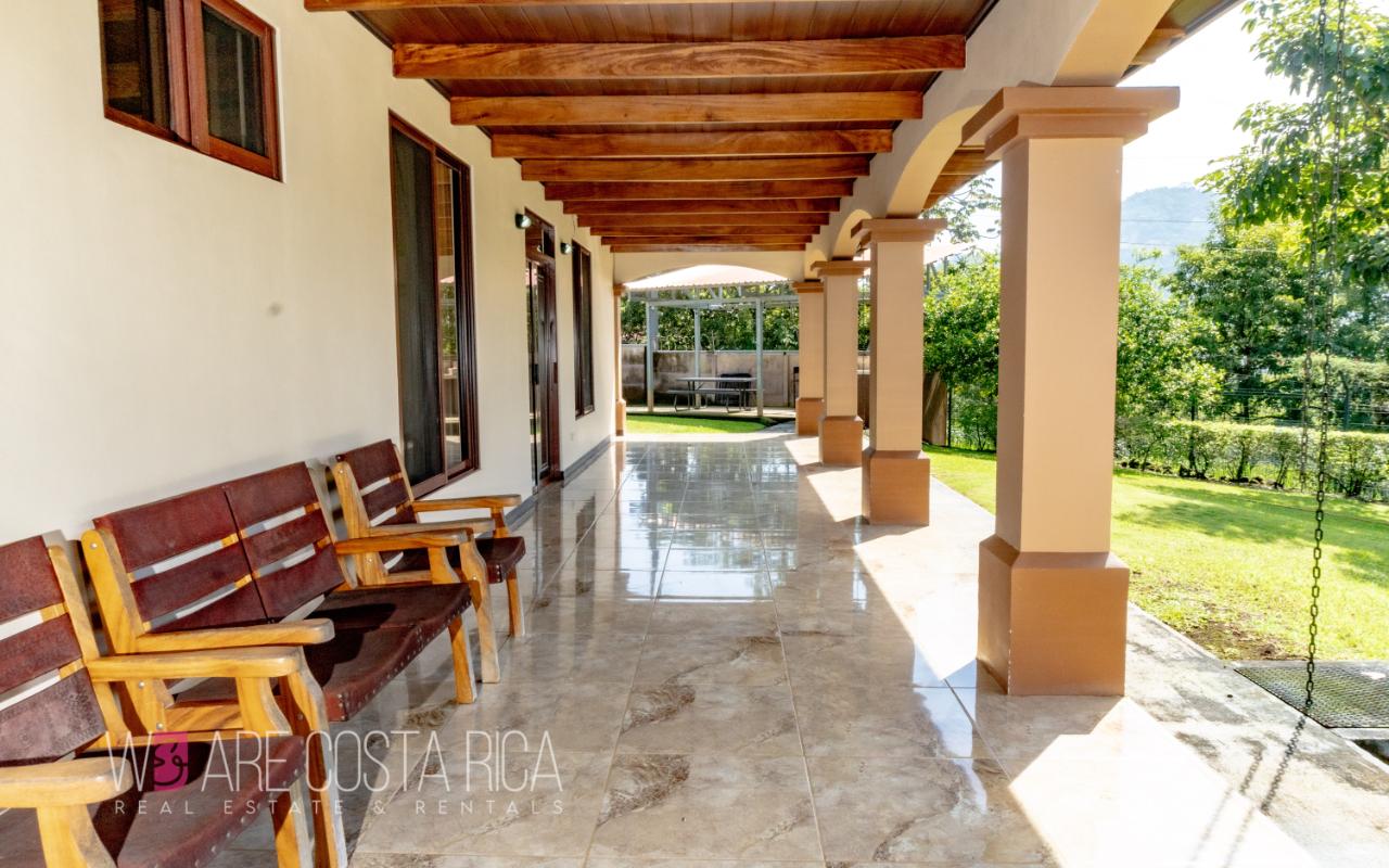 ID#116516. Independent home for sale or rent in Las Vueltas, La Guácima, 500 sqm construction, 14.200 sqm land, 5 bedrooms, 3.5 baths, US$1.400.000 or US$5.500/mo. Beautiful house, one level, it combines a traditional architecture with rustic elements and modern finishes. Excellent wood work in Guanacaste tree wood that can be appreciated in window and door frames, doors, coffered ceilings, and built-in furniture. Spanish porcelain floors and granite countertops. Large social area with fresh open concept. Integrated kitchen with customized furniture, breakfast nook and dinette area. An internal patio provides luminosity and freshness to the entire house. A very large terrace wraps around the house and has a wonderful panoramic view. Ample bedrooms with view to the garden. The house has an office, storage room, laundry room, BBQ area and a roofed garage for 4 vehicles. The extension of the land allows outdoors parking for 20 more cars. The property also has a small house for employees. This house is located within a very secure and tranquil area. It has easy access to downtown La Guácima and all its amenities and services.