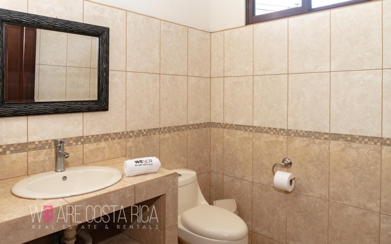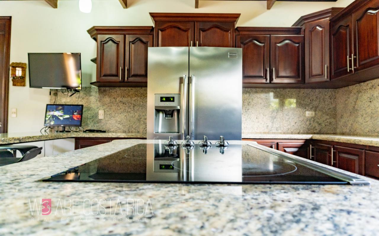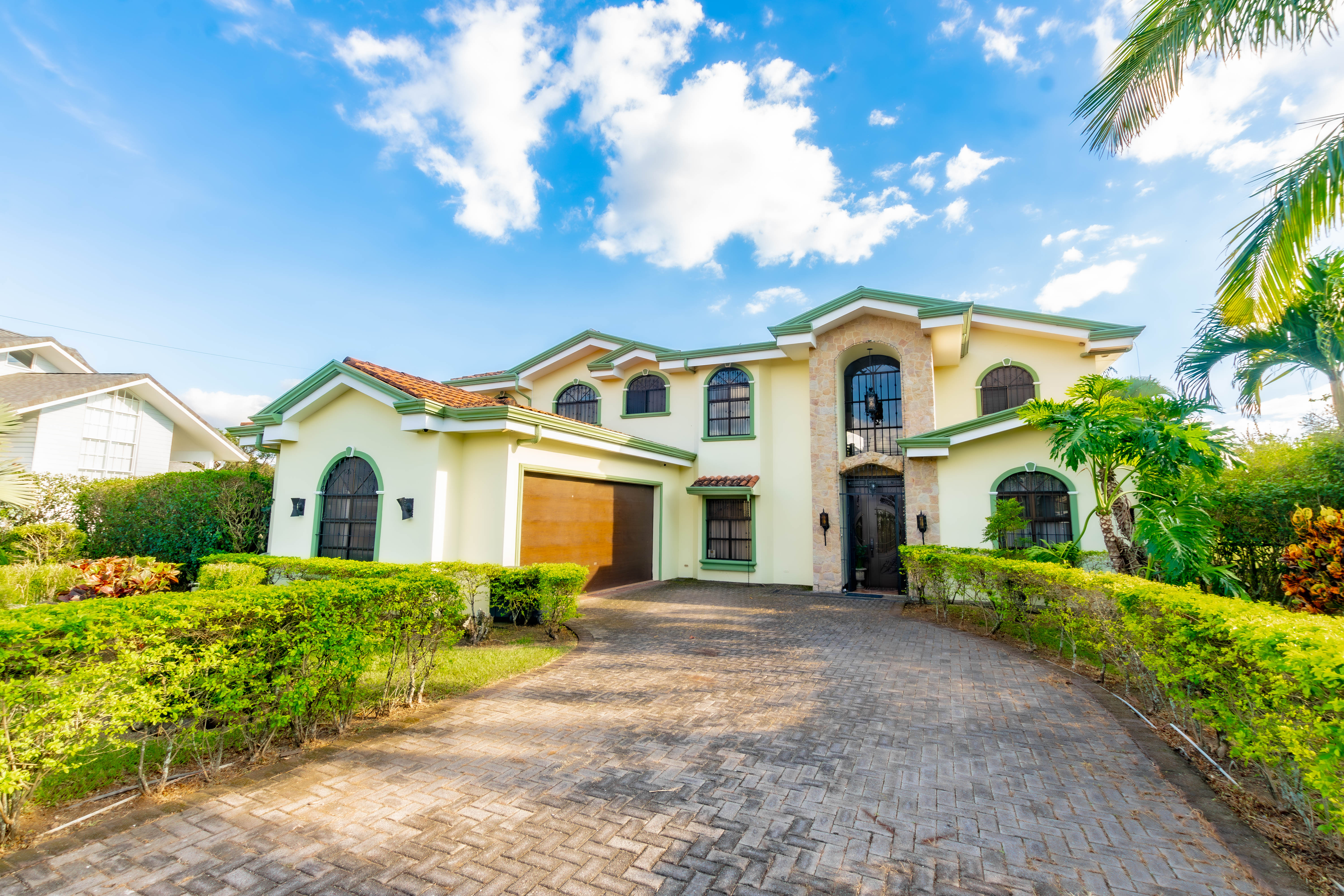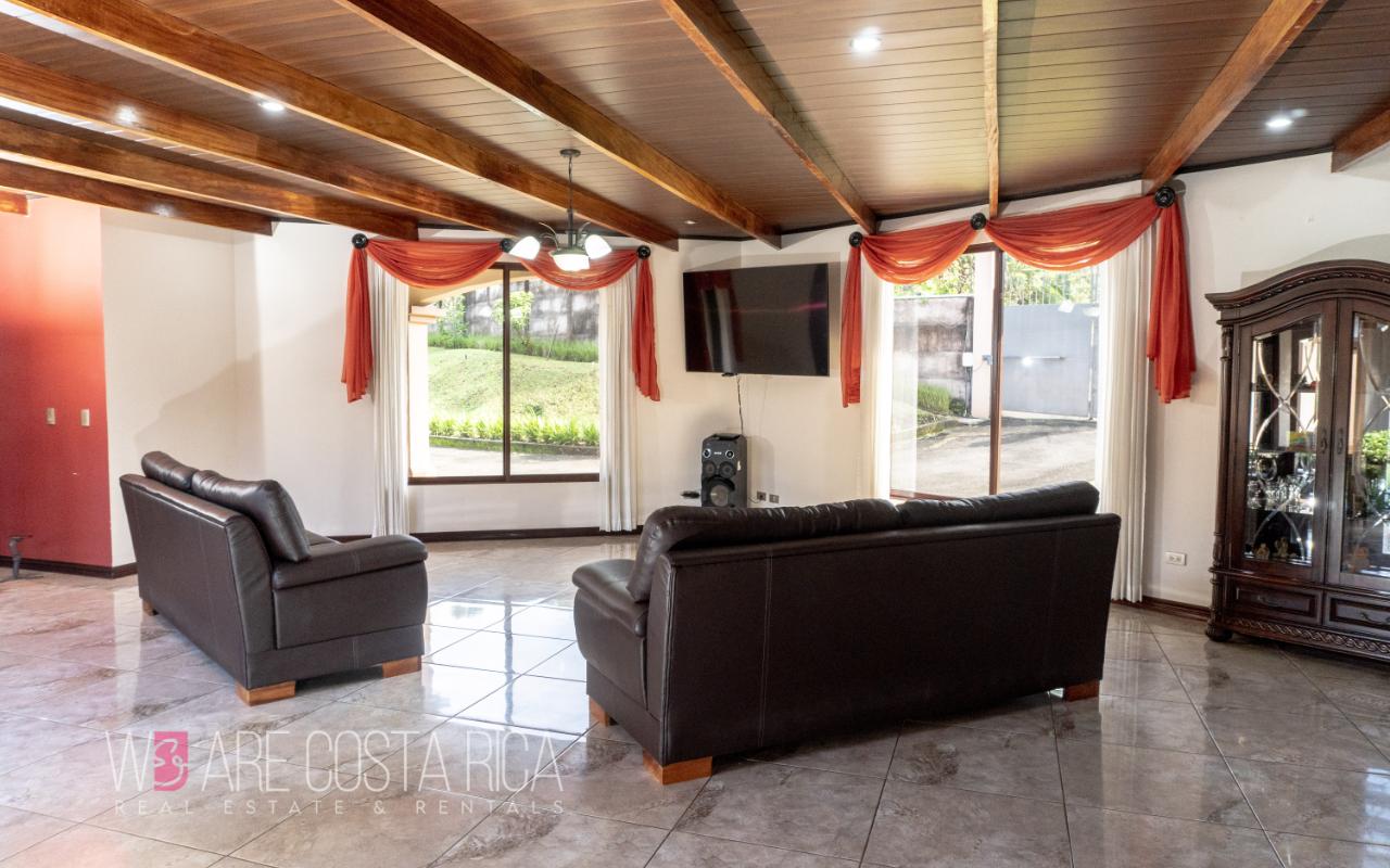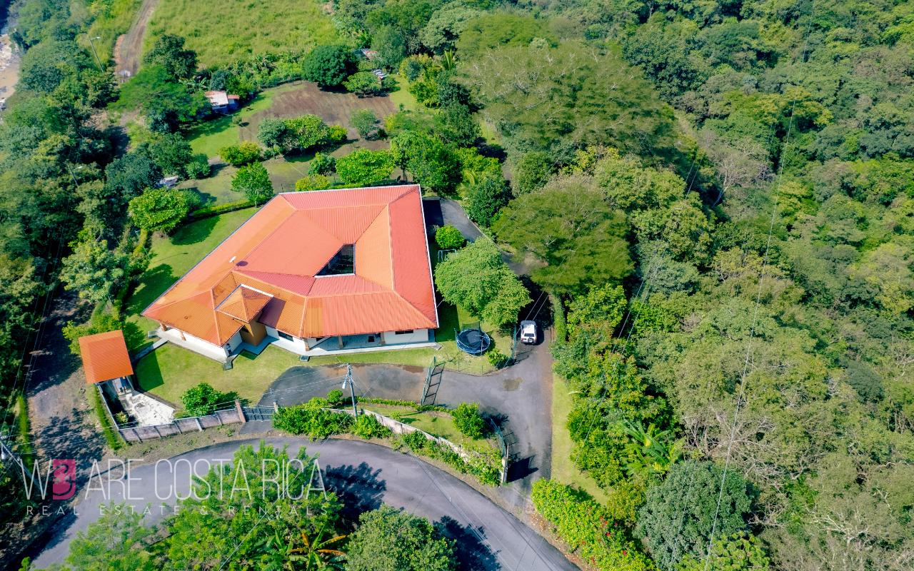 ID#116516. Independent home for sale or rent in Las Vueltas, La Guácima, 500 sqm construction, 14.200 sqm land, 5 bedrooms, 3.5 baths, US$1.400.000 or US$5.500/mo. Beautiful house, one level, it combines a traditional architecture with rustic elements and modern finishes. Excellent wood work in Guanacaste tree wood that can be appreciated in window and door frames, doors, coffered ceilings, and built-in furniture. Spanish porcelain floors and granite countertops. Large social area with fresh open concept. Integrated kitchen with customized furniture, breakfast nook and dinette area. An internal patio provides luminosity and freshness to the entire house. A very large terrace wraps around the house and has a wonderful panoramic view. Ample bedrooms with view to the garden. The house has an office, storage room, laundry room, BBQ area and a roofed garage for 4 vehicles. The extension of the land allows outdoors parking for 20 more cars. The property also has a small house for employees. This house is located within a very secure and tranquil area. It has easy access to downtown La Guácima and all its amenities and services.