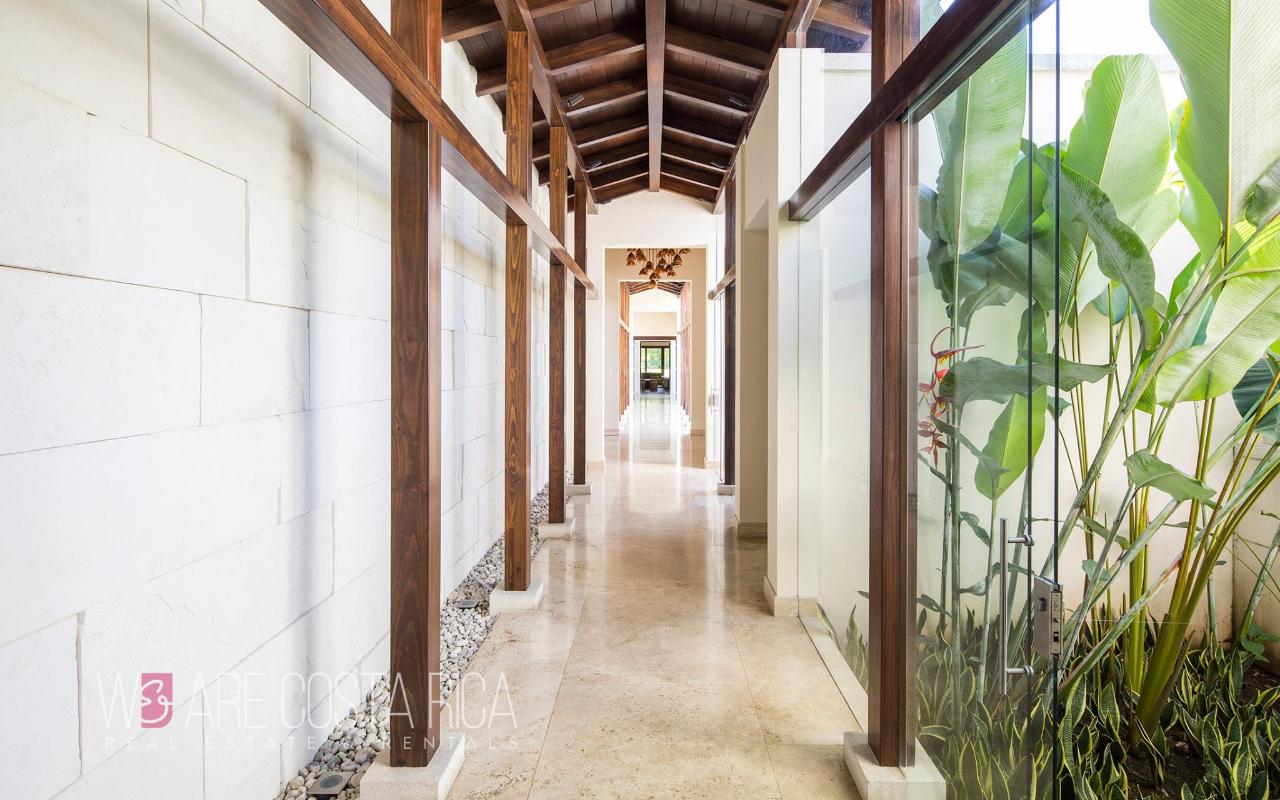 ID# 116847. Spectacular luxury house with pool for sale in Santa Ana, La Hacienda condominium, 1.636 sqmt construction, 5.171 sqmt land, 5 bedrooms, 6.5 baths, INQUIRE PRIVATELY FOR PRICING Undeniably gorgeous single-level house boasting a contemporary design by the renowned architect Jean Garnier. An impressive corridor leads to the main door that features a unique composition of beautiful gardens, relaxing water in various fountains, beautiful limestone in light colors along with wooden ceilings and beams at double height. The social area is very spacious and has an open concept distribution and on both sides of the lobby. The imposing view of the private garden in front and at the back with the mixture of the pool throughout the social area, provides a permanent feeling of being surrounded by water and vegetation inside the house. Floor-to-ceiling windows on both sides of the dining and living rooms, maximizing total transparency between the outside and the inside, thus achieving a pleasant and sophisticated atmosphere. There is a bar in the living with a wall covered in different woods. The dining has a built-in BBQ area with a wooden bar in front. This place has a beautiful wine cellar and refrigerators for the optimal conservation of the bottles that require it. One of the most impressive qualities of this residence is the landscape present throughout its rooms. The social area has a view to internal fountains with trees planted in six central points. The main garden and pool incorporate deck areas to enjoy the sun and open terraces with stone floors. The pergola covered with ivy results in a very cozy informal space to enjoy a summer afternoon or night and a huge pond where colorful fish live, is one of the landscapes that fix the attention from the main bedroom. The private area of the house is extremely independent as it is located at one end of the building. As a prelude to the master suite, there is a space that functions as a private TV room, office with a comfortable desk, library full of beautiful furniture embedded in fine wood and as a central piece, a gas fireplace that provides a unique atmosphere of luxury. The master suite is very spacious and has private access to a deck facing the garden with a pond. A fireplace in the room is a great delight to light at night. The master bath has jacuzzi, shower with transparent doors to the internal vegetation, space for a massage bed and a furnished environment with a sunbed that is a private area for reading or just relaxing. The TV room is full of comfort and it is the central area where the 4 secondary rooms are located around it. Each room has its own bath and walk-in closet. Each space has central A/C and like the rest of the house, enjoys the benefits of the intelligent system of lights and sound. The kitchen is located within the service area of the house. It is furnished with the renowned Spanish brand Santos. The luxury appliances are of the brands Sub Zero and Wolf which include separate freezer and refrigerator, gas and electric stoves, 2 oven towers and a dishwasher. There is access to a covered terrace that overlooks the garden. And a wall-mounted pizza oven makes it easy to get together with many people at once. There is also a large laundry area, service rooms, gym, covered garage for 4 vehicles, storage rooms and an electric charger is available. The condominium offers 24/7 security and cool amenities for its residents to enjoy within its great common areas like pools, tennis courts and ranchos. Pet friendly complex. Excellent location, privileged zone with plenty of accesses, close to supermarkets, renowned shopping centers, fine restaurants, popular entertainment venues, private schools, financial entities and the route 27 to the Pacific coast.
