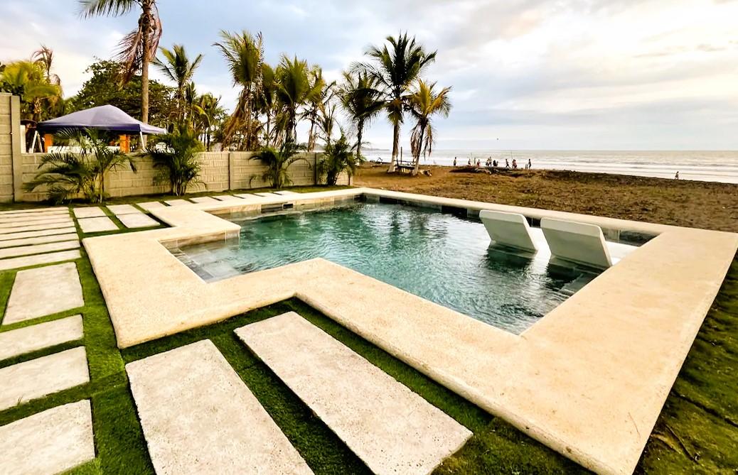 ID# 116898. Oceanfront villa for sale in Tivives, Puntarenas, 300 sqm construction, 800 sqm land, 4 bedrooms, 4 baths, US$695.000. Discover the pinnacle of coastal living with this remarkable beachfront villa nestled Tivives beach, Puntarenas. A true masterpiece of contemporary architecture, this stunning property is now available for those seeking the ultimate beachfront lifestyle. Crafted with impeccable attention to detail, this villa offers an unrivaled living experience that seamlessly blends elegance with the tranquility of the ocean waves. Step onto your private oasis, where the golden sands of Tivives Beach meet the azure expanse of the Pacific Ocean. Unmatched in its proximity, this villa offers direct access to the beach, inviting you to relish in the sheer joy of coastal living. As the sun dips below the horizon, the sky paints an enchanting tapestry of colors, transforming your outdoor space into a front-row seat to nature's mesmerizing spectacle. This villa was built in 2022, and its design boasts a two-story layout that embraces an airy open floor plan. You'll find sleek tile flooring that leads you through the spacious interior, where high ceilings create an atmosphere of grandeur. The villa is adorned with modern furnishings that effortlessly complement the coastal surroundings. Indulge your culinary desires in the fully equipped modern kitchen adorned with luxurious quartz countertops. The natural light that pours in through the expansive windows illuminates the space, creating an ambiance that is as inviting as it is inspiring. For those who appreciate the art of grilling, a built-in charcoal barbecue grill awaits your culinary creativity. Embrace the serenity of oceanfront living with a private pool that captures the essence of indulgence. Overlooking the ocean, the pool area becomes a haven of relaxation where you can soak in the sun's warmth, refresh yourself in the crystal-clear waters, and rinse off under the outdoor shower. Nestled beside a biological reserve forest, this villa offers a unique vantage point to witness the wonders of Costa Rica's diverse ecosystem. Wake up to the melodies of exotic birds, spot capuchin monkeys swinging through the trees, and be captivated by the vibrancy of scarlet macaws. This setting allows you to reconnect with nature and embrace the tranquil rhythm of life on the coast. Your peace of mind is of utmost importance. The villa is equipped with ADT+ outdoor CCTV, ensuring a secure and protected environment. Stay connected with high-speed fiber optic WiFi and unwind with cable TV options that cater to your entertainment preferences. Embrace the laid-back charm of Tivives, where unpaved roads wind through a rural neighborhood that captures the authentic essence of Costa Rican living. Just a short drive from SJO airport in San Jose, the journey to this coastal haven is as picturesque as the destination itself. The tranquility of the surroundings is complemented by 24-hour community security patrol and private on-site parking. With 4 bedrooms and 4 bathrooms, this villa offers ample space to accommodate your family and friends. Two cabanas on the property provide additional lodging options, each featuring a kitchenette and bathroom. This flexibility ensures that every guest enjoys the utmost comfort and privacy. For those who seek adventure, the barreling waves of Tivives Beach present an irresistible call to surfers of all levels. Indulge in the exhilarating thrill of riding the waves, knowing that your beachfront haven awaits your return.