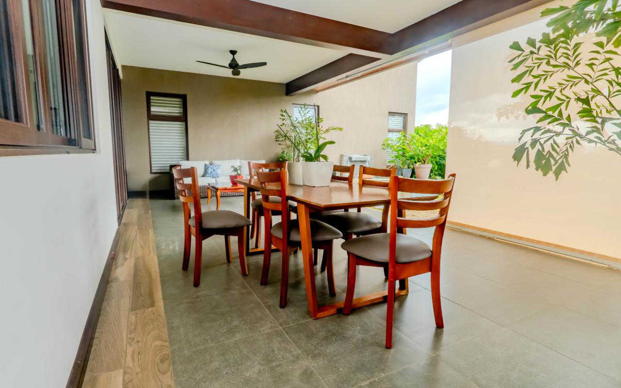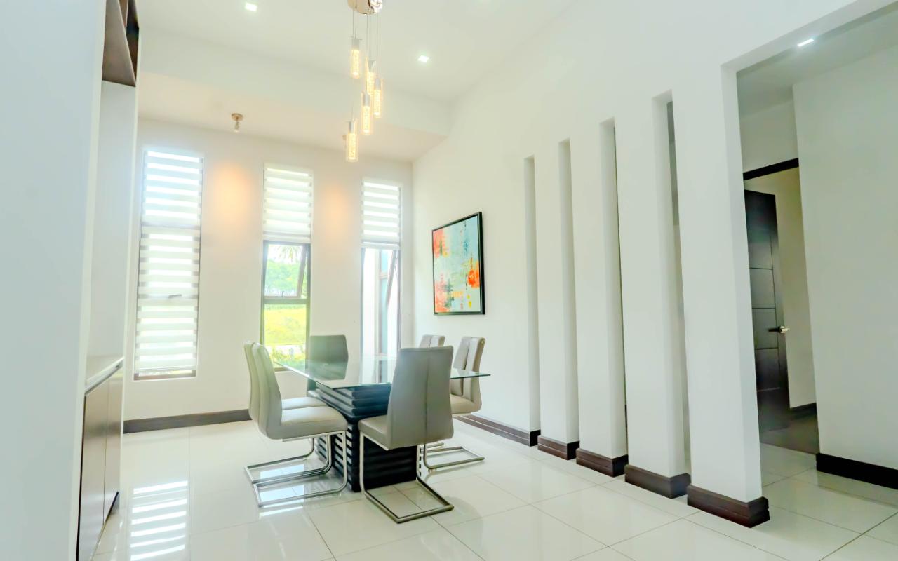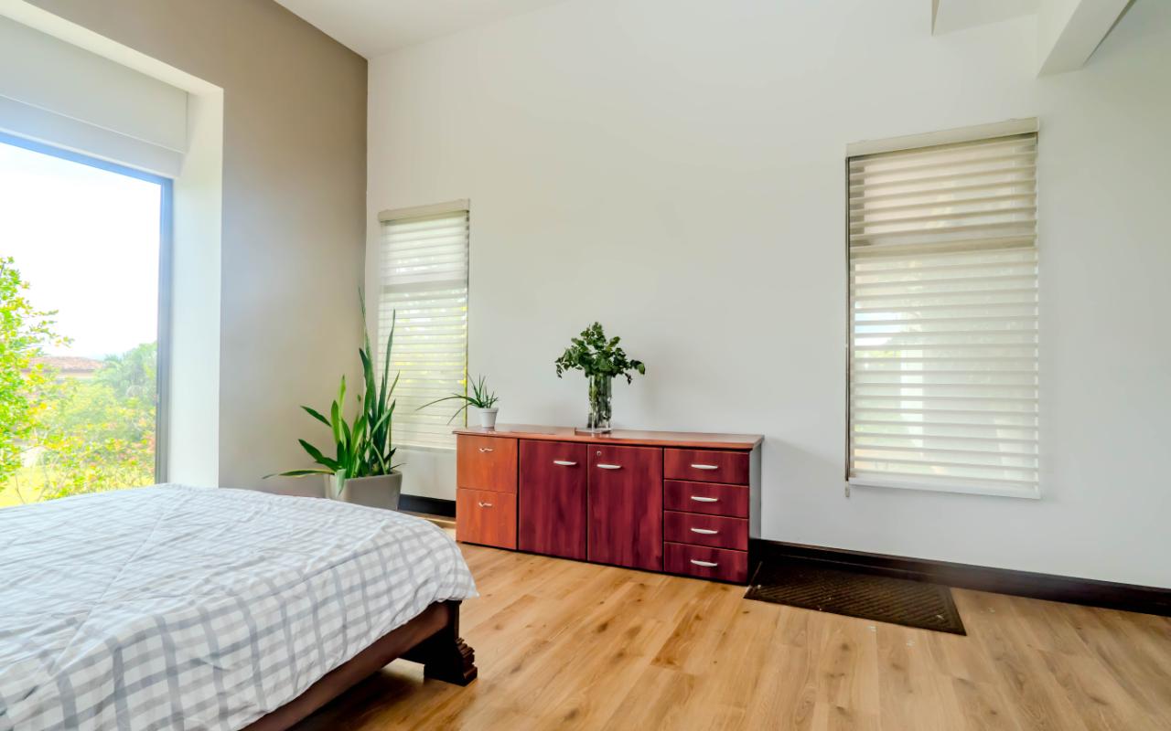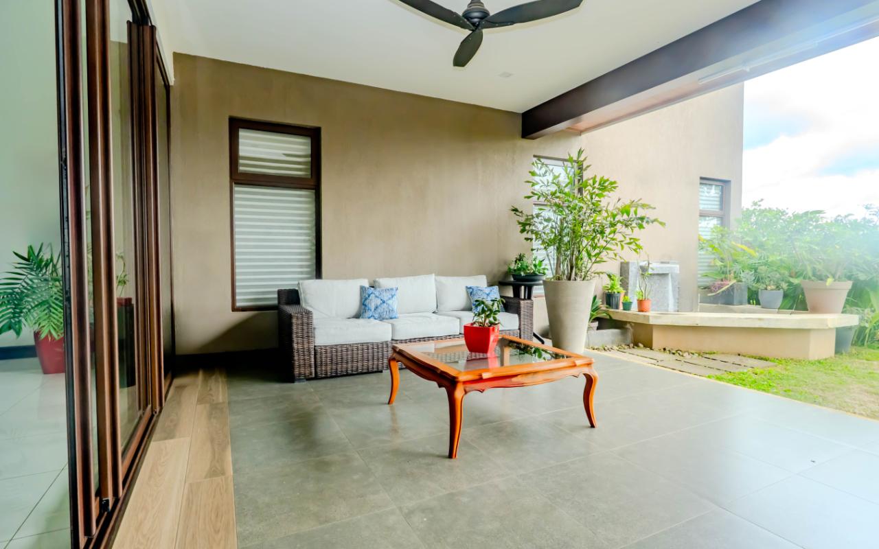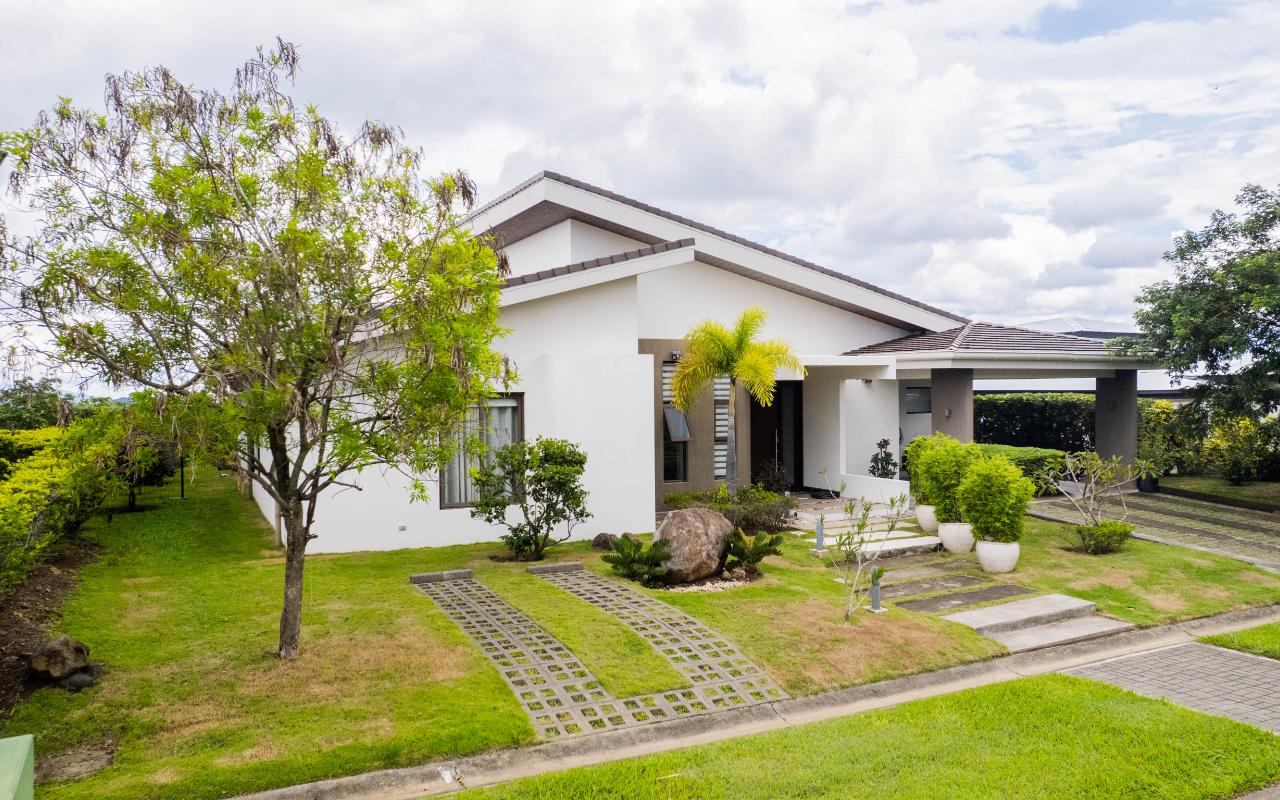 ID# 117392. Home for Sale in Hacienda Los Reyes, La Guácima. 4 bedrooms, 4.5 bathrooms, 367 m² of construction, 881 m² of land, US $720,000. Located in one of the most exclusive residential communities in the western Central Valley, this single-level residence in Hacienda Los Reyes, La Guácima, blends contemporary architecture with luxury finishes and a functional layout designed for those who prioritize comfort, elegance, and quality of life. Designed with a focus on spaciousness and seamless connectivity, the home features 4 bedrooms and 4.5 bathrooms, integrating premium details throughout and offering a residential experience of the highest standard. From the entrance, the home impresses with 3-meter-high ceilings and double-height spaces in the living room, dining room, and master bedroom, creating a fresh and airy atmosphere flooded with natural light. European-style glass windows and doors, along with handcrafted cedar doors and baseboards, elevate the aesthetic and structural quality. Social areas feature high-traffic porcelain floors, while bedrooms are fitted with German waterproof laminate flooring, combining durability with refined design. The master suite is a private retreat with its own deck, air conditioning, electric curtains, spacious walk-in closet, and a luxurious bathroom with jacuzzi. Each of the three additional bedrooms has its own en-suite bathroom and cross-ventilation, ensuring privacy and comfort. The TV room is large enough to serve as a secondary lounge or family room. The open-concept kitchen is one of the home’s highlights, with quartz countertops, a built-in gas stove, oven tower, dishwasher, and integrated microwave extractor for a modern, efficient culinary setup. The property also includes efficient tankless water heaters, a water catchment system with a silent hydropneumatic pump, Ethernet wiring throughout, an alarm system, smart light switches, LED lighting, ceiling fans in every room, and a fully integrated indoor laundry area. The west-facing terrace provides an open view, ideal for enjoying sunsets, outdoor dining, or simply the peace of the surroundings. Parking includes a covered garage for 2 vehicles plus space for 4 additional cars, perfect for guests or large families. Living in Hacienda Los Reyes means more than just location—it’s being part of a gated, consolidated community with 24/7 security, wide streets, lush green areas, and access to a private club with golf course, tennis courts, gym, pools, restaurants, and an equestrian track. The area is also conveniently close to top international schools like Country Day School and GSD International School, as well as supermarkets such as Auto Mercado, Vindi, and Fresh Market, with quick access to Route 27. La Guácima has seen sustained property value growth in recent years, thanks to its organized urban planning, pleasant climate, and proximity to key free-trade zones like El Coyol, making it an ideal location for executives, expat families, or anyone seeking a premium residential lifestyle with outstanding connectivity. This home in Hacienda Los Reyes not only meets high standards of design and construction but also embodies a lifestyle of comfort, smart living, and a deep connection to nature.