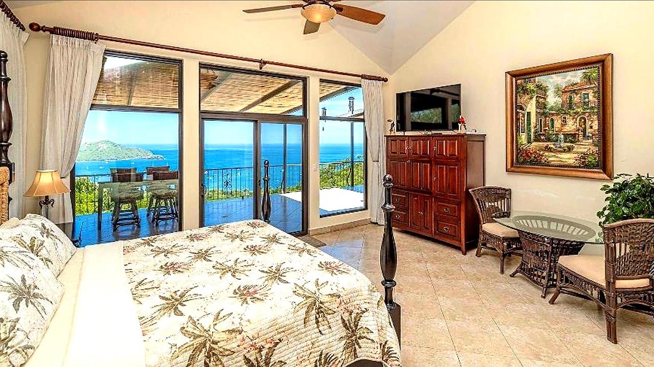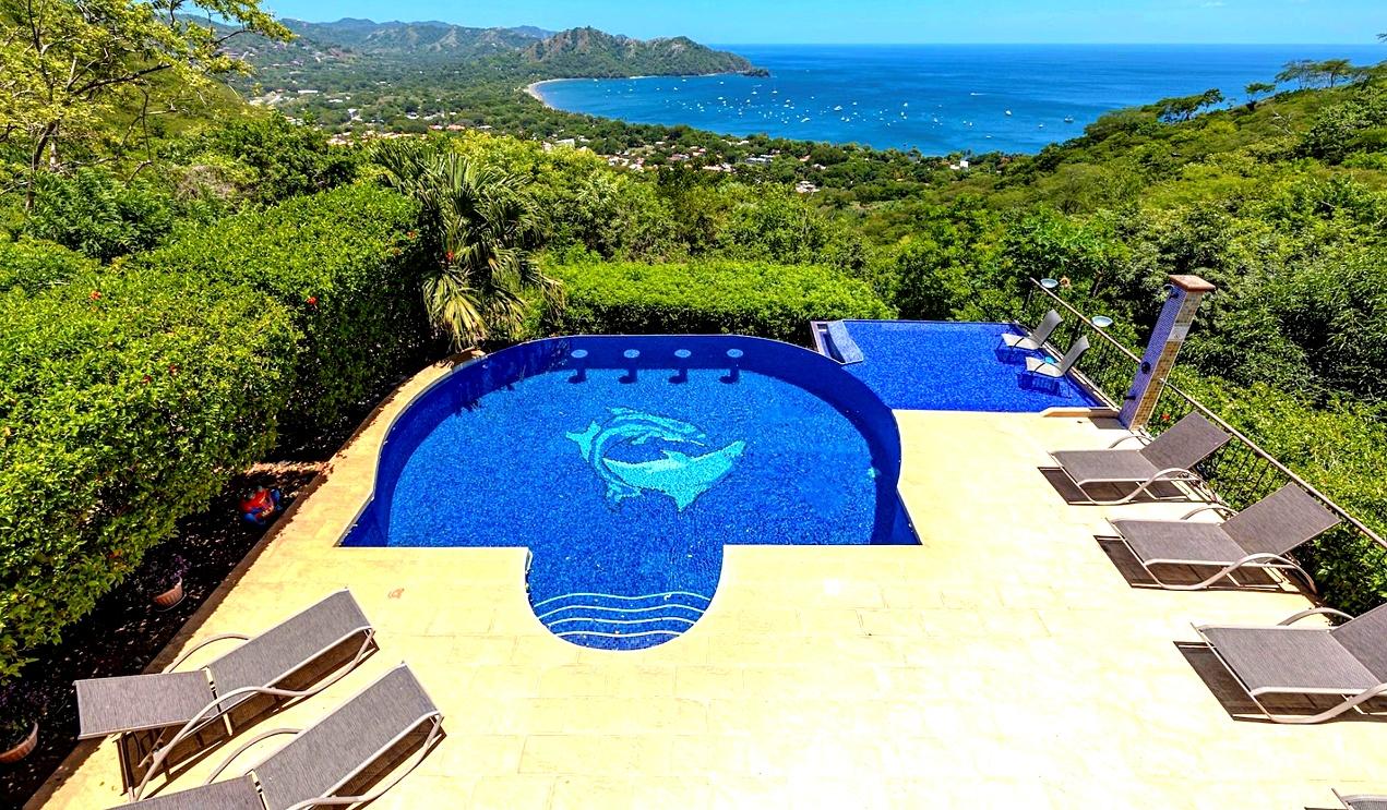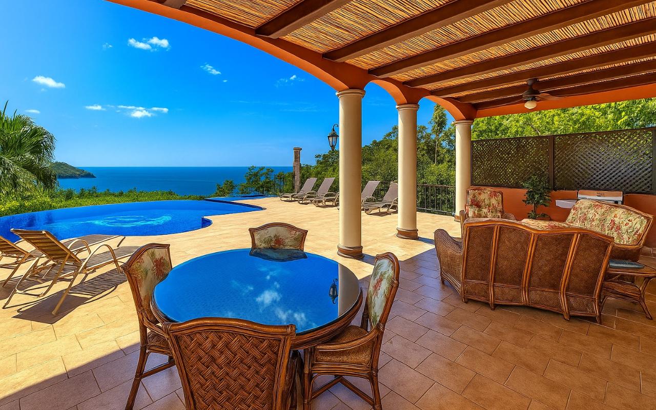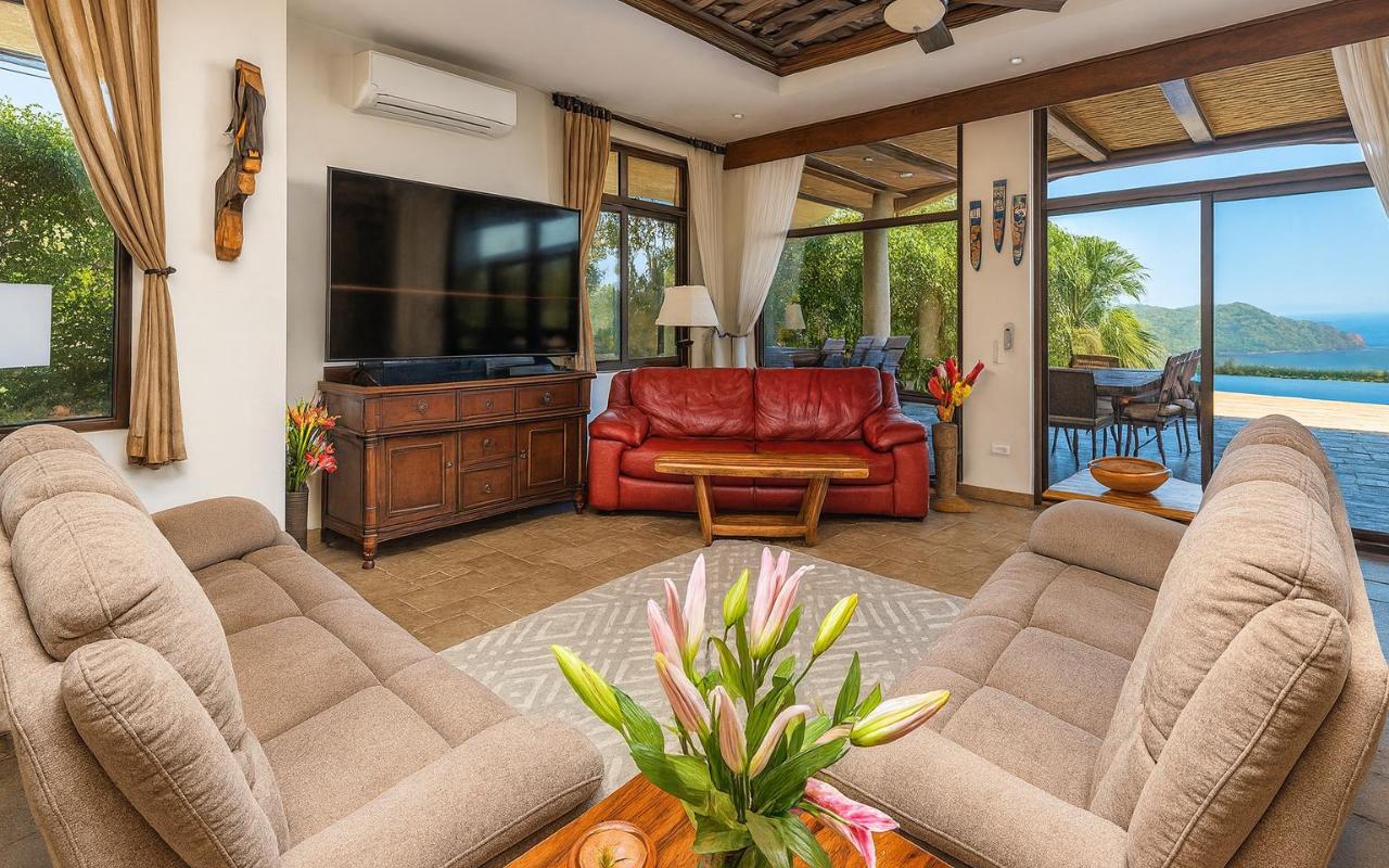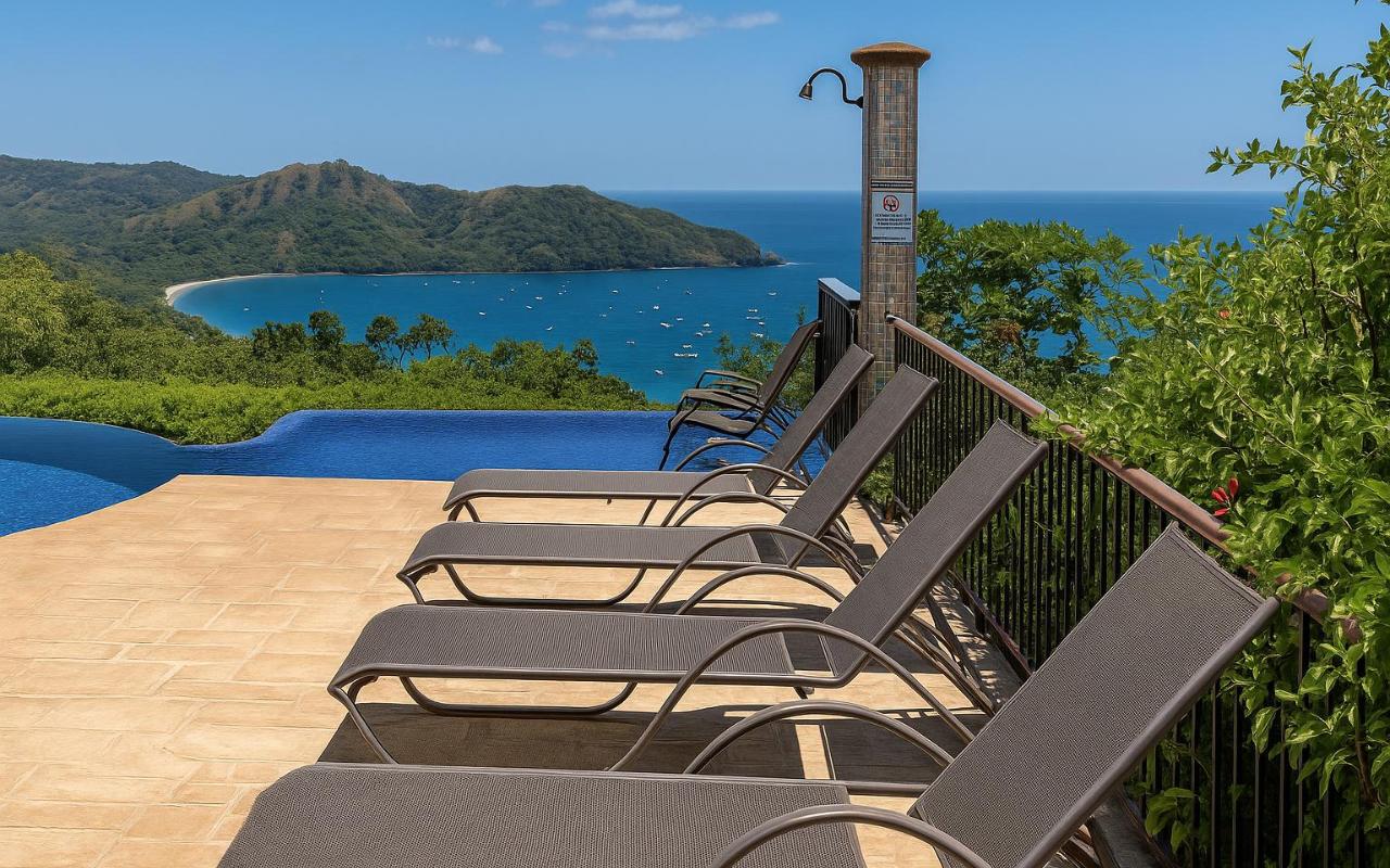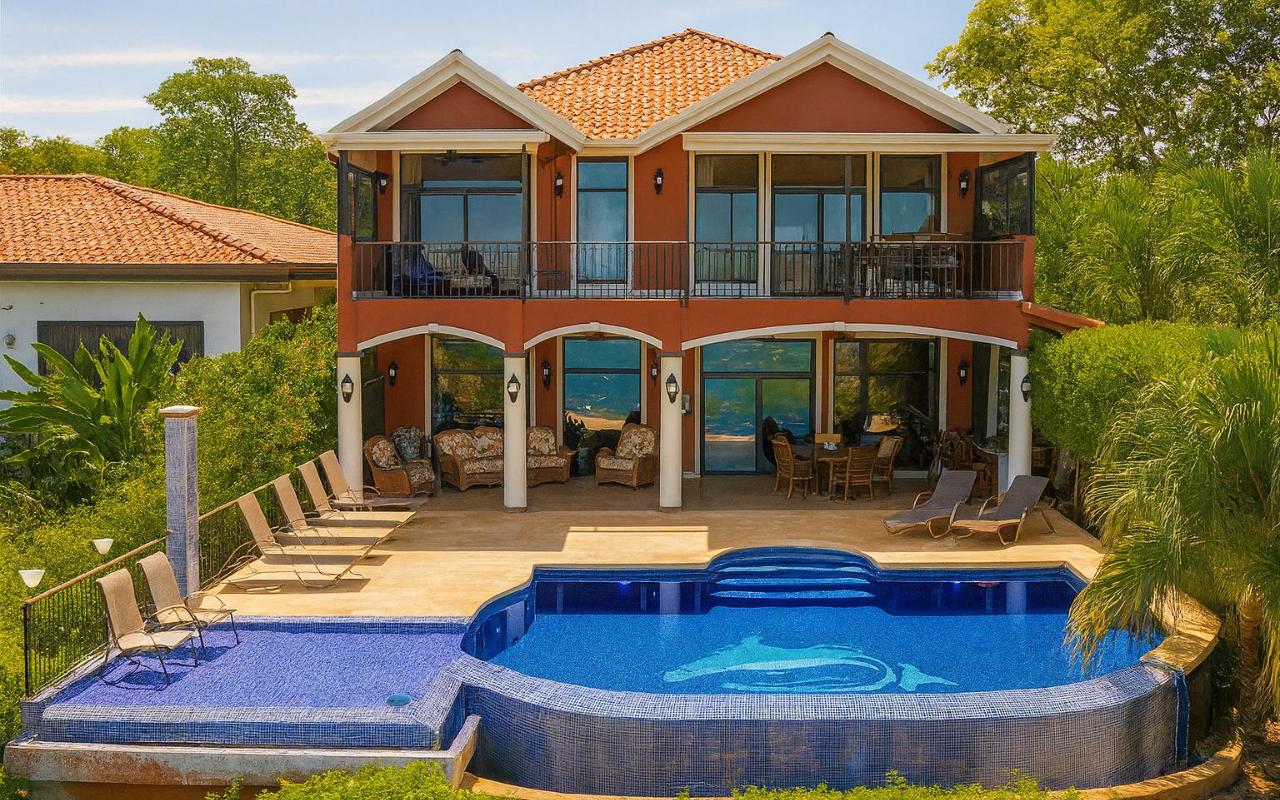 ID# 117415. Luxury villa for sale in Playas del Coco, Guanacaste. 4 bedrooms, 3.5 bathrooms, 520 m² of construction, US$1,350,000. Experience the essence of coastal living in this stunning residence set on a 560 m² lot within the exclusive Los Altos del Cacique community, renowned for its breathtaking views of the Pacific Ocean and Playas del Coco. With 520 m² of construction, the property combines energy-efficient design with an impressive entrance featuring cathedral ceilings and a curved staircase that sets the tone for the home. The main social area integrates a spacious great room with a cozy living space, a chef’s kitchen with breakfast bar, and a separate dining area, all opening to a majestic covered terrace with panoramic ocean views, infinity pool, BBQ area, and wet bar—perfect for relaxation and entertaining. The first floor includes a large bedroom with sitting area and full bath, a two-car garage, laundry room, powder room, and ample pantry. Upstairs, the master suite offers a wet bar, walk-in closets, and direct access to the ocean-view terrace, while the second bedroom also enjoys terrace access and spectacular views; the third bedroom shares a full bathroom. Recent upgrades such as fresh paint, elegant curtains, modern furniture, and top-of-the-line appliances enhance the property, along with tinted windows for comfort and privacy, and a newly tiled pool with shower tower for added luxury. Ideally located just 5 minutes from the new Waldorf Astoria Papagayo, between Playas del Coco and Playa Hermosa, this home offers proximity to pristine beaches, renowned restaurants, shops, healthcare, and the convenience of Liberia International Airport.