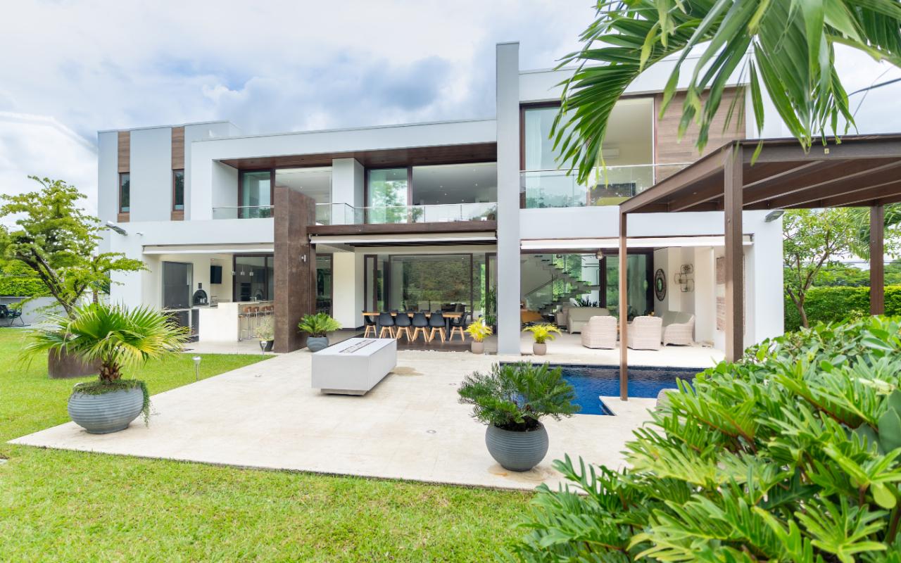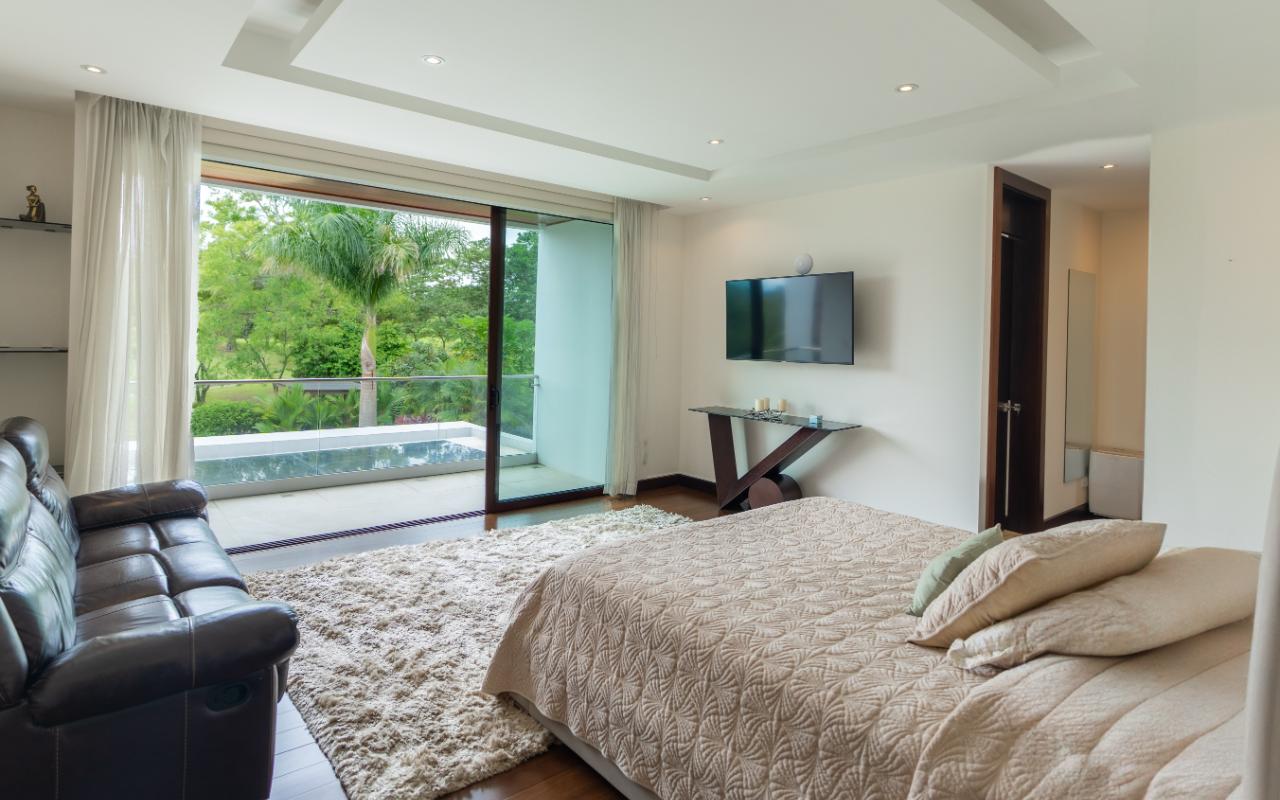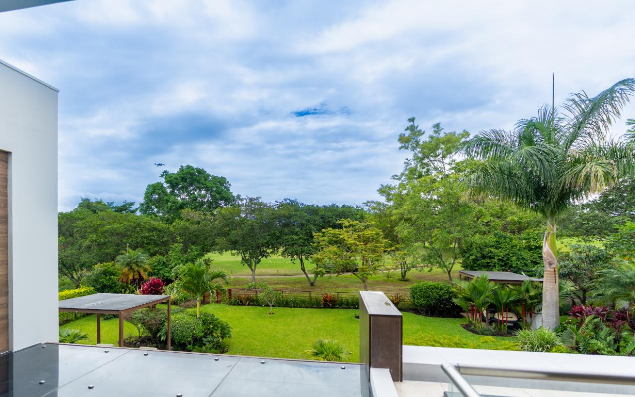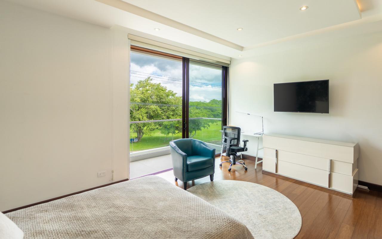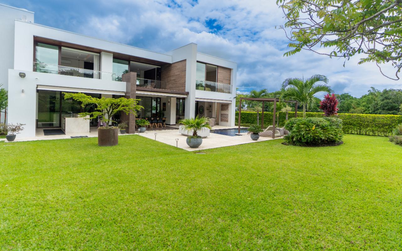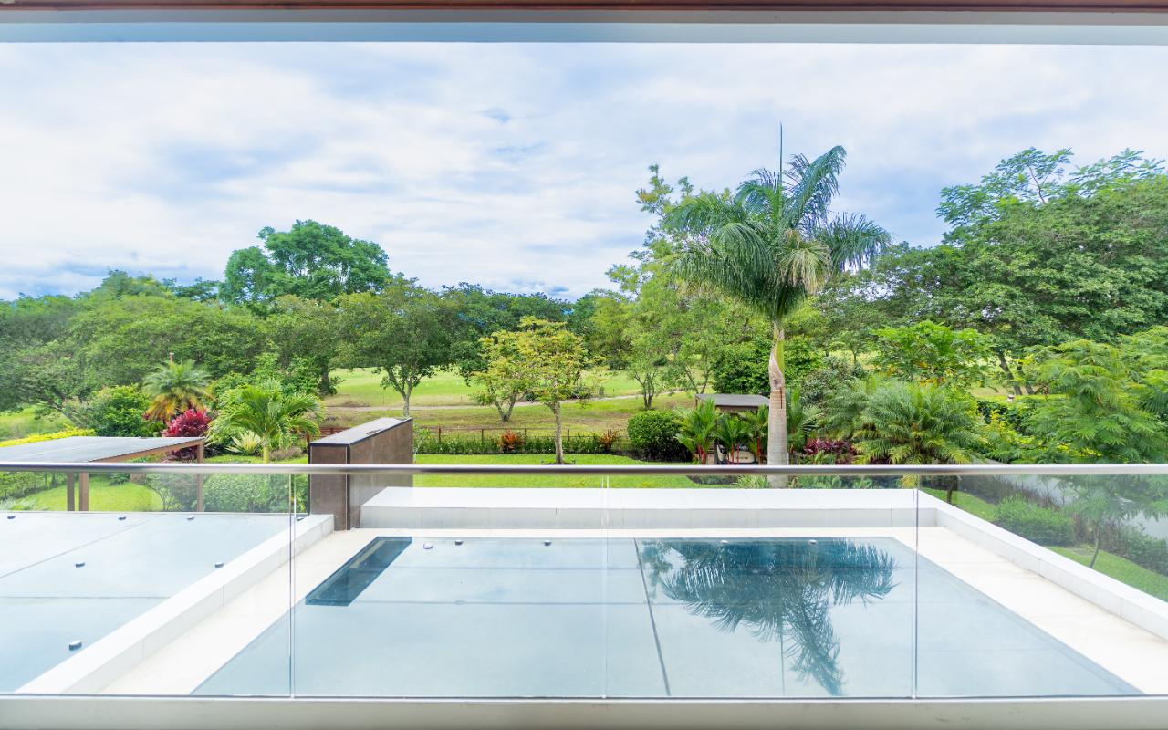 ID# 117424. Luxury home for sale in Valle del Sol Condominium, Santa Ana. 700 m² of construction, 1,320 m² of land, 4 bedrooms, 4.5 bathrooms, US $2,200,000. In Valle del Sol, the most exclusive community in Santa Ana, this contemporary residence of 700 m² on a 1,320 m² lot is presented, designed for those seeking a home that combines luxury, design, and a privileged location overlooking the golf course; upon arrival, a reflecting pool frames the entrance and sets the stage for expansive interiors where the main living room, dining area, and gourmet kitchen with island and top-of-the-line appliances flow seamlessly toward the outdoor terrace, complete with an alfresco dining and living area, BBQ station with oven, wine cooler and ice maker, solarium, and an infinity-edge pool that blends with the landscape; the first floor also includes a guest suite with walk-in closet and bathroom, service quarters, laundry room, storage, and parking for four vehicles plus a golf cart; upstairs, three en-suite bedrooms with walk-in closets ensure comfort, highlighted by the master suite featuring a spa-style bathroom with shower, double vanity, separate toilets, and private sauna, complemented by a TV lounge with balcony and panoramic views of the green; modern technology and efficiency are integrated with smart lighting, built-in audio system, and solar panels, while the community amenities elevate the lifestyle with a professional golf course, 10 tennis courts, and 24/7 security, positioning this property as one of the most exclusive and desirable residences in Santa Ana.