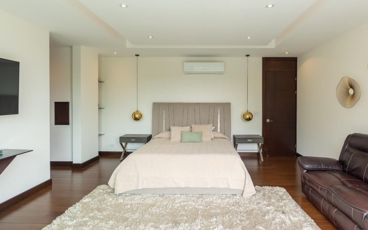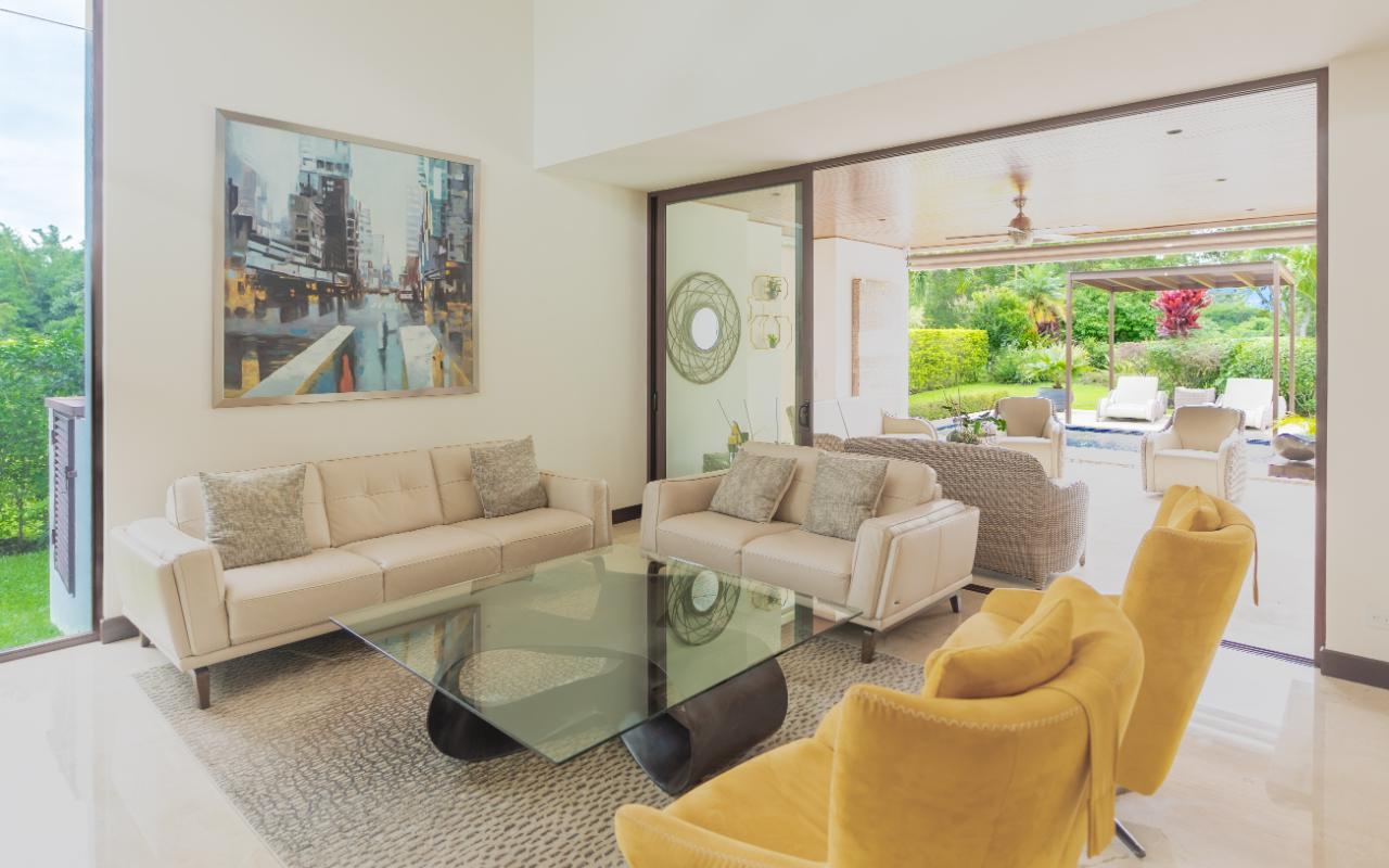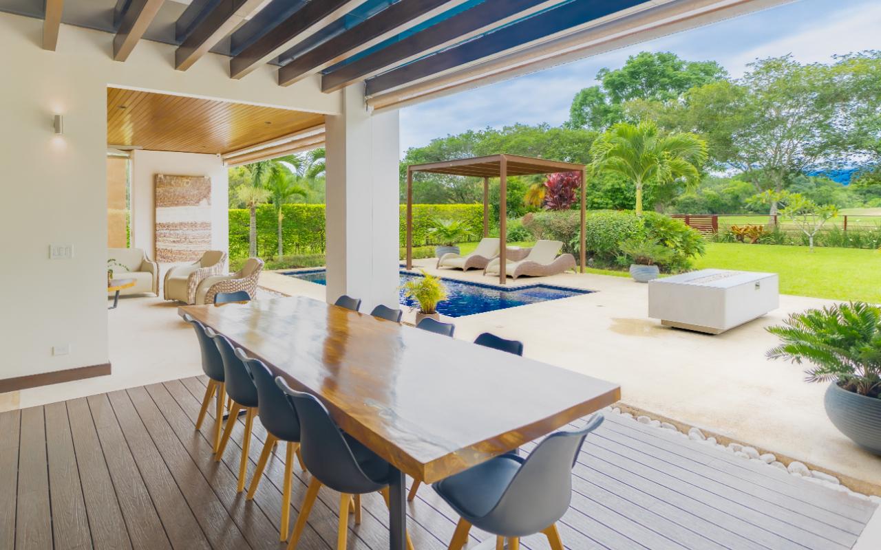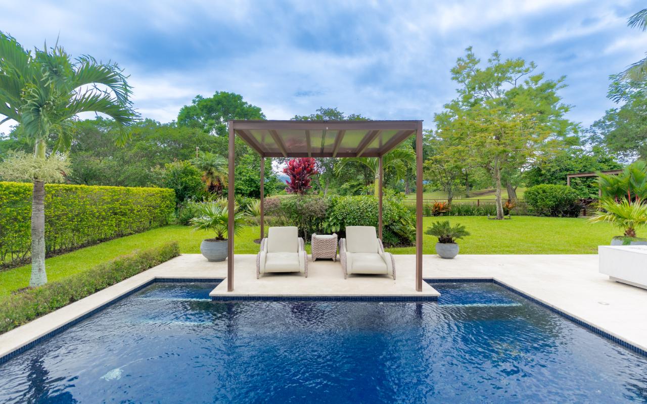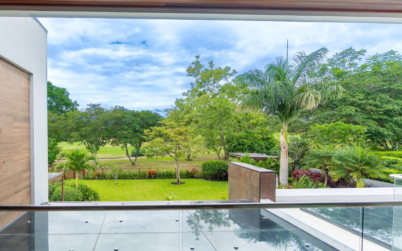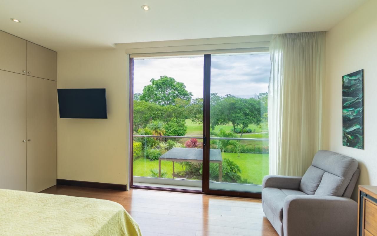 ID# 117424. Luxury home for sale in Valle del Sol Condominium, Santa Ana. 700 m² of construction, 1,320 m² of land, 4 bedrooms, 4.5 bathrooms, US $2,200,000. In Valle del Sol, the most exclusive community in Santa Ana, this contemporary residence of 700 m² on a 1,320 m² lot is presented, designed for those seeking a home that combines luxury, design, and a privileged location overlooking the golf course; upon arrival, a reflecting pool frames the entrance and sets the stage for expansive interiors where the main living room, dining area, and gourmet kitchen with island and top-of-the-line appliances flow seamlessly toward the outdoor terrace, complete with an alfresco dining and living area, BBQ station with oven, wine cooler and ice maker, solarium, and an infinity-edge pool that blends with the landscape; the first floor also includes a guest suite with walk-in closet and bathroom, service quarters, laundry room, storage, and parking for four vehicles plus a golf cart; upstairs, three en-suite bedrooms with walk-in closets ensure comfort, highlighted by the master suite featuring a spa-style bathroom with shower, double vanity, separate toilets, and private sauna, complemented by a TV lounge with balcony and panoramic views of the green; modern technology and efficiency are integrated with smart lighting, built-in audio system, and solar panels, while the community amenities elevate the lifestyle with a professional golf course, 10 tennis courts, and 24/7 security, positioning this property as one of the most exclusive and desirable residences in Santa Ana.