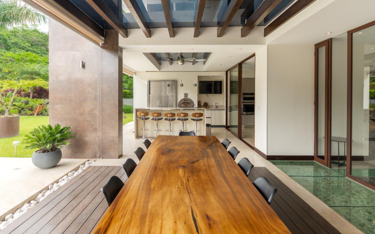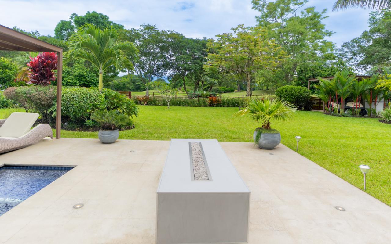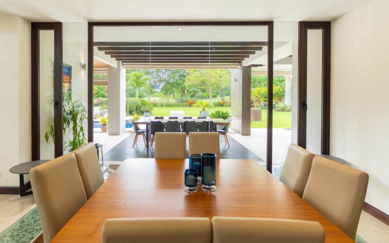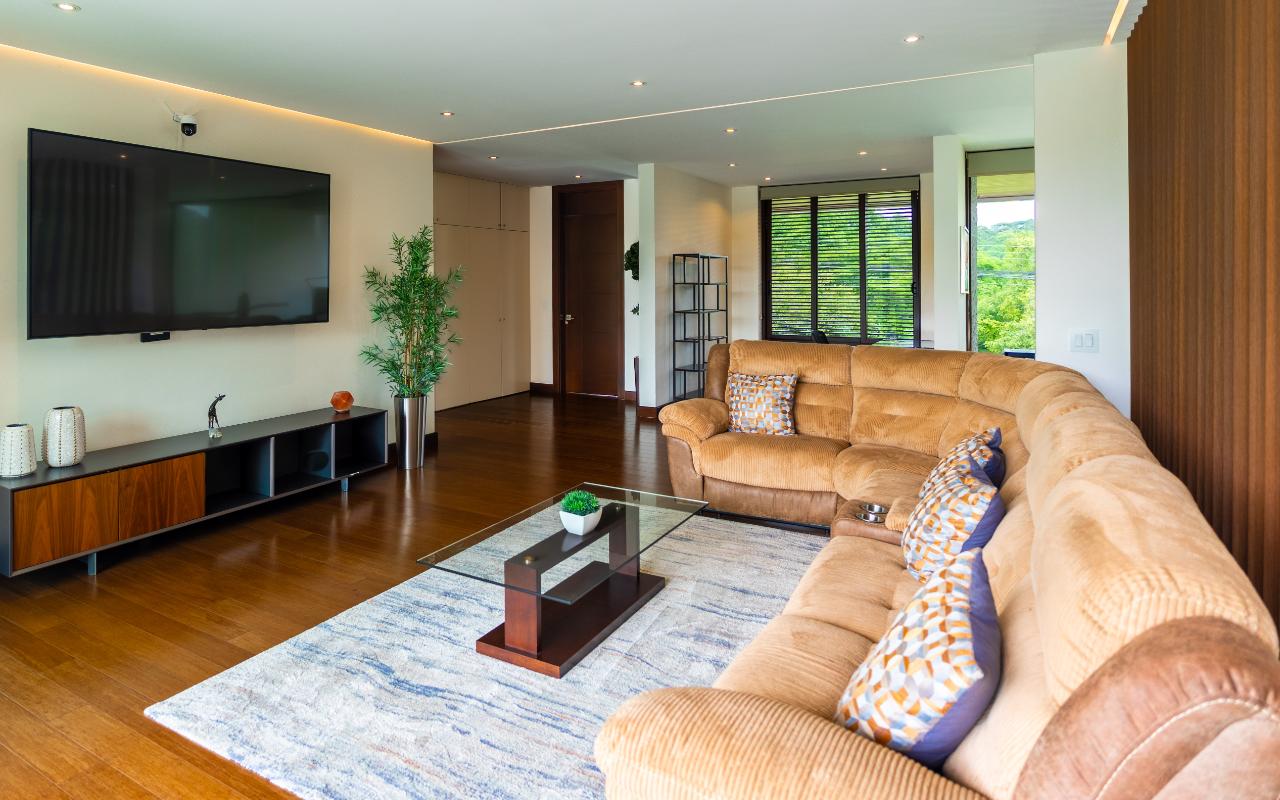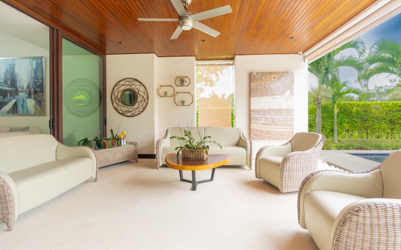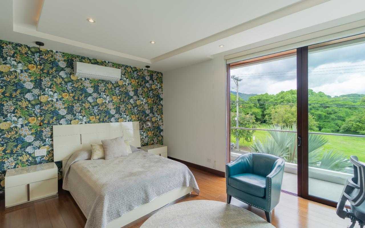ID# 117424. Luxury home for sale in Valle del Sol Condominium, Santa Ana. 700 m² of construction, 1,320 m² of land, 4 bedrooms, 4.5 bathrooms, US $2,200,000. In Valle del Sol, the most exclusive community in Santa Ana, this contemporary residence of 700 m² on a 1,320 m² lot is presented, designed for those seeking a home that combines luxury, design, and a privileged location overlooking the golf course; upon arrival, a reflecting pool frames the entrance and sets the stage for expansive interiors where the main living room, dining area, and gourmet kitchen with island and top-of-the-line appliances flow seamlessly toward the outdoor terrace, complete with an alfresco dining and living area, BBQ station with oven, wine cooler and ice maker, solarium, and an infinity-edge pool that blends with the landscape; the first floor also includes a guest suite with walk-in closet and bathroom, service quarters, laundry room, storage, and parking for four vehicles plus a golf cart; upstairs, three en-suite bedrooms with walk-in closets ensure comfort, highlighted by the master suite featuring a spa-style bathroom with shower, double vanity, separate toilets, and private sauna, complemented by a TV lounge with balcony and panoramic views of the green; modern technology and efficiency are integrated with smart lighting, built-in audio system, and solar panels, while the community amenities elevate the lifestyle with a professional golf course, 10 tennis courts, and 24/7 security, positioning this property as one of the most exclusive and desirable residences in Santa Ana.