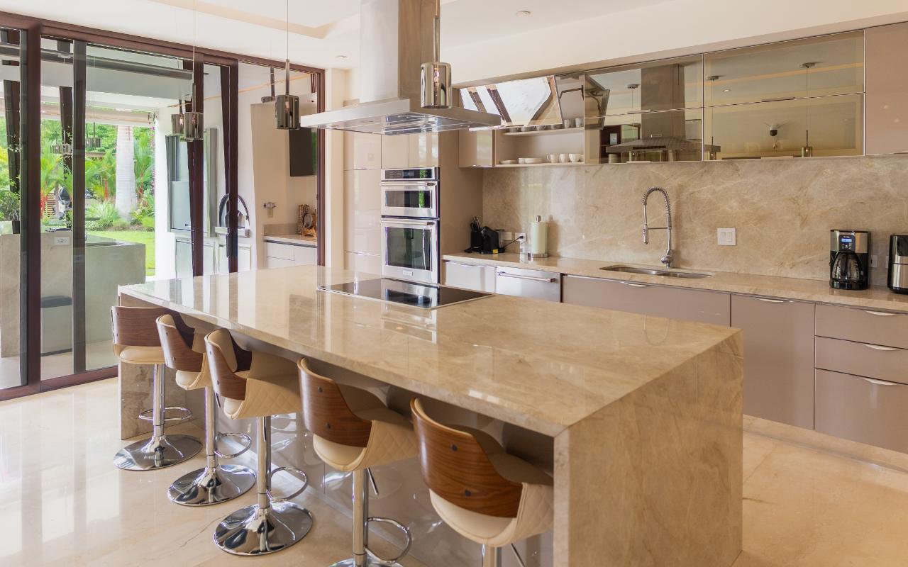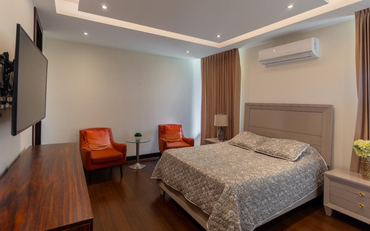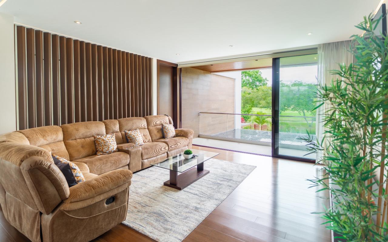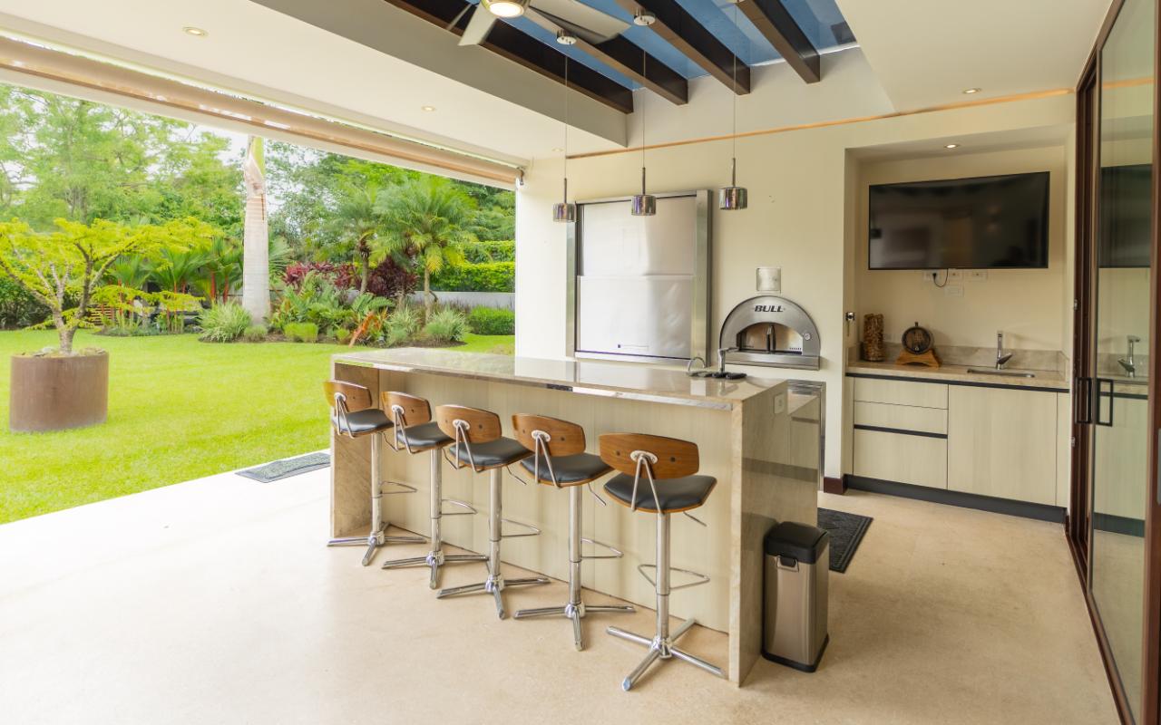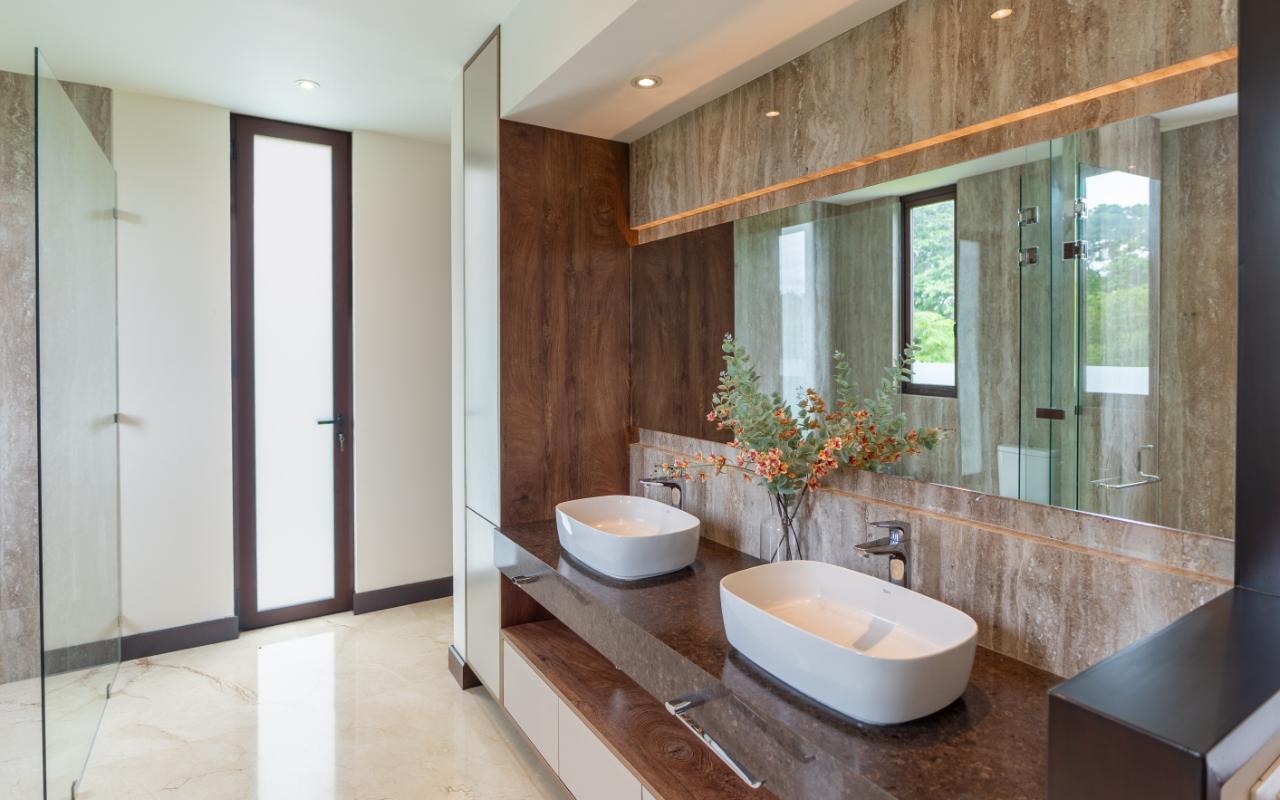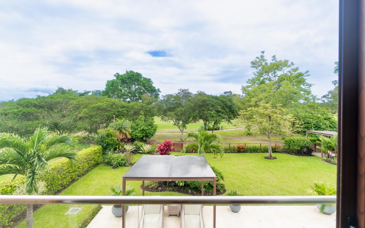 ID# 117424. Luxury home for sale in Valle del Sol Condominium, Santa Ana. 700 m² of construction, 1,320 m² of land, 4 bedrooms, 4.5 bathrooms, US $2,200,000. In Valle del Sol, the most exclusive community in Santa Ana, this contemporary residence of 700 m² on a 1,320 m² lot is presented, designed for those seeking a home that combines luxury, design, and a privileged location overlooking the golf course; upon arrival, a reflecting pool frames the entrance and sets the stage for expansive interiors where the main living room, dining area, and gourmet kitchen with island and top-of-the-line appliances flow seamlessly toward the outdoor terrace, complete with an alfresco dining and living area, BBQ station with oven, wine cooler and ice maker, solarium, and an infinity-edge pool that blends with the landscape; the first floor also includes a guest suite with walk-in closet and bathroom, service quarters, laundry room, storage, and parking for four vehicles plus a golf cart; upstairs, three en-suite bedrooms with walk-in closets ensure comfort, highlighted by the master suite featuring a spa-style bathroom with shower, double vanity, separate toilets, and private sauna, complemented by a TV lounge with balcony and panoramic views of the green; modern technology and efficiency are integrated with smart lighting, built-in audio system, and solar panels, while the community amenities elevate the lifestyle with a professional golf course, 10 tennis courts, and 24/7 security, positioning this property as one of the most exclusive and desirable residences in Santa Ana.