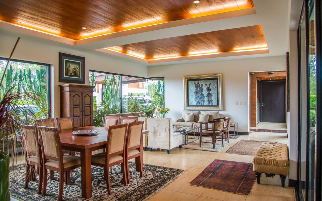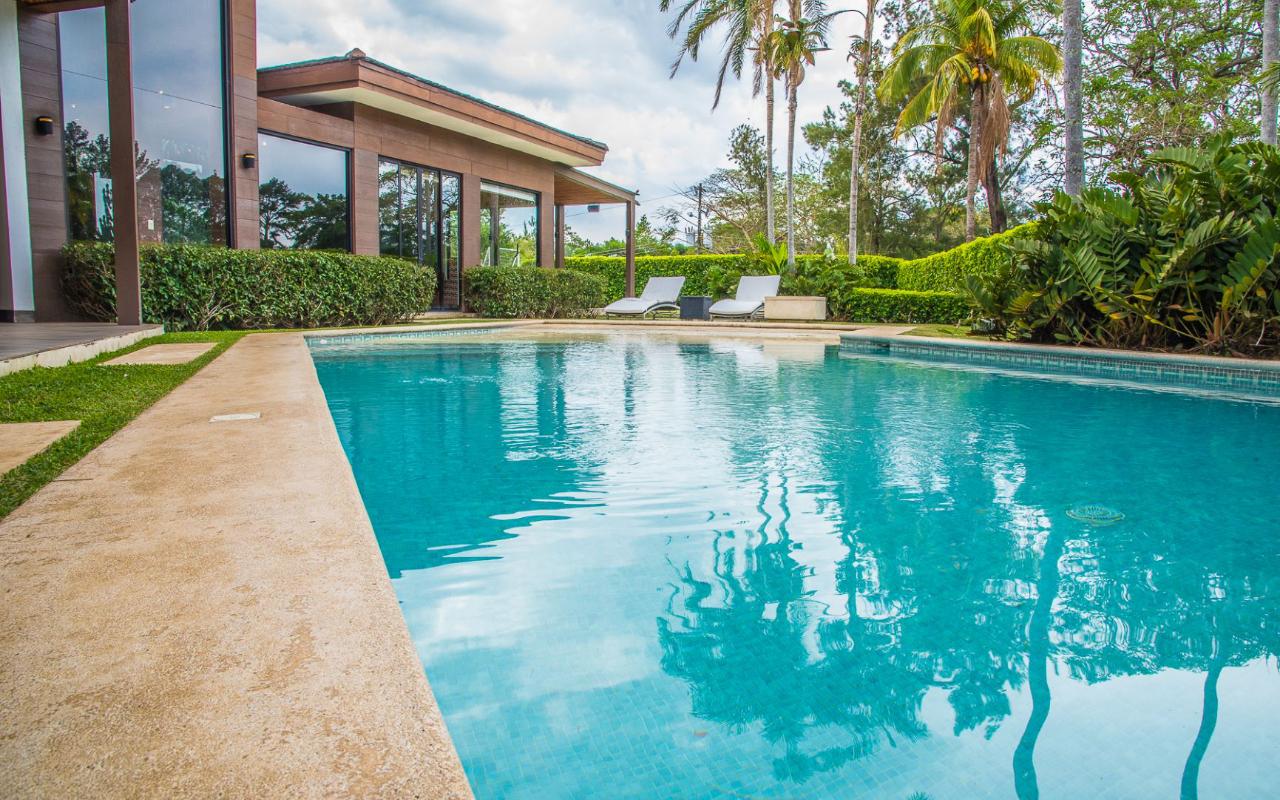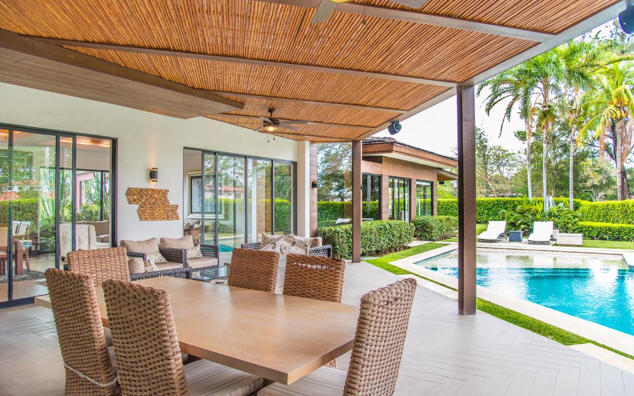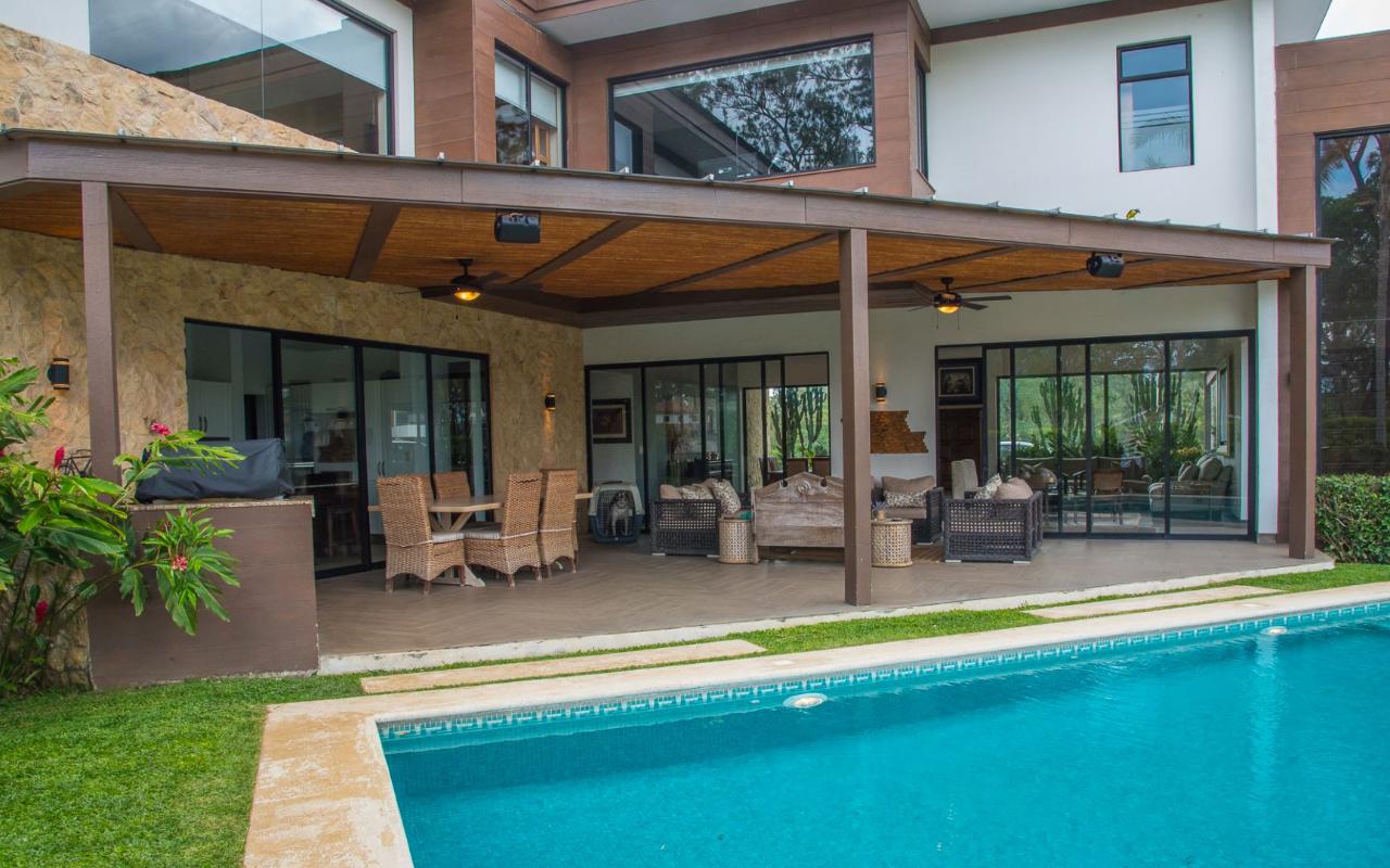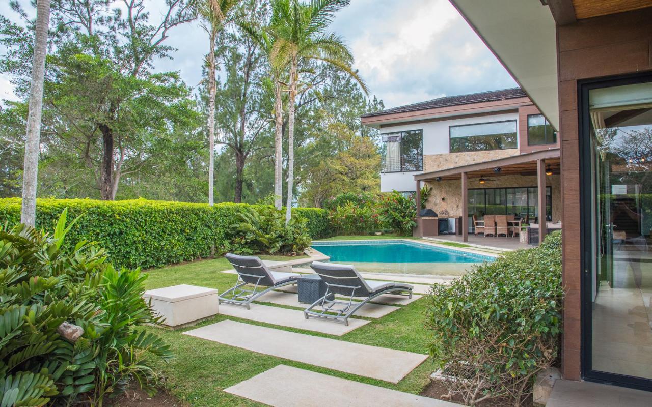 ID# 117453. House with private pool for sale in Hacienda Los Reyes, La Guácima – 5 bedrooms, 6 bathrooms, 580 m² construction, 1,205 m² land, US $945,000. This luxury home in Hacienda Los Reyes, known as Casa Golf, is a sophisticated two-story residence designed by an internationally recognized architect and conceived to maximize outdoor entertainment, comfort, and natural integration. With 580 m² of high-end construction on a 1,205 m² lot, this property stands out in La Guácima, Alajuela, for its premium finishes, modern layout, abundant natural light, and a privileged location within one of Costa Rica’s most exclusive gated communities. At the heart of the home is a spectacular private pool seamlessly connected to the main social areas, creating the perfect indoor–outdoor flow for gatherings, family events, or relaxed living. The bright living and dining areas feature large floor-to-ceiling windows, excellent cross-ventilation, and direct access to the terrace and garden. The spacious gourmet kitchen includes double-height ceilings, a central island, granite countertops, and stainless steel appliances—ideal for those seeking a modern culinary environment. The first level includes a full independent bedroom/apartment, a TV room, a dedicated office space, and a full service room. Upstairs, the private wing offers an intelligent layout that maximizes comfort, privacy, and stunning panoramic views toward Los Reyes Country Club and the golf course, elevating the residential experience of this premium property. Living in Hacienda Los Reyes provides privileged access to a world-class lifestyle with exceptional amenities: an 18-hole golf course, tennis and basketball courts, soccer field, semi-Olympic pools, gym, sauna, picnic areas, walking trails, and a beautifully designed clubhouse. The gated community also offers 24/7 security, controlled access, and a peaceful environment surrounded by nature and wide green areas. This location in La Guácima is one of the highest-demand residential zones in Costa Rica. The property is just minutes from Route 27, Automercado, private clinics, fine dining restaurants, shopping centers, and prestigious schools such as GSD International School. It is also strategically positioned 20 minutes from Juan Santamaría International Airport (SJO) and 45 minutes from the Pacific Coast, making it ideal for families, executives, and foreign buyers seeking convenience, connectivity, and high long-term value. Casa Golf represents a unique opportunity to acquire a luxury house with private pool in Hacienda Los Reyes, perfectly suited for those who appreciate exclusivity, privacy, modern architecture, and the finest lifestyle in Costa Rica real estate.