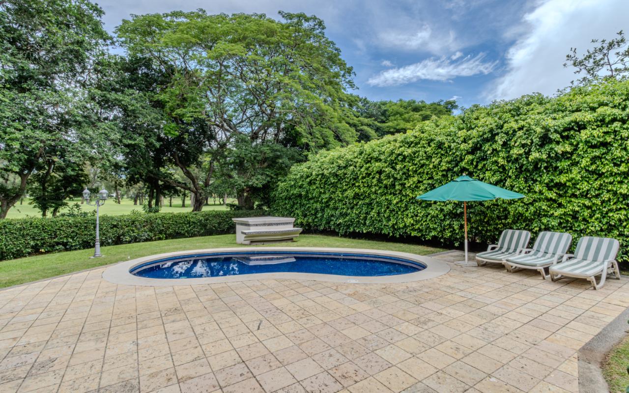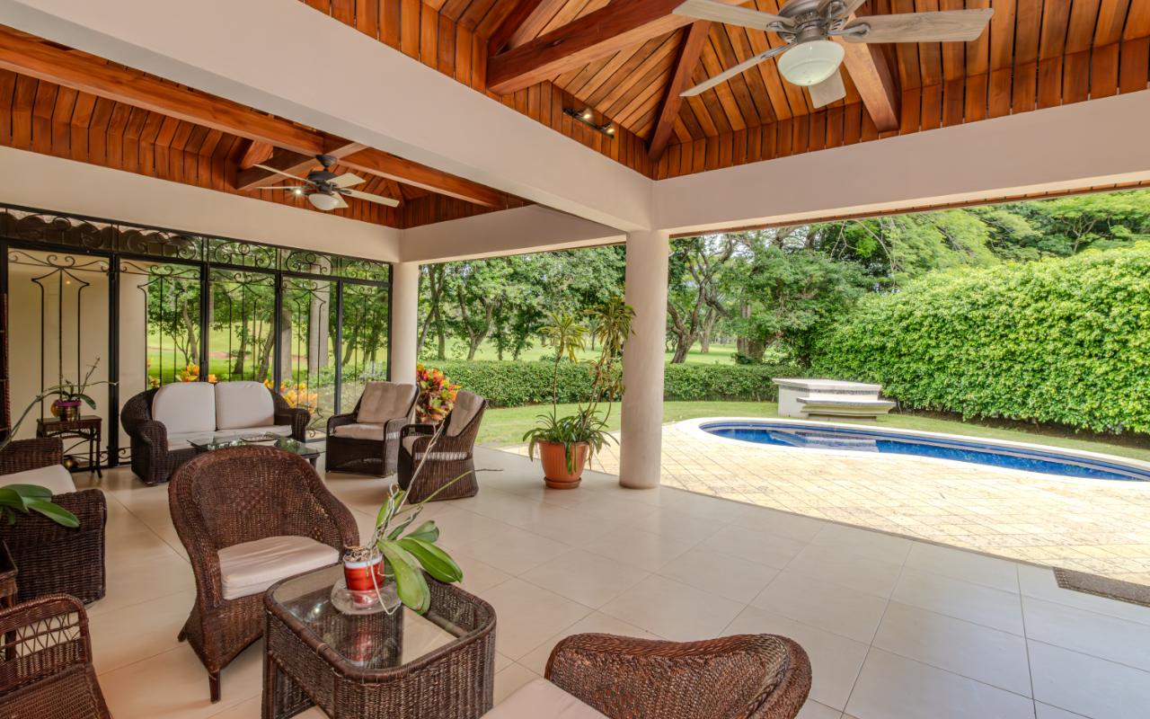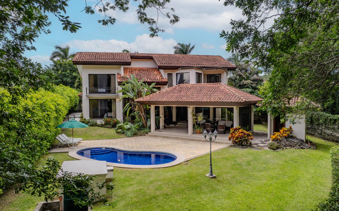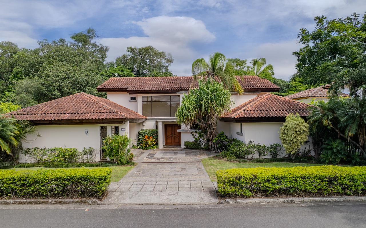 ID# 117468. Luxury House for Sale in Valle del Sol, Santa Ana • 4 Bedrooms • 5.5 Bathrooms • 460 m² Construction • 1,225 m² Land • US$1,200,000 This luxury home for sale in Valle del Sol, Santa Ana, is an exceptional residence strategically located in one of Costa Rica’s most exclusive gated golf communities, offering immediate access to top amenities, premier security, and panoramic views of the Valle del Sol golf course. With 460 m² of construction on a 1,225 m² lot, this property delivers elegance, privacy, and a lifestyle defined by comfort, nature, and convenience. Its privileged location places it just minutes from Escazú, Automercado, private clinics, business centers, international schools, outdoor recreation areas, and only 30 minutes from Juan Santamaría International Airport (SJO) and 90 minutes from the Pacific Coast. Upon entering, an impressive double-height foyer welcomes you with abundant natural light and a feeling of spaciousness that flows throughout the home. The main living room features wooden floors, soaring ceilings, and oversized windows framing serene views of the gardens, private pool, and golf course, creating a refined and tranquil atmosphere ideal for both social gatherings and daily enjoyment. Adjacent to the living room, the formal dining area provides an elegant and intimate environment, surrounded by floor-to-ceiling windows that connect directly to the terrace and outdoor social spaces. The main level includes two spacious bedrooms, each with a full bathroom, walk-in closet, and air conditioning, offering comfort and privacy for family members or guests. A multifunctional room between the bedrooms works perfectly as a TV room, office, or library, enhanced by custom woodwork that adds warmth and sophistication. The kitchen combines functionality and design, featuring high-quality cabinetry, a breakfast nook with natural ventilation, and direct access to the service area, which includes a storage room, covered drying area, and full service bedroom with closet. One of the most exceptional features of this home is the expansive covered terrace, designed for year-round enjoyment of Santa Ana’s ideal climate. With a coffered wooden ceiling, porcelain flooring, and charming ironwork details, this space offers a perfect setting for entertaining while overlooking the landscaped gardens and the golf course. Next to the terrace, a full bathroom provides additional convenience. Outdoors, the private pool creates an oasis of relaxation surrounded by nature, while a discreet utility area ensures optimal functionality. Ascending to the upper floor, a stylish staircase with wood and iron details leads to the additional bedrooms. A practical linen room provides extra storage. The third bedroom, spacious and comfortable, includes a full bathroom, air conditioning, and a private terrace overlooking the golf course. The fourth bedroom also enjoys a private terrace with peaceful views, making it an inviting retreat. The master bedroom is a true sanctuary: a large suite with walk-in closet, full bathroom with Jacuzzi, air conditioning, and its own terrace with stunning golf course views—an exclusive space designed for rest, privacy, and well-being. Additional features include covered and uncovered parking for multiple vehicles, a water storage system, three hot water tanks, and an automatic sprinkler system in the front garden, ensuring efficient maintenance of the property’s green areas. Located within the prestigious and secure Valle del Sol Golf Community in Santa Ana, this home provides exceptional accessibility to Escazú, Route 27, shopping plazas, Automercado, private clinics and hospitals, renowned restaurants, office parks, international educational centers, and the area’s best outdoor amenities. Surrounded by nature and offering direct views of the golf course, this property embodies the essence of luxury living in one of Costa Rica’s premier residential communities.