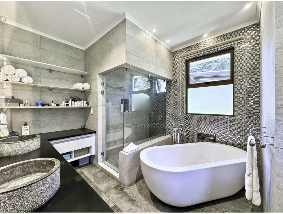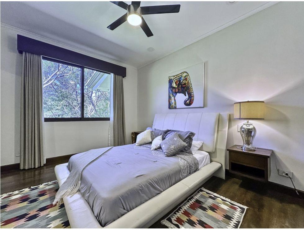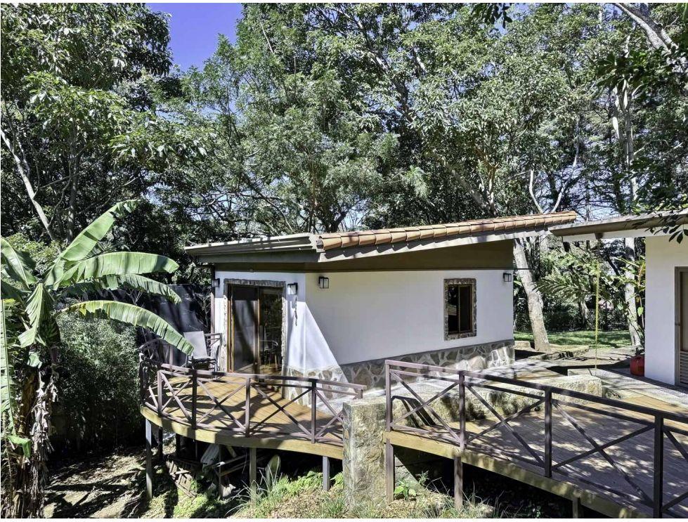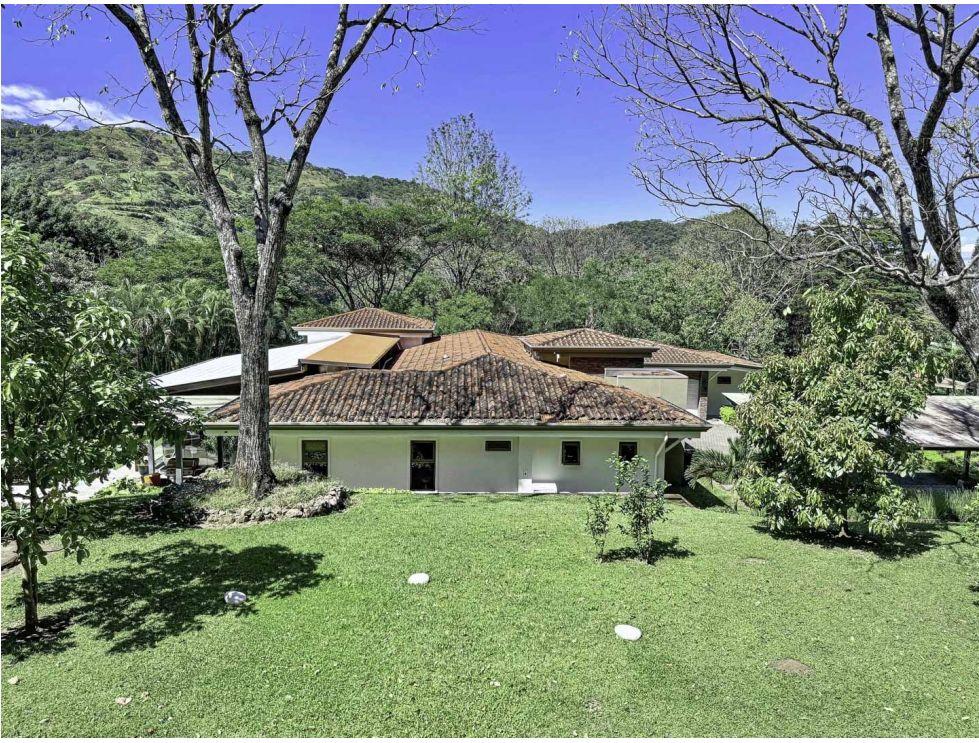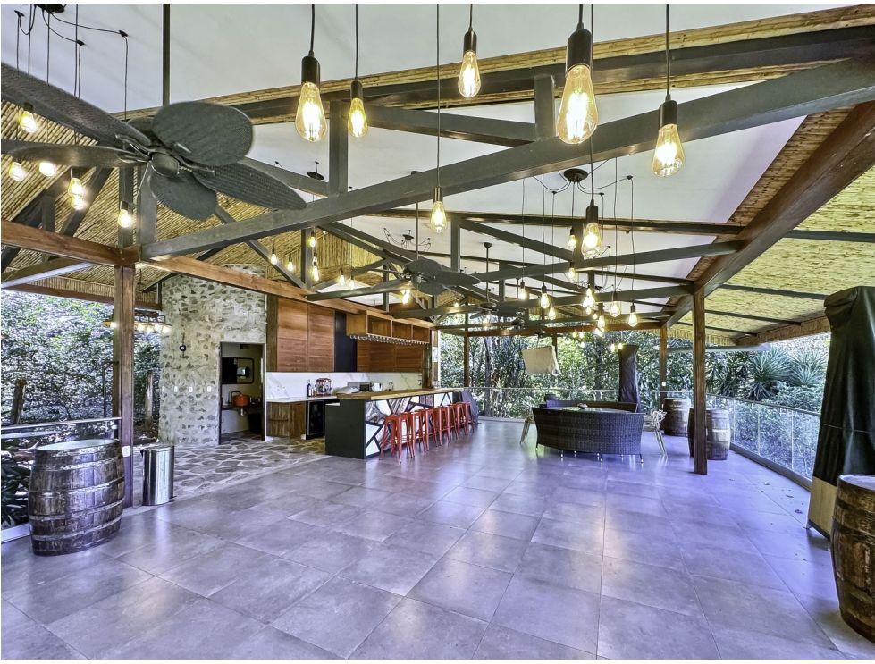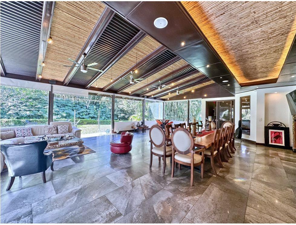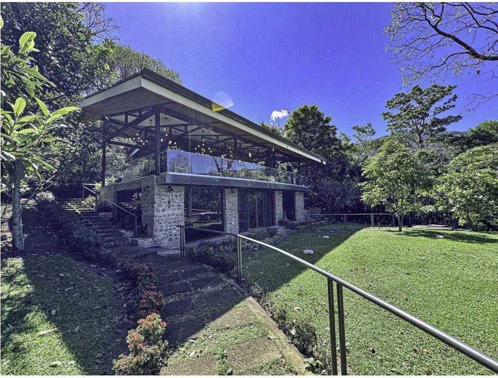 ID# 117472. Luxury One-Level Estate for Sale in Santa Ana, Costa Rica | 7,121m2 land | 1,069m2 construction | 6 bedrooms | 7 bathrooms. Oak Trees Estate is a rare one-level luxury home for sale in Santa Ana, Costa Rica set on an extraordinary 7,121 m² lot with 1,069 m² of total construction inside a quiet gated community surrounded by greenery and mountain views, yet minutes from Route 27 and the best amenities of the west side. This estate blends privacy, nature, and architectural character with immediate access to premier shopping plazas, top private schools, and leading medical centers, positioning it as a standout opportunity within the Santa Ana luxury real estate market. Conceived as a private sanctuary near the city, the property includes a four-bedroom primary residence with four full bathrooms and maid’s quarters, an independent one-bedroom cottage house, a two-level rustic-contemporary clubhouse, expansive gardens, a swimming pool, garage, and generous visitors parking, all connected by walking trails and a picturesque bridge beneath mature trees that create a truly unique lifestyle setting ideal for a primary residence, multigenerational compound, or high-value investment. From the manicured entrance and tranquil fountain, the foyer opens into spacious living and dining areas that connect naturally to a covered terrace finished with wood beams, caña brava ceilings, and tempered glass enclosures. Large glass doors flood the interiors with natural light and reveal an extensive garden with lounge and play areas framed by mature trees, where the pool, fire pit, and outdoor Jacuzzi create a perfect environment for entertaining or relaxing in total privacy. The chef’s kitchen flows into a TV lounge defined by dramatic high ceilings, designer lighting, and a glass-enclosed wine cellar, while refined finishes throughout the home include marble social floors, porcelain terrace floors, wood bedroom floors, granite countertops, stone accent walls, crown molding, central air conditioning, interior and exterior audio systems, and a practical laundry area designed for daily convenience without compromising elegance. The primary bedroom suite offers generous proportions and opens to a covered patio with Jacuzzi, incorporating a sitting area, walk-in closet, and spa-style bathroom with soaking tub, walk-in shower, and dual vanities. Two secondary bedrooms overlook lush gardens and share a Jack-and-Jill bathroom, while a fourth bedroom enjoys its own en-suite bathroom and green views, creating an ideal layout for families or guests. Beyond the main residence, the two-level clubhouse enhances the estate’s versatility with a first level currently used as a game room that can easily be converted into a private apartment, and a second level featuring a kitchen, bar with Guanacaste wood countertop and onyx siding, large social area, bathroom, wood beam ceilings with caña brava, decorative lighting, and a blend of stone and porcelain finishes that make it perfect for gatherings, events, or extended stays. The independent cottage house presents a studio-style layout with porcelain floors, caña brava coffered ceiling, air conditioning, full bathroom, and sliding doors that open to a terrace, providing additional privacy for visitors, workspace potential, or rental use. Practical infrastructure includes a garage, extensive visitors parking, a large storage room, maid’s quarters with full bathroom, two water reserve tanks with a combined capacity of 14,000 liters, and pre-installed piping for solar panels. Located minutes from the prestigious Valle del Sol Golf Course and lifestyle destinations such as City Place Santa Ana, Plaza Momentum Lindora, Terrazas Lindora, and Multiplaza Escazú, Oak Trees Estate offers unmatched connectivity to Escazú, Lindora, the airport, and even the Pacific Coast, delivering the perfect balance between estate-level privacy and immediate access to the best of urban living in Costa Rica.